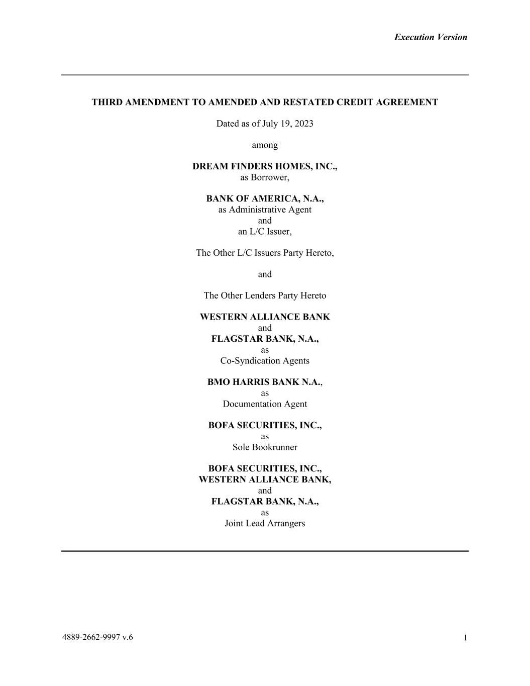 4889-2662-9997 v.6 Execution Version 1 THIRD AMENDMENT TO AMENDED AND RESTATED CREDIT AGREEMENT Dated as of July 19, 2023 among DREAM FINDERS HOMES, INC., as Borrower, BANK OF AMERICA, N.A., as Administrative Agent and an L/C Issuer, The Other L/C Issuers Party Hereto, and The Other Lenders Party Hereto WESTERN ALLIANCE BANK and FLAGSTAR BANK, N.A., as Co-Syndication Agents BMO HARRIS BANK N.A., as Documentation Agent BOFA SECURITIES, INC., as Sole Bookrunner BOFA SECURITIES, INC., WESTERN ALLIANCE BANK, and FLAGSTAR BANK, N.A., as Joint Lead Arrangers