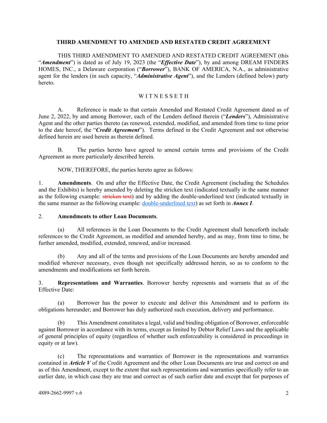 4889-2662-9997 v.6 2 THIRD AMENDMENT TO AMENDED AND RESTATED CREDIT AGREEMENT THIS THIRD AMENDMENT TO AMENDED AND RESTATED CREDIT AGREEMENT (this “Amendment”) is dated as of July 19, 2023 (the “Effective Date”), by and among DREAM FINDERS HOMES, INC., a Delaware corporation (“Borrower”), BANK OF AMERICA, N.A., as administrative agent for the lenders (in such capacity, “Administrative Agent”), and the Lenders (defined below) party hereto. W I T N E S S E T H A. Reference is made to that certain Amended and Restated Credit Agreement dated as of June 2, 2022, by and among Borrower, each of the Lenders defined therein (“Lenders”), Administrative Agent and the other parties thereto (as renewed, extended, modified, and amended from time to time prior to the date hereof, the “Credit Agreement”). Terms defined in the Credit Agreement and not otherwise defined herein are used herein as therein defined. B. The parties hereto have agreed to amend certain terms and provisions of the Credit Agreement as more particularly described herein. NOW, THEREFORE, the parties hereto agree as follows: 1. Amendments. On and after the Effective Date, the Credit Agreement (including the Schedules and the Exhibits) is hereby amended by deleting the stricken text (indicated textually in the same manner as the following example: stricken text) and by adding the double-underlined text (indicated textually in the same manner as the following example: double-underlined text) as set forth in Annex I. 2. Amendments to other Loan Documents. (a) All references in the Loan Documents to the Credit Agreement shall henceforth include references to the Credit Agreement, as modified and amended hereby, and as may, from time to time, be further amended, modified, extended, renewed, and/or increased. (b) Any and all of the terms and provisions of the Loan Documents are hereby amended and modified wherever necessary, even though not specifically addressed herein, so as to conform to the amendments and modifications set forth herein. 3. Representations and Warranties. Borrower hereby represents and warrants that as of the Effective Date: (a) Borrower has the power to execute and deliver this Amendment and to perform its obligations hereunder; and Borrower has duly authorized such execution, delivery and performance. (b) This Amendment constitutes a legal, valid and binding obligation of Borrower, enforceable against Borrower in accordance with its terms, except as limited by Debtor Relief Laws and the applicable of general principles of equity (regardless of whether such enforceability is considered in proceedings in equity or at law). (c) The representations and warranties of Borrower in the representations and warranties contained in Article V of the Credit Agreement and the other Loan Documents are true and correct on and as of this Amendment, except to the extent that such representations and warranties specifically refer to an earlier date, in which case they are true and correct as of such earlier date and except that for purposes of