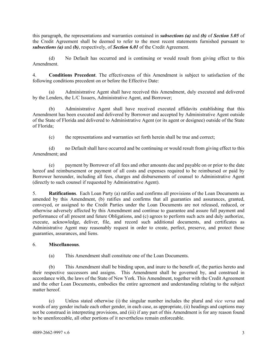 4889-2662-9997 v.6 3 this paragraph, the representations and warranties contained in subsections (a) and (b) of Section 5.05 of the Credit Agreement shall be deemed to refer to the most recent statements furnished pursuant to subsections (a) and (b), respectively, of Section 6.01 of the Credit Agreement. (d) No Default has occurred and is continuing or would result from giving effect to this Amendment. 4. Conditions Precedent. The effectiveness of this Amendment is subject to satisfaction of the following conditions precedent on or before the Effective Date: (a) Administrative Agent shall have received this Amendment, duly executed and delivered by the Lenders, the L/C Issuers, Administrative Agent, and Borrower; (b) Administrative Agent shall have received executed affidavits establishing that this Amendment has been executed and delivered by Borrower and accepted by Administrative Agent outside of the State of Florida and delivered to Administrative Agent (or its agent or designee) outside of the State of Florida; (c) the representations and warranties set forth herein shall be true and correct; (d) no Default shall have occurred and be continuing or would result from giving effect to this Amendment; and (e) payment by Borrower of all fees and other amounts due and payable on or prior to the date hereof and reimbursement or payment of all costs and expenses required to be reimbursed or paid by Borrower hereunder, including all fees, charges and disbursements of counsel to Administrative Agent (directly to such counsel if requested by Administrative Agent). 5. Ratifications. Each Loan Party (a) ratifies and confirms all provisions of the Loan Documents as amended by this Amendment, (b) ratifies and confirms that all guaranties and assurances, granted, conveyed, or assigned to the Credit Parties under the Loan Documents are not released, reduced, or otherwise adversely affected by this Amendment and continue to guarantee and assure full payment and performance of all present and future Obligations, and (c) agrees to perform such acts and duly authorize, execute, acknowledge, deliver, file, and record such additional documents, and certificates as Administrative Agent may reasonably request in order to create, perfect, preserve, and protect those guaranties, assurances, and liens. 6. Miscellaneous. (a) This Amendment shall constitute one of the Loan Documents. (b) This Amendment shall be binding upon, and inure to the benefit of, the parties hereto and their respective successors and assigns. This Amendment shall be governed by, and construed in accordance with, the laws of the State of New York. This Amendment, together with the Credit Agreement and the other Loan Documents, embodies the entire agreement and understanding relating to the subject matter hereof. (c) Unless stated otherwise (i) the singular number includes the plural and vice versa and words of any gender include each other gender, in each case, as appropriate, (ii) headings and captions may not be construed in interpreting provisions, and (iii) if any part of this Amendment is for any reason found to be unenforceable, all other portions of it nevertheless remain enforceable.
