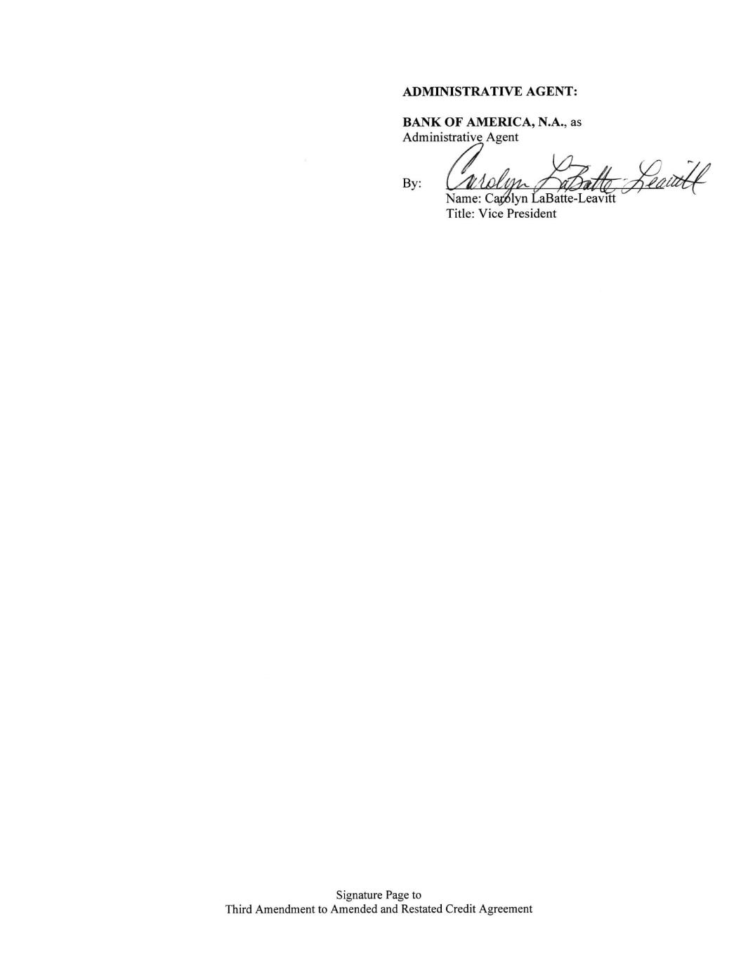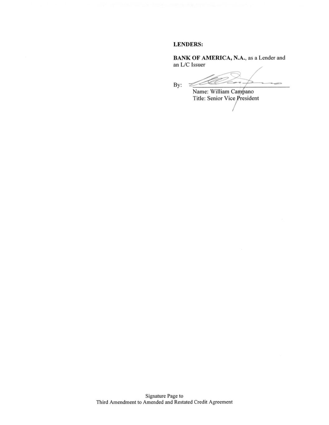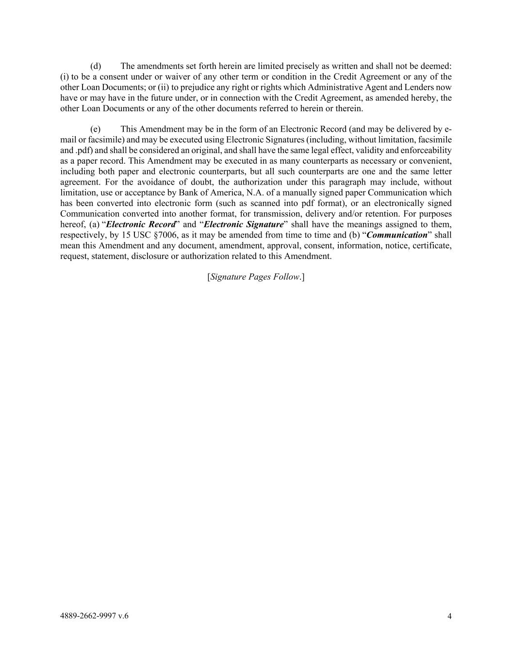 4889-2662-9997 v.6 4 (d) The amendments set forth herein are limited precisely as written and shall not be deemed: (i) to be a consent under or waiver of any other term or condition in the Credit Agreement or any of the other Loan Documents; or (ii) to prejudice any right or rights which Administrative Agent and Lenders now have or may have in the future under, or in connection with the Credit Agreement, as amended hereby, the other Loan Documents or any of the other documents referred to herein or therein. (e) This Amendment may be in the form of an Electronic Record (and may be delivered by e- mail or facsimile) and may be executed using Electronic Signatures (including, without limitation, facsimile and .pdf) and shall be considered an original, and shall have the same legal effect, validity and enforceability as a paper record. This Amendment may be executed in as many counterparts as necessary or convenient, including both paper and electronic counterparts, but all such counterparts are one and the same letter agreement. For the avoidance of doubt, the authorization under this paragraph may include, without limitation, use or acceptance by Bank of America, N.A. of a manually signed paper Communication which has been converted into electronic form (such as scanned into pdf format), or an electronically signed Communication converted into another format, for transmission, delivery and/or retention. For purposes hereof, (a) “Electronic Record” and “Electronic Signature” shall have the meanings assigned to them, respectively, by 15 USC §7006, as it may be amended from time to time and (b) “Communication” shall mean this Amendment and any document, amendment, approval, consent, information, notice, certificate, request, statement, disclosure or authorization related to this Amendment. [Signature Pages Follow.]