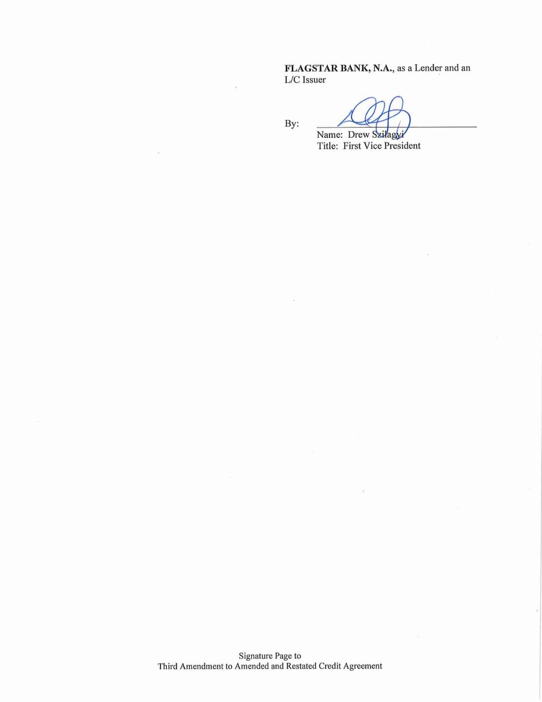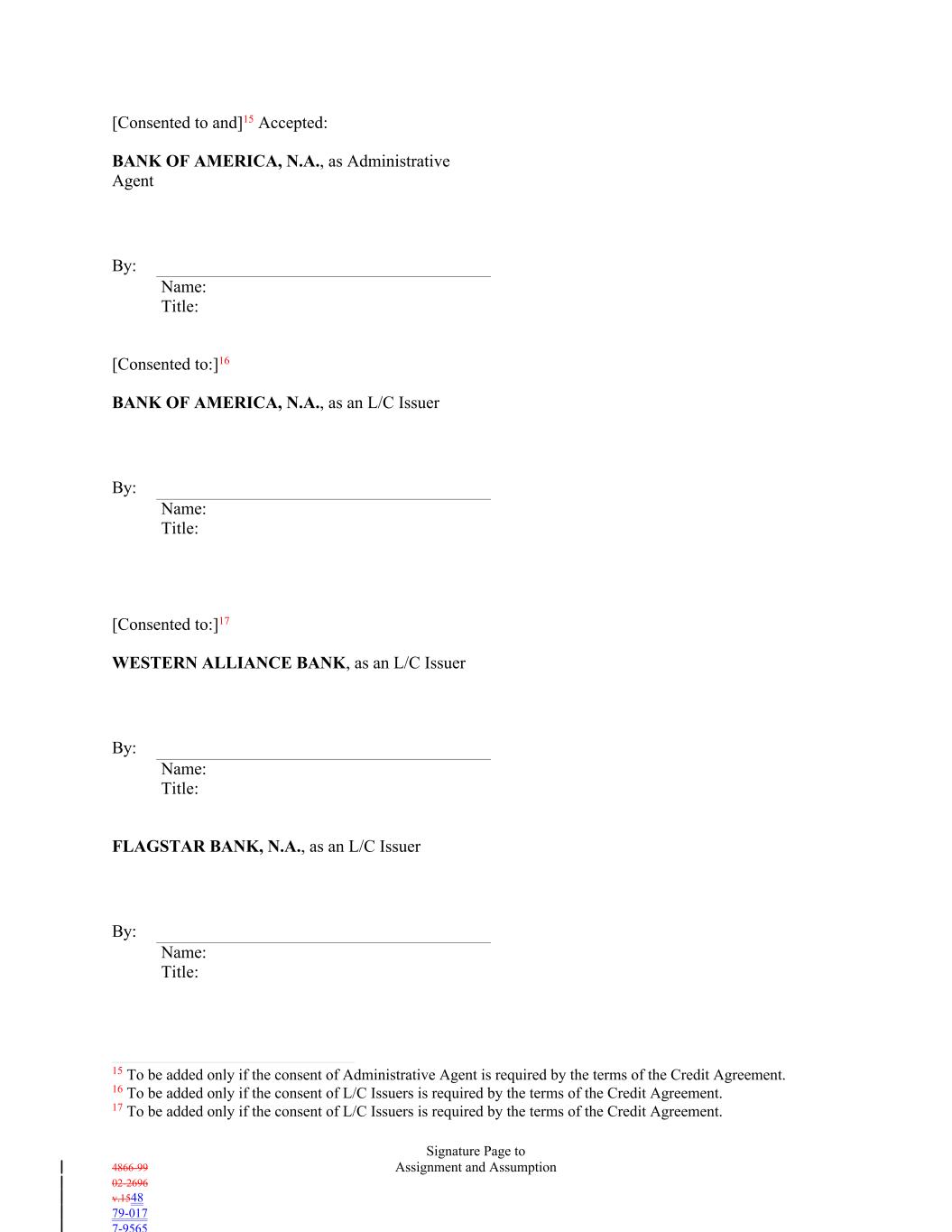 4866-99 02-2696 v.1548 79-017 7-9565 Signature Page to Assignment and Assumption By: [Consented to:]17 [Consented to and]15 Accepted: WESTERN ALLIANCE BANK, as an L/C Issuer By: [Consented to:]16 Name: BANK OF AMERICA, N.A., as an L/C Issuer Title: By: FLAGSTAR BANK, N.A., as an L/C Issuer By: Name: BANK OF AMERICA, N.A., as Administrative Agent Name: Name: Title: Title: Title: 15 To be added only if the consent of Administrative Agent is required by the terms of the Credit Agreement. 16 To be added only if the consent of L/C Issuers is required by the terms of the Credit Agreement. 17 To be added only if the consent of L/C Issuers is required by the terms of the Credit Agreement.