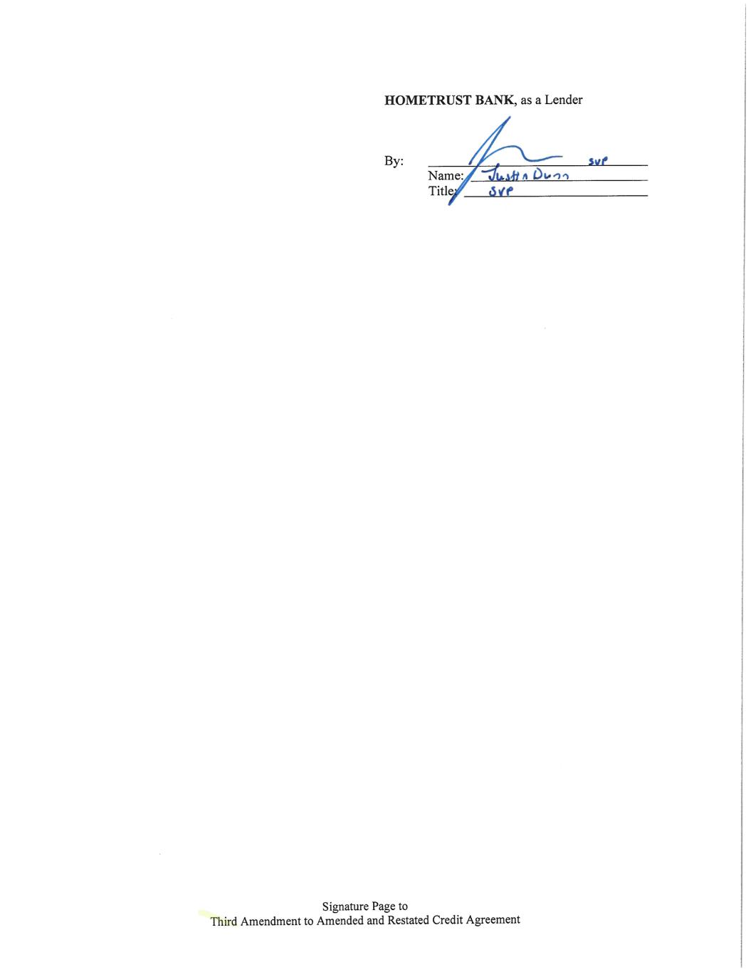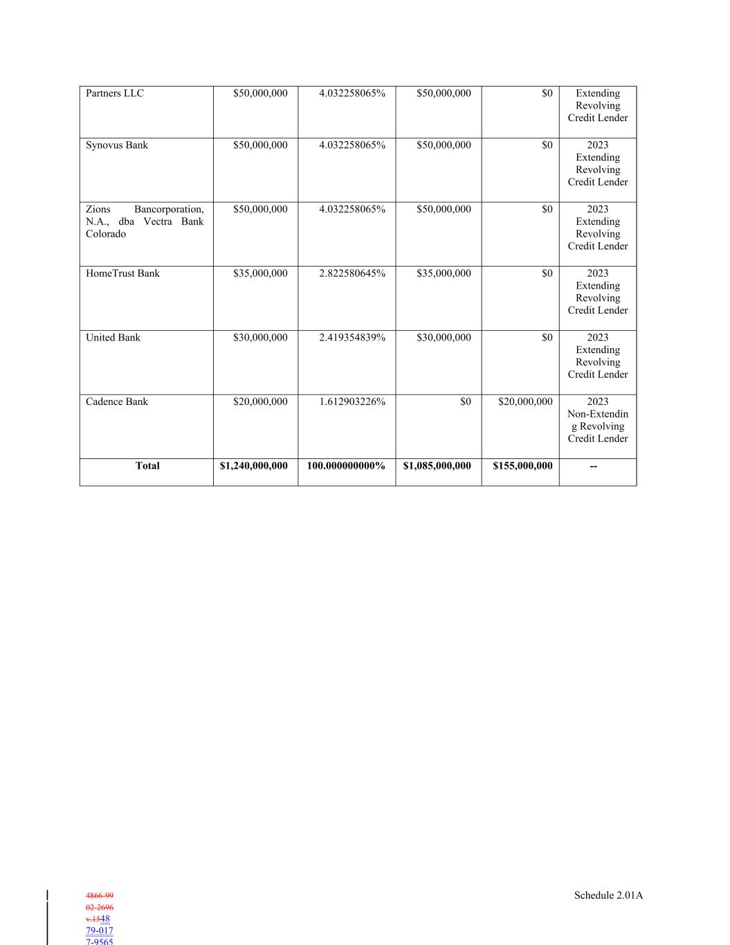 4866-99 02-2696 v.1548 79-017 7-9565 Schedule 2.01A United Bank $30,000,000 2.419354839% Extending Revolving Credit Lender $30,000,000 Zions Bancorporation, N.A., dba Vectra Bank Colorado $0 $50,000,000 2023 Extending Revolving Credit Lender $50,000,000 Cadence Bank 4.032258065% $20,000,000 1.612903226% $50,000,000 $0 Synovus Bank $20,000,000 $0 2023 Non-Extendin g Revolving Credit Lender 4.032258065% 2023 Extending Revolving Credit Lender Total $50,000,000 $1,240,000,000 100.000000000% $1,085,000,000 HomeTrust Bank $155,000,000 4.032258065% -- $35,000,000 $50,000,000 2.822580645% $50,000,000 $35,000,000 Partners LLC $0 $0 2023 Extending Revolving Credit Lender $0 2023 Extending Revolving Credit Lender