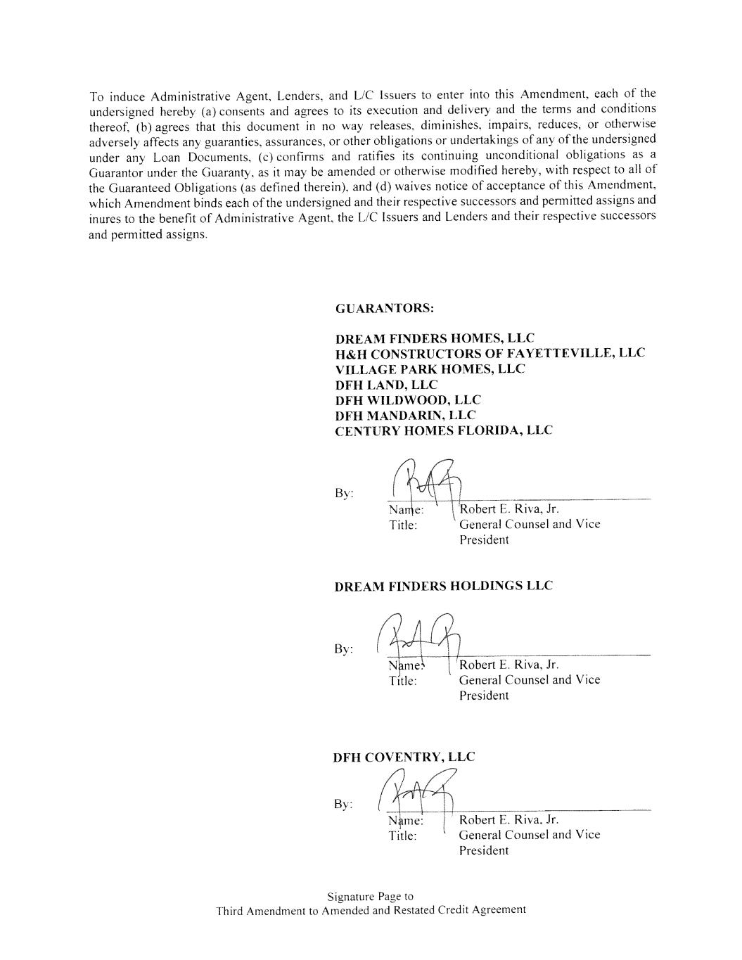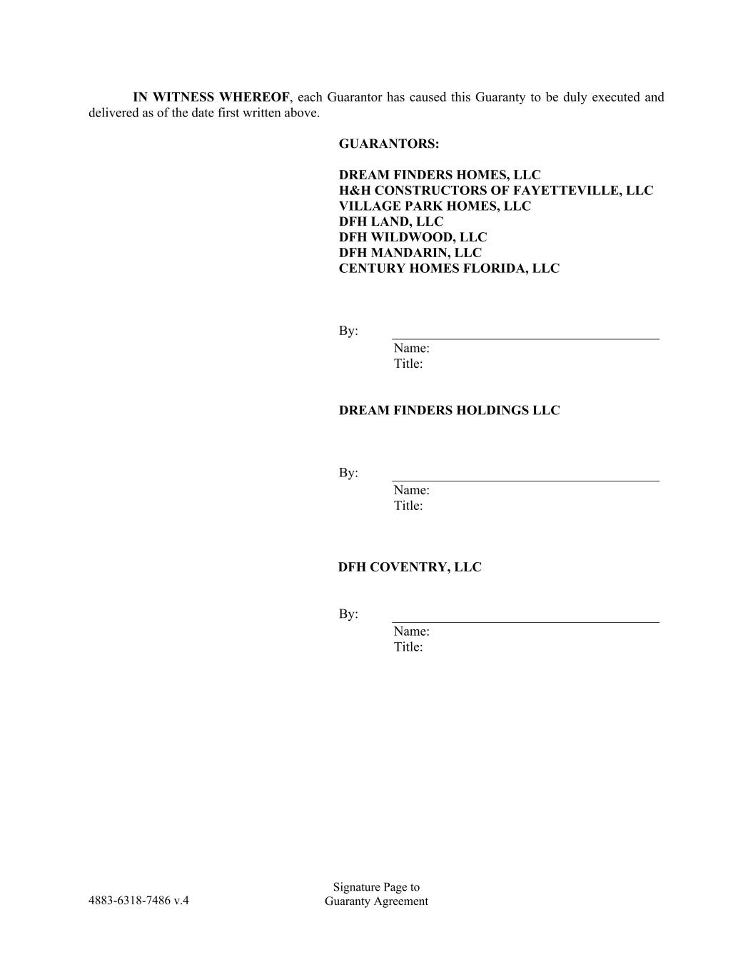 4883-6318-7486 v.4 Signature Page to Guaranty Agreement IN WITNESS WHEREOF, each Guarantor has caused this Guaranty to be duly executed and delivered as of the date first written above. GUARANTORS: DREAM FINDERS HOMES, LLC H&H CONSTRUCTORS OF FAYETTEVILLE, LLC VILLAGE PARK HOMES, LLC DFH LAND, LLC DFH WILDWOOD, LLC DFH MANDARIN, LLC CENTURY HOMES FLORIDA, LLC By: Name: Title: DREAM FINDERS HOLDINGS LLC By: Name: Title: DFH COVENTRY, LLC By: Name: Title: