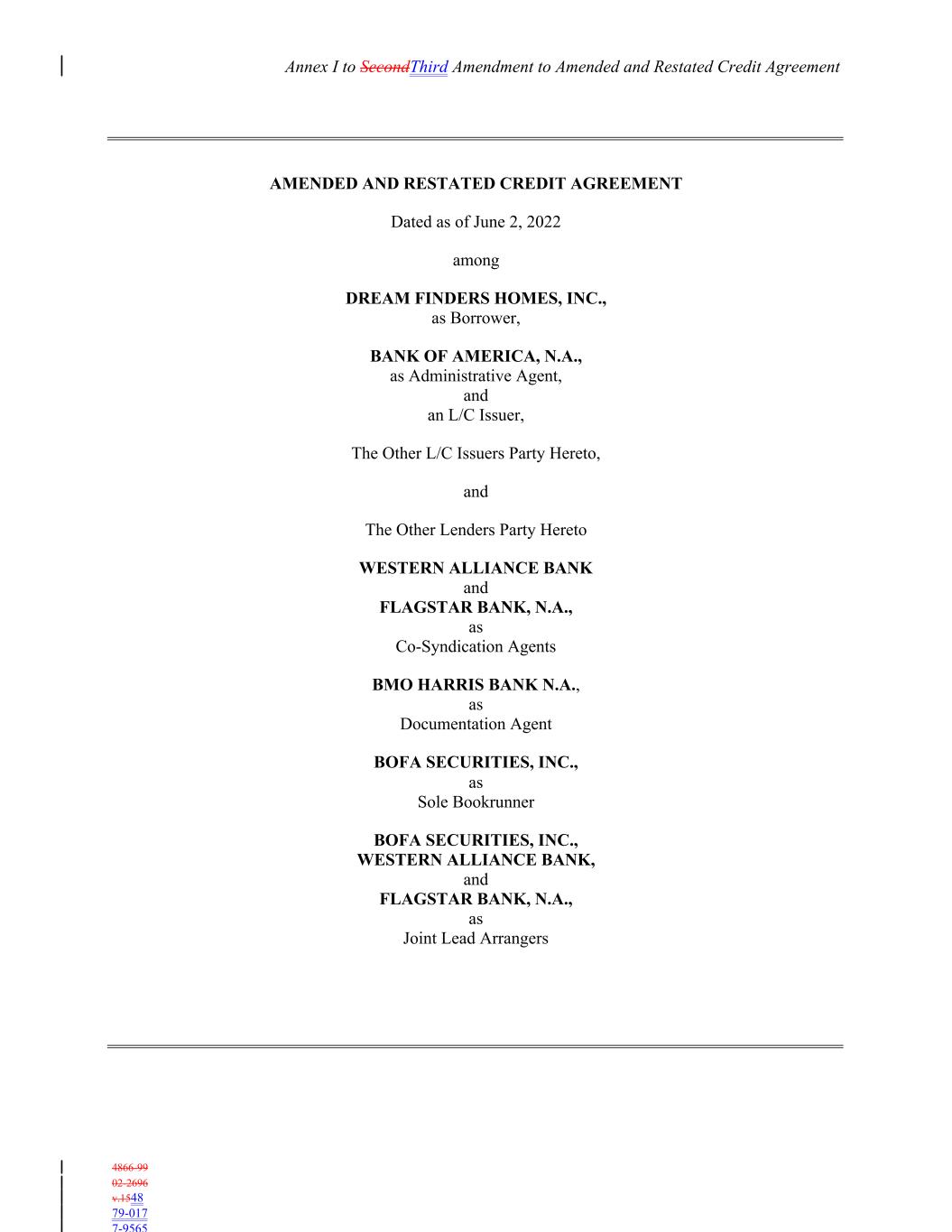4866-99 02-2696 v.1548 79-017 7-9565 Annex I to SecondThird Amendment to Amended and Restated Credit Agreement AMENDED AND RESTATED CREDIT AGREEMENT Dated as of June 2, 2022 among DREAM FINDERS HOMES, INC., as Borrower, BANK OF AMERICA, N.A., as Administrative Agent, and an L/C Issuer, The Other L/C Issuers Party Hereto, and The Other Lenders Party Hereto WESTERN ALLIANCE BANK and FLAGSTAR BANK, N.A., as Co-Syndication Agents BMO HARRIS BANK N.A., as Documentation Agent BOFA SECURITIES, INC., as Sole Bookrunner BOFA SECURITIES, INC., WESTERN ALLIANCE BANK, and FLAGSTAR BANK, N.A., as Joint Lead Arrangers