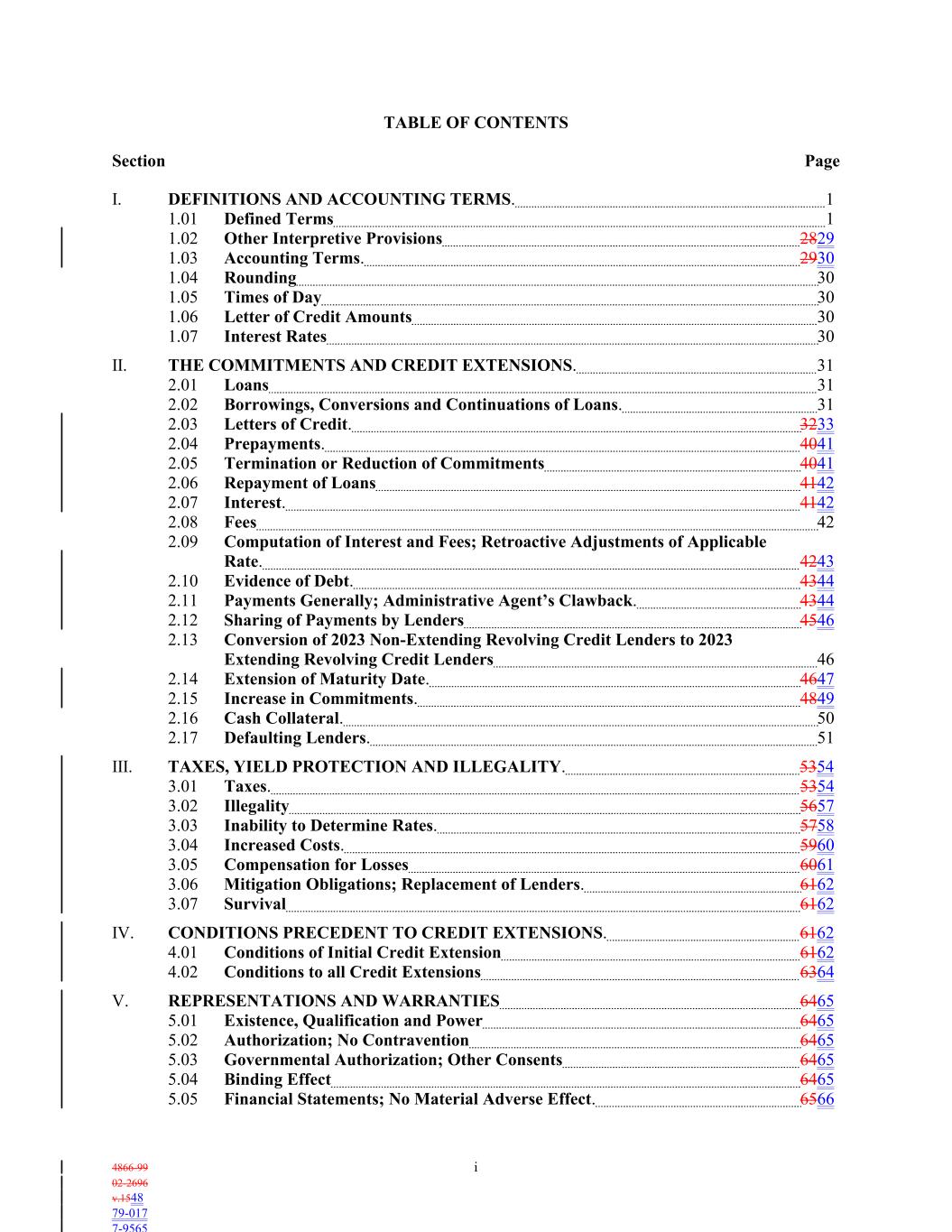 4866-99 02-2696 v.1548 79-017 7-9565 i TABLE OF CONTENTS Section Page I. DEFINITIONS AND ACCOUNTING TERMS. 1 1.01 Defined Terms 1 1.02 Other Interpretive Provisions 2829 1.03 Accounting Terms. 2930 1.04 Rounding 30 1.05 Times of Day 30 1.06 Letter of Credit Amounts 30 1.07 Interest Rates 30 II. THE COMMITMENTS AND CREDIT EXTENSIONS. 31 2.01 Loans 31 2.02 Borrowings, Conversions and Continuations of Loans. 31 2.03 Letters of Credit. 3233 2.04 Prepayments. 4041 2.05 Termination or Reduction of Commitments 4041 2.06 Repayment of Loans 4142 2.07 Interest. 4142 2.08 Fees 42 2.09 Computation of Interest and Fees; Retroactive Adjustments of Applicable Rate. 4243 2.10 Evidence of Debt. 4344 2.11 Payments Generally; Administrative Agent’s Clawback. 4344 2.12 Sharing of Payments by Lenders 4546 2.13 Conversion of 2023 Non-Extending Revolving Credit Lenders to 2023 Extending Revolving Credit Lenders 46 2.14 Extension of Maturity Date. 4647 2.15 Increase in Commitments. 4849 2.16 Cash Collateral. 50 2.17 Defaulting Lenders. 51 III. TAXES, YIELD PROTECTION AND ILLEGALITY. 5354 3.01 Taxes. 5354 3.02 Illegality 5657 3.03 Inability to Determine Rates. 5758 3.04 Increased Costs. 5960 3.05 Compensation for Losses 6061 3.06 Mitigation Obligations; Replacement of Lenders. 6162 3.07 Survival 6162 IV. CONDITIONS PRECEDENT TO CREDIT EXTENSIONS. 6162 4.01 Conditions of Initial Credit Extension 6162 4.02 Conditions to all Credit Extensions 6364 V. REPRESENTATIONS AND WARRANTIES 6465 5.01 Existence, Qualification and Power 6465 5.02 Authorization; No Contravention 6465 5.03 Governmental Authorization; Other Consents 6465 5.04 Binding Effect 6465 5.05 Financial Statements; No Material Adverse Effect. 6566