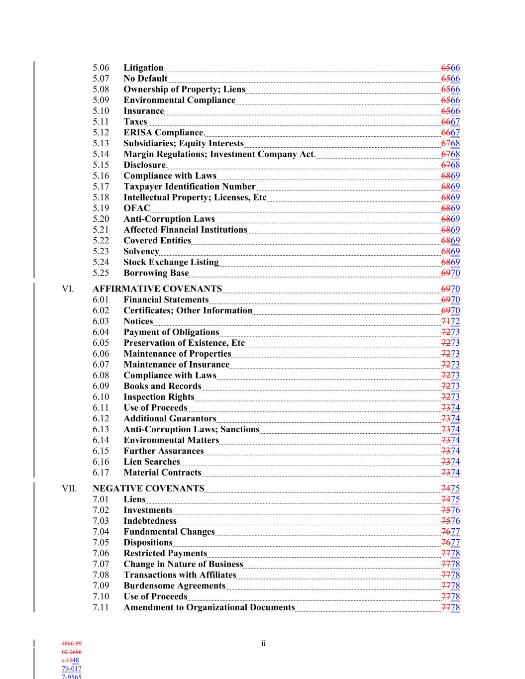 4866-99 02-2696 v.1548 79-017 7-9565 ii 5.06 Litigation 6566 5.07 No Default 6566 5.08 Ownership of Property; Liens 6566 5.09 Environmental Compliance 6566 5.10 Insurance 6566 5.11 Taxes 6667 5.12 ERISA Compliance. 6667 5.13 Subsidiaries; Equity Interests 6768 5.14 Margin Regulations; Investment Company Act. 6768 5.15 Disclosure. 6768 5.16 Compliance with Laws 6869 5.17 Taxpayer Identification Number 6869 5.18 Intellectual Property; Licenses, Etc 6869 5.19 OFAC 6869 5.20 Anti-Corruption Laws 6869 5.21 Affected Financial Institutions 6869 5.22 Covered Entities 6869 5.23 Solvency 6869 5.24 Stock Exchange Listing 6869 5.25 Borrowing Base 6970 VI. AFFIRMATIVE COVENANTS 6970 6.01 Financial Statements 6970 6.02 Certificates; Other Information 6970 6.03 Notices 7172 6.04 Payment of Obligations 7273 6.05 Preservation of Existence, Etc 7273 6.06 Maintenance of Properties 7273 6.07 Maintenance of Insurance 7273 6.08 Compliance with Laws 7273 6.09 Books and Records 7273 6.10 Inspection Rights 7273 6.11 Use of Proceeds 7374 6.12 Additional Guarantors 7374 6.13 Anti-Corruption Laws; Sanctions 7374 6.14 Environmental Matters 7374 6.15 Further Assurances 7374 6.16 Lien Searches 7374 6.17 Material Contracts 7374 VII. NEGATIVE COVENANTS 7475 7.01 Liens 7475 7.02 Investments 7576 7.03 Indebtedness 7576 7.04 Fundamental Changes 7677 7.05 Dispositions 7677 7.06 Restricted Payments 7778 7.07 Change in Nature of Business 7778 7.08 Transactions with Affiliates 7778 7.09 Burdensome Agreements 7778 7.10 Use of Proceeds 7778 7.11 Amendment to Organizational Documents 7778