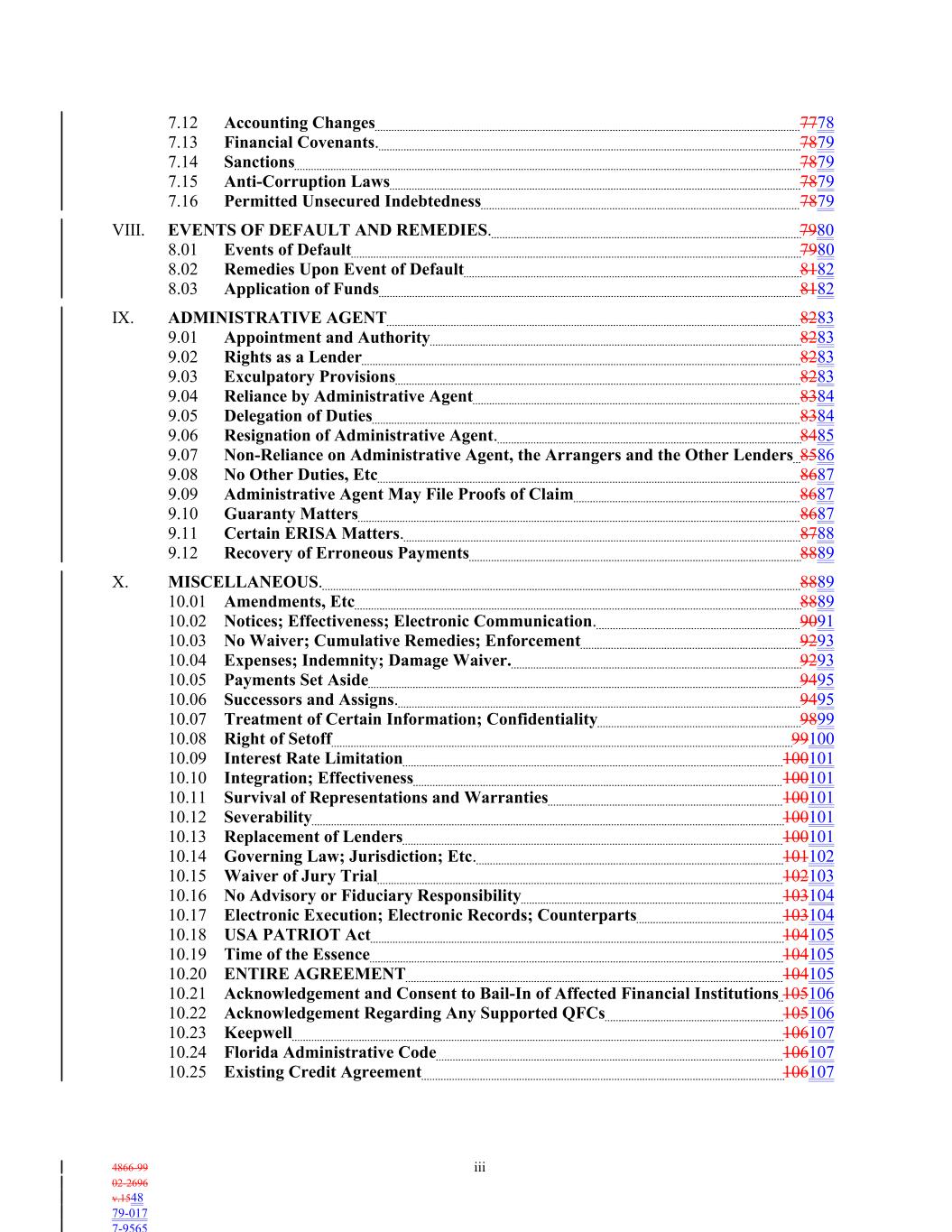 4866-99 02-2696 v.1548 79-017 7-9565 iii 7.12 Accounting Changes 7778 7.13 Financial Covenants. 7879 7.14 Sanctions 7879 7.15 Anti-Corruption Laws 7879 7.16 Permitted Unsecured Indebtedness 7879 VIII. EVENTS OF DEFAULT AND REMEDIES. 7980 8.01 Events of Default 7980 8.02 Remedies Upon Event of Default 8182 8.03 Application of Funds 8182 IX. ADMINISTRATIVE AGENT 8283 9.01 Appointment and Authority 8283 9.02 Rights as a Lender 8283 9.03 Exculpatory Provisions 8283 9.04 Reliance by Administrative Agent 8384 9.05 Delegation of Duties 8384 9.06 Resignation of Administrative Agent. 8485 9.07 Non-Reliance on Administrative Agent, the Arrangers and the Other Lenders 8586 9.08 No Other Duties, Etc 8687 9.09 Administrative Agent May File Proofs of Claim 8687 9.10 Guaranty Matters 8687 9.11 Certain ERISA Matters. 8788 9.12 Recovery of Erroneous Payments 8889 X. MISCELLANEOUS. 8889 10.01 Amendments, Etc 8889 10.02 Notices; Effectiveness; Electronic Communication. 9091 10.03 No Waiver; Cumulative Remedies; Enforcement 9293 10.04 Expenses; Indemnity; Damage Waiver. 9293 10.05 Payments Set Aside 9495 10.06 Successors and Assigns. 9495 10.07 Treatment of Certain Information; Confidentiality 9899 10.08 Right of Setoff 99100 10.09 Interest Rate Limitation 100101 10.10 Integration; Effectiveness 100101 10.11 Survival of Representations and Warranties 100101 10.12 Severability 100101 10.13 Replacement of Lenders 100101 10.14 Governing Law; Jurisdiction; Etc. 101102 10.15 Waiver of Jury Trial 102103 10.16 No Advisory or Fiduciary Responsibility 103104 10.17 Electronic Execution; Electronic Records; Counterparts 103104 10.18 USA PATRIOT Act 104105 10.19 Time of the Essence 104105 10.20 ENTIRE AGREEMENT 104105 10.21 Acknowledgement and Consent to Bail-In of Affected Financial Institutions 105106 10.22 Acknowledgement Regarding Any Supported QFCs 105106 10.23 Keepwell 106107 10.24 Florida Administrative Code 106107 10.25 Existing Credit Agreement 106107