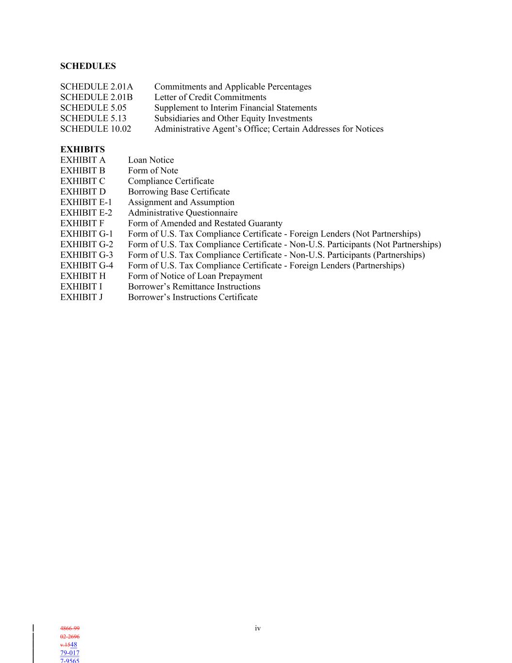 4866-99 02-2696 v.1548 79-017 7-9565 iv SCHEDULE 2.01B EXHIBIT E-1 SCHEDULE 10.02 Assignment and Assumption Administrative Agent’s Office; Certain Addresses for Notices EXHIBIT E-2 Letter of Credit Commitments Administrative Questionnaire EXHIBIT F EXHIBITS Form of Amended and Restated Guaranty EXHIBIT G-1 SCHEDULE 2.01A Form of U.S. Tax Compliance Certificate - Foreign Lenders (Not Partnerships) EXHIBIT A SCHEDULE 5.05 EXHIBIT G-2 Loan Notice Form of U.S. Tax Compliance Certificate - Non-U.S. Participants (Not Partnerships) EXHIBIT G-3 Supplement to Interim Financial Statements Form of U.S. Tax Compliance Certificate - Non-U.S. Participants (Partnerships) EXHIBIT B Commitments and Applicable Percentages EXHIBIT G-4 Form of Note Form of U.S. Tax Compliance Certificate - Foreign Lenders (Partnerships) EXHIBIT H SCHEDULES Form of Notice of Loan Prepayment EXHIBIT C SCHEDULE 5.13 EXHIBIT I Compliance Certificate Borrower’s Remittance Instructions EXHIBIT J Subsidiaries and Other Equity Investments Borrower’s Instructions Certificate EXHIBIT D Borrowing Base Certificate