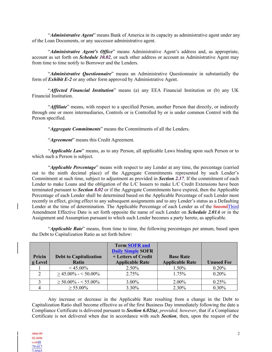 4866-99 02-2696 v.1548 79-017 7-9565 2 Debt to Capitalization Ratio 3 < 45.00% ≥ 50.00% - < 55.00% “Administrative Agent” means Bank of America in its capacity as administrative agent under any of the Loan Documents, or any successor administrative agent. “Administrative Agent’s Office” means Administrative Agent’s address and, as appropriate, account as set forth on Schedule 10.02, or such other address or account as Administrative Agent may from time to time notify to Borrower and the Lenders. “Administrative Questionnaire” means an Administrative Questionnaire in substantially the form of Exhibit E-2 or any other form approved by Administrative Agent. “Affected Financial Institution” means (a) any EEA Financial Institution or (b) any UK Financial Institution. “Affiliate” means, with respect to a specified Person, another Person that directly, or indirectly through one or more intermediaries, Controls or is Controlled by or is under common Control with the Person specified. “Aggregate Commitments” means the Commitments of all the Lenders. “Agreement” means this Credit Agreement. “Applicable Law” means, as to any Person, all applicable Laws binding upon such Person or to which such a Person is subject. “Applicable Percentage” means with respect to any Lender at any time, the percentage (carried out to the ninth decimal place) of the Aggregate Commitments represented by such Lender’s Commitment at such time, subject to adjustment as provided in Section 2.17. If the commitment of each Lender to make Loans and the obligation of the L/C Issuers to make L/C Credit Extensions have been terminated pursuant to Section 8.02 or if the Aggregate Commitments have expired, then the Applicable Percentage of each Lender shall be determined based on the Applicable Percentage of such Lender most recently in effect, giving effect to any subsequent assignments and to any Lender’s status as a Defaulting Lender at the time of determination. The Applicable Percentage of each Lender as of the SecondThird Amendment Effective Date is set forth opposite the name of such Lender on Schedule 2.01A or in the Assignment and Assumption pursuant to which such Lender becomes a party hereto, as applicable. “Applicable Rate” means, from time to time, the following percentages per annum, based upon the Debt to Capitalization Ratio as set forth below: 3.00% 2.50% 2.00% Term SOFR and Daily Simple SOFR + Letters of Credit Applicable Rate 0.25% 1.50% 4 0.20% ≥ 55.00% Base Rate Applicable Rate 3.30% 2.30% 0.30% 2 Unused Fee > 45.00% - < 50.00% Pricin g Level 2.75% 1.75% Any increase or decrease in the Applicable Rate resulting from a change in the Debt to Capitalization Ratio shall become effective as of the first Business Day immediately following the date a Compliance Certificate is delivered pursuant to Section 6.02(a); provided, however, that if a Compliance Certificate is not delivered when due in accordance with such Section, then, upon the request of the 0.20% 1
