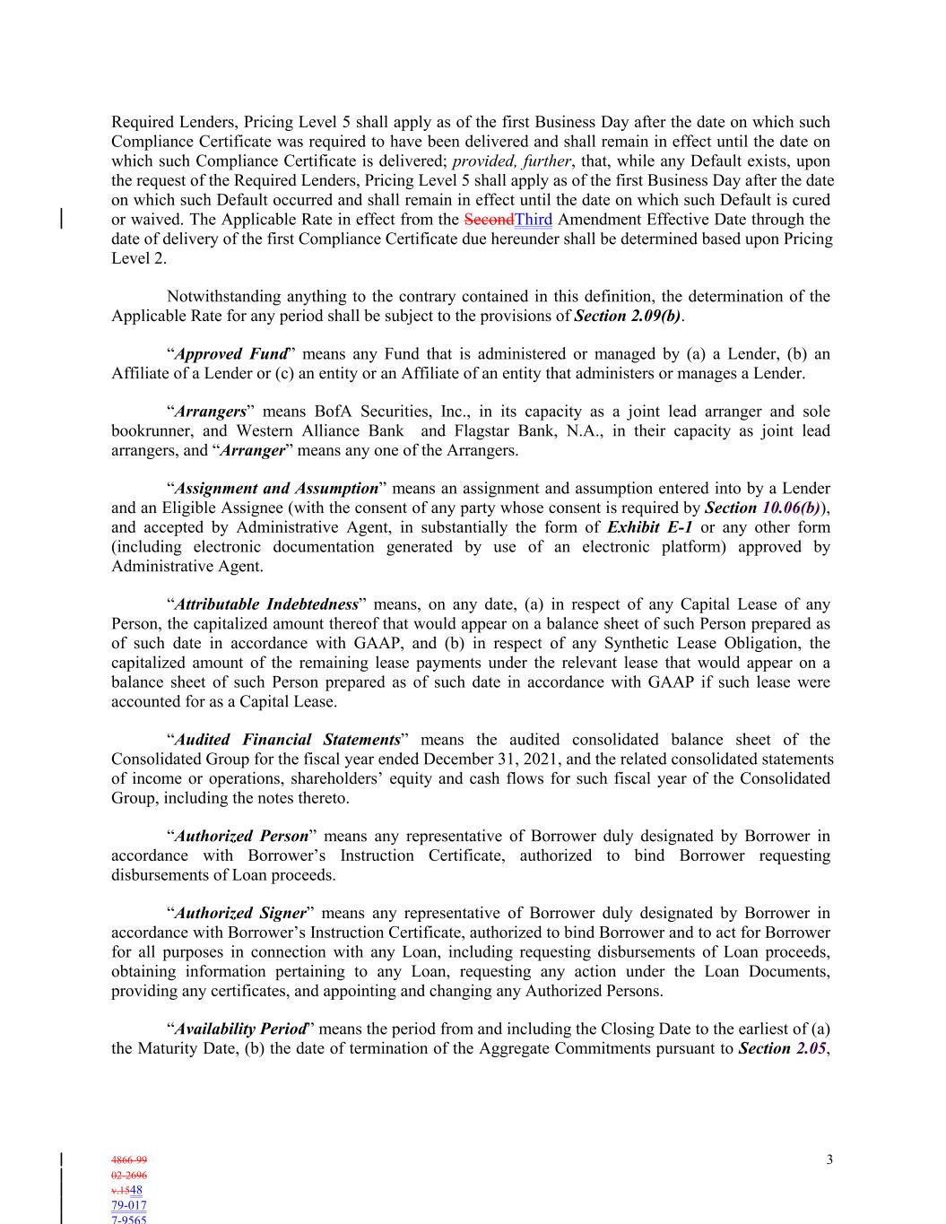 4866-99 02-2696 v.1548 79-017 7-9565 3 Required Lenders, Pricing Level 5 shall apply as of the first Business Day after the date on which such Compliance Certificate was required to have been delivered and shall remain in effect until the date on which such Compliance Certificate is delivered; provided, further, that, while any Default exists, upon the request of the Required Lenders, Pricing Level 5 shall apply as of the first Business Day after the date on which such Default occurred and shall remain in effect until the date on which such Default is cured or waived. The Applicable Rate in effect from the SecondThird Amendment Effective Date through the date of delivery of the first Compliance Certificate due hereunder shall be determined based upon Pricing Level 2. Notwithstanding anything to the contrary contained in this definition, the determination of the Applicable Rate for any period shall be subject to the provisions of Section 2.09(b). “Approved Fund” means any Fund that is administered or managed by (a) a Lender, (b) an Affiliate of a Lender or (c) an entity or an Affiliate of an entity that administers or manages a Lender. “Arrangers” means BofA Securities, Inc., in its capacity as a joint lead arranger and sole bookrunner, and Western Alliance Bank and Flagstar Bank, N.A., in their capacity as joint lead arrangers, and “Arranger” means any one of the Arrangers. “Assignment and Assumption” means an assignment and assumption entered into by a Lender and an Eligible Assignee (with the consent of any party whose consent is required by Section 10.06(b)), and accepted by Administrative Agent, in substantially the form of Exhibit E-1 or any other form (including electronic documentation generated by use of an electronic platform) approved by Administrative Agent. “Attributable Indebtedness” means, on any date, (a) in respect of any Capital Lease of any Person, the capitalized amount thereof that would appear on a balance sheet of such Person prepared as of such date in accordance with GAAP, and (b) in respect of any Synthetic Lease Obligation, the capitalized amount of the remaining lease payments under the relevant lease that would appear on a balance sheet of such Person prepared as of such date in accordance with GAAP if such lease were accounted for as a Capital Lease. “Audited Financial Statements” means the audited consolidated balance sheet of the Consolidated Group for the fiscal year ended December 31, 2021, and the related consolidated statements of income or operations, shareholders’ equity and cash flows for such fiscal year of the Consolidated Group, including the notes thereto. “Authorized Person” means any representative of Borrower duly designated by Borrower in accordance with Borrower’s Instruction Certificate, authorized to bind Borrower requesting disbursements of Loan proceeds. “Authorized Signer” means any representative of Borrower duly designated by Borrower in accordance with Borrower’s Instruction Certificate, authorized to bind Borrower and to act for Borrower for all purposes in connection with any Loan, including requesting disbursements of Loan proceeds, obtaining information pertaining to any Loan, requesting any action under the Loan Documents, providing any certificates, and appointing and changing any Authorized Persons. “Availability Period” means the period from and including the Closing Date to the earliest of (a) the Maturity Date, (b) the date of termination of the Aggregate Commitments pursuant to Section 2.05,