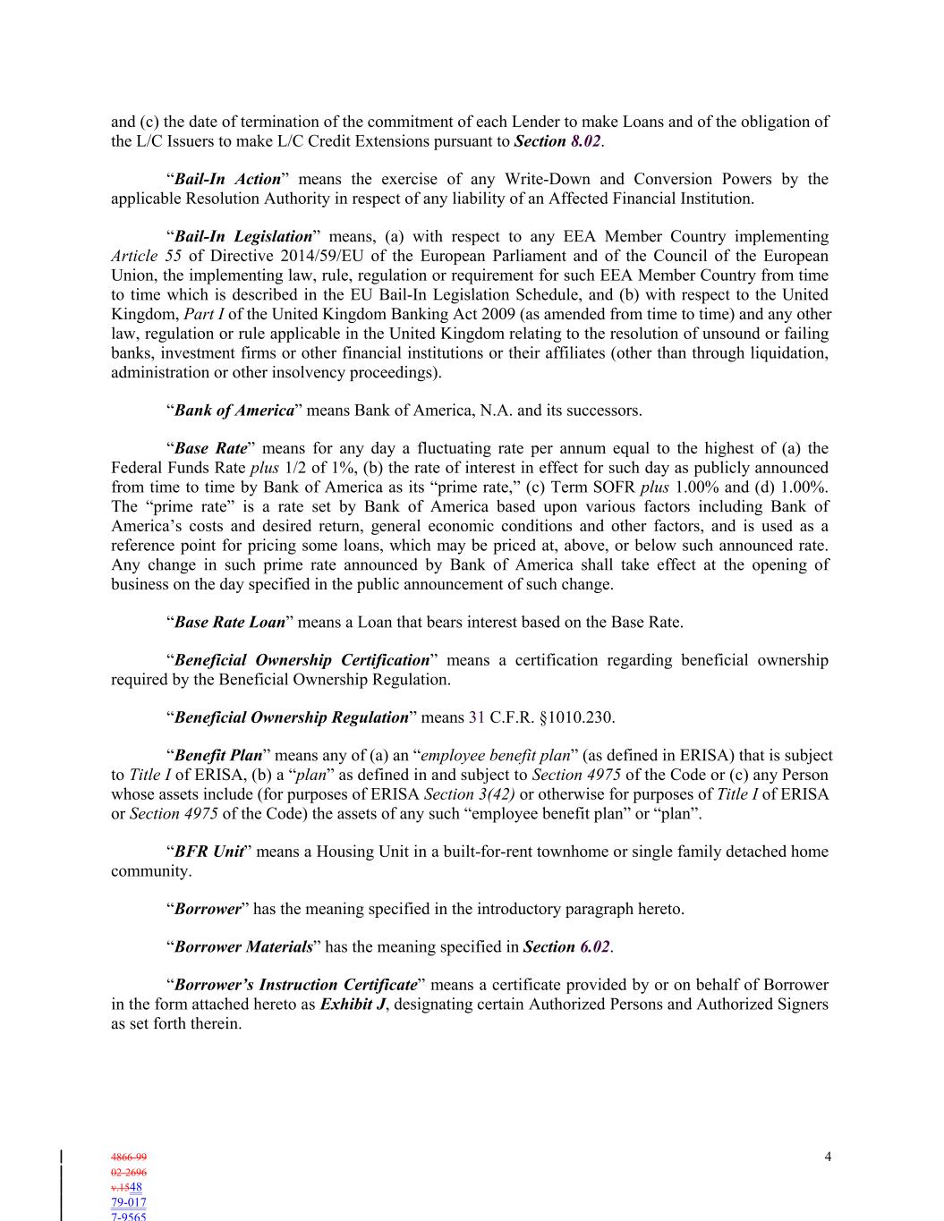 4866-99 02-2696 v.1548 79-017 7-9565 4 and (c) the date of termination of the commitment of each Lender to make Loans and of the obligation of the L/C Issuers to make L/C Credit Extensions pursuant to Section 8.02. “Bail-In Action” means the exercise of any Write-Down and Conversion Powers by the applicable Resolution Authority in respect of any liability of an Affected Financial Institution. “Bail-In Legislation” means, (a) with respect to any EEA Member Country implementing Article 55 of Directive 2014/59/EU of the European Parliament and of the Council of the European Union, the implementing law, rule, regulation or requirement for such EEA Member Country from time to time which is described in the EU Bail-In Legislation Schedule, and (b) with respect to the United Kingdom, Part I of the United Kingdom Banking Act 2009 (as amended from time to time) and any other law, regulation or rule applicable in the United Kingdom relating to the resolution of unsound or failing banks, investment firms or other financial institutions or their affiliates (other than through liquidation, administration or other insolvency proceedings). “Bank of America” means Bank of America, N.A. and its successors. “Base Rate” means for any day a fluctuating rate per annum equal to the highest of (a) the Federal Funds Rate plus 1/2 of 1%, (b) the rate of interest in effect for such day as publicly announced from time to time by Bank of America as its “prime rate,” (c) Term SOFR plus 1.00% and (d) 1.00%. The “prime rate” is a rate set by Bank of America based upon various factors including Bank of America’s costs and desired return, general economic conditions and other factors, and is used as a reference point for pricing some loans, which may be priced at, above, or below such announced rate. Any change in such prime rate announced by Bank of America shall take effect at the opening of business on the day specified in the public announcement of such change. “Base Rate Loan” means a Loan that bears interest based on the Base Rate. “Beneficial Ownership Certification” means a certification regarding beneficial ownership required by the Beneficial Ownership Regulation. “Beneficial Ownership Regulation” means 31 C.F.R. §1010.230. “Benefit Plan” means any of (a) an “employee benefit plan” (as defined in ERISA) that is subject to Title I of ERISA, (b) a “plan” as defined in and subject to Section 4975 of the Code or (c) any Person whose assets include (for purposes of ERISA Section 3(42) or otherwise for purposes of Title I of ERISA or Section 4975 of the Code) the assets of any such “employee benefit plan” or “plan”. “BFR Unit” means a Housing Unit in a built-for-rent townhome or single family detached home community. “Borrower” has the meaning specified in the introductory paragraph hereto. “Borrower Materials” has the meaning specified in Section 6.02. “Borrower’s Instruction Certificate” means a certificate provided by or on behalf of Borrower in the form attached hereto as Exhibit J, designating certain Authorized Persons and Authorized Signers as set forth therein.
