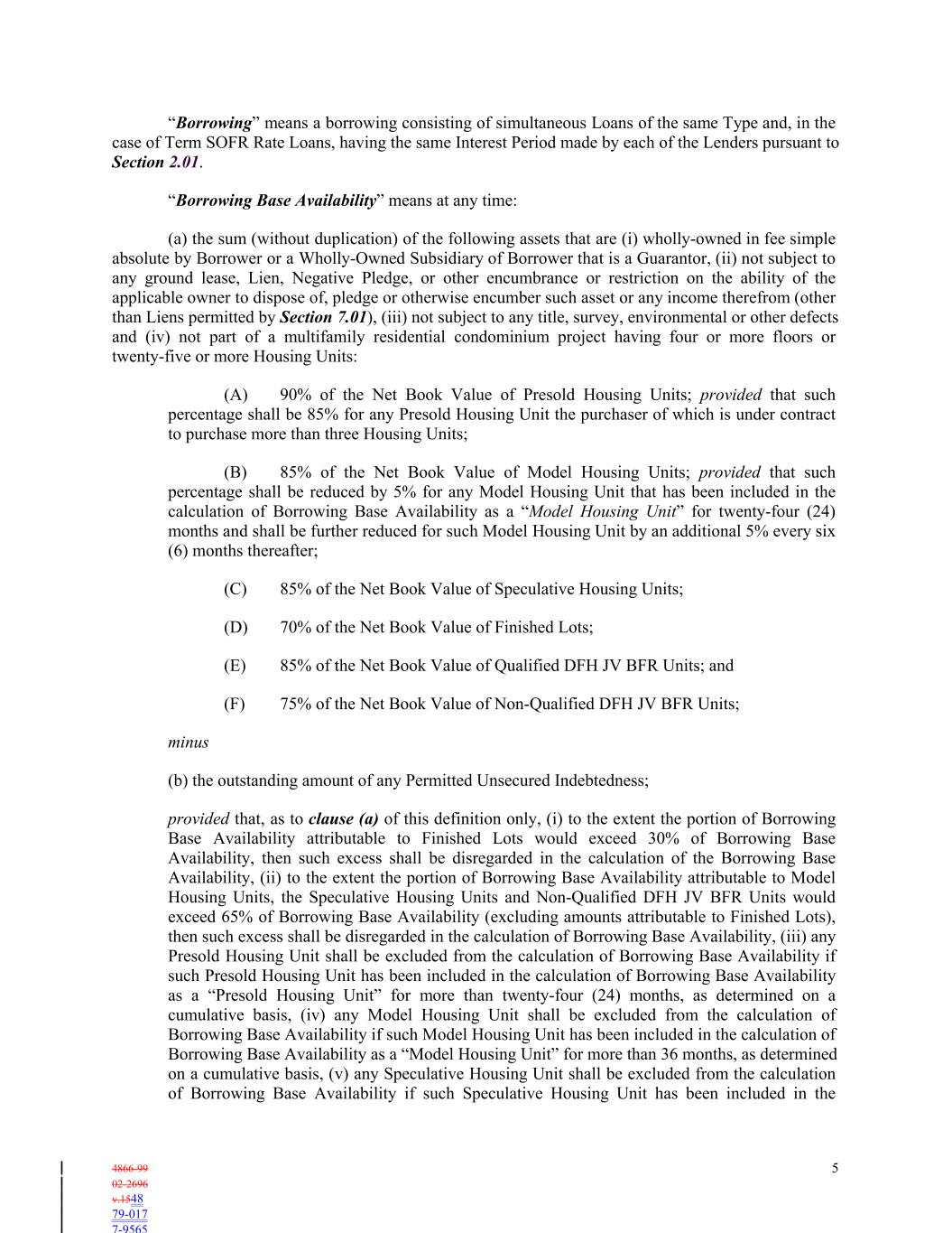 4866-99 02-2696 v.1548 79-017 7-9565 5 “Borrowing” means a borrowing consisting of simultaneous Loans of the same Type and, in the case of Term SOFR Rate Loans, having the same Interest Period made by each of the Lenders pursuant to Section 2.01. “Borrowing Base Availability” means at any time: (a) the sum (without duplication) of the following assets that are (i) wholly-owned in fee simple absolute by Borrower or a Wholly-Owned Subsidiary of Borrower that is a Guarantor, (ii) not subject to any ground lease, Lien, Negative Pledge, or other encumbrance or restriction on the ability of the applicable owner to dispose of, pledge or otherwise encumber such asset or any income therefrom (other than Liens permitted by Section 7.01), (iii) not subject to any title, survey, environmental or other defects and (iv) not part of a multifamily residential condominium project having four or more floors or twenty-five or more Housing Units: (A) 90% of the Net Book Value of Presold Housing Units; provided that such percentage shall be 85% for any Presold Housing Unit the purchaser of which is under contract to purchase more than three Housing Units; (B) 85% of the Net Book Value of Model Housing Units; provided that such percentage shall be reduced by 5% for any Model Housing Unit that has been included in the calculation of Borrowing Base Availability as a “Model Housing Unit” for twenty-four (24) months and shall be further reduced for such Model Housing Unit by an additional 5% every six (6) months thereafter; (C) 85% of the Net Book Value of Speculative Housing Units; (D) 70% of the Net Book Value of Finished Lots; (E) 85% of the Net Book Value of Qualified DFH JV BFR Units; and (F) 75% of the Net Book Value of Non-Qualified DFH JV BFR Units; minus (b) the outstanding amount of any Permitted Unsecured Indebtedness; provided that, as to clause (a) of this definition only, (i) to the extent the portion of Borrowing Base Availability attributable to Finished Lots would exceed 30% of Borrowing Base Availability, then such excess shall be disregarded in the calculation of the Borrowing Base Availability, (ii) to the extent the portion of Borrowing Base Availability attributable to Model Housing Units, the Speculative Housing Units and Non-Qualified DFH JV BFR Units would exceed 65% of Borrowing Base Availability (excluding amounts attributable to Finished Lots), then such excess shall be disregarded in the calculation of Borrowing Base Availability, (iii) any Presold Housing Unit shall be excluded from the calculation of Borrowing Base Availability if such Presold Housing Unit has been included in the calculation of Borrowing Base Availability as a “Presold Housing Unit” for more than twenty-four (24) months, as determined on a cumulative basis, (iv) any Model Housing Unit shall be excluded from the calculation of Borrowing Base Availability if such Model Housing Unit has been included in the calculation of Borrowing Base Availability as a “Model Housing Unit” for more than 36 months, as determined on a cumulative basis, (v) any Speculative Housing Unit shall be excluded from the calculation of Borrowing Base Availability if such Speculative Housing Unit has been included in the