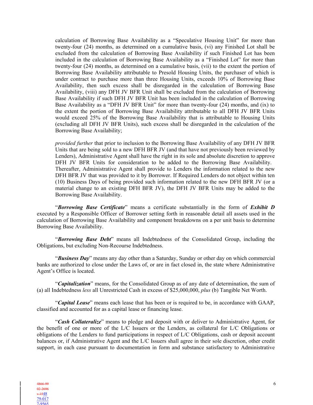 4866-99 02-2696 v.1548 79-017 7-9565 6 calculation of Borrowing Base Availability as a “Speculative Housing Unit” for more than twenty-four (24) months, as determined on a cumulative basis, (vi) any Finished Lot shall be excluded from the calculation of Borrowing Base Availability if such Finished Lot has been included in the calculation of Borrowing Base Availability as a “Finished Lot” for more than twenty-four (24) months, as determined on a cumulative basis, (vii) to the extent the portion of Borrowing Base Availability attributable to Presold Housing Units, the purchaser of which is under contract to purchase more than three Housing Units, exceeds 10% of Borrowing Base Availability, then such excess shall be disregarded in the calculation of Borrowing Base Availability, (viii) any DFH JV BFR Unit shall be excluded from the calculation of Borrowing Base Availability if such DFH JV BFR Unit has been included in the calculation of Borrowing Base Availability as a “DFH JV BFR Unit” for more than twenty-four (24) months, and (ix) to the extent the portion of Borrowing Base Availability attributable to all DFH JV BFR Units would exceed 25% of the Borrowing Base Availability that is attributable to Housing Units (excluding all DFH JV BFR Units), such excess shall be disregarded in the calculation of the Borrowing Base Availability; provided further that prior to inclusion to the Borrowing Base Availability of any DFH JV BFR Units that are being sold to a new DFH BFR JV (and that have not previously been reviewed by Lenders), Administrative Agent shall have the right in its sole and absolute discretion to approve DFH JV BFR Units for consideration to be added to the Borrowing Base Availability. Thereafter, Administrative Agent shall provide to Lenders the information related to the new DFH BFR JV that was provided to it by Borrower. If Required Lenders do not object within ten (10) Business Days of being provided such information related to the new DFH BFR JV (or a material change to an existing DFH BFR JV), the DFH JV BFR Units may be added to the Borrowing Base Availability. “Borrowing Base Certificate” means a certificate substantially in the form of Exhibit D executed by a Responsible Officer of Borrower setting forth in reasonable detail all assets used in the calculation of Borrowing Base Availability and component breakdowns on a per unit basis to determine Borrowing Base Availability. “Borrowing Base Debt” means all Indebtedness of the Consolidated Group, including the Obligations, but excluding Non-Recourse Indebtedness. “Business Day” means any day other than a Saturday, Sunday or other day on which commercial banks are authorized to close under the Laws of, or are in fact closed in, the state where Administrative Agent’s Office is located. “Capitalization” means, for the Consolidated Group as of any date of determination, the sum of (a) all Indebtedness less all Unrestricted Cash in excess of $25,000,000, plus (b) Tangible Net Worth. “Capital Lease” means each lease that has been or is required to be, in accordance with GAAP, classified and accounted for as a capital lease or financing lease. “Cash Collateralize” means to pledge and deposit with or deliver to Administrative Agent, for the benefit of one or more of the L/C Issuers or the Lenders, as collateral for L/C Obligations or obligations of the Lenders to fund participations in respect of L/C Obligations, cash or deposit account balances or, if Administrative Agent and the L/C Issuers shall agree in their sole discretion, other credit support, in each case pursuant to documentation in form and substance satisfactory to Administrative