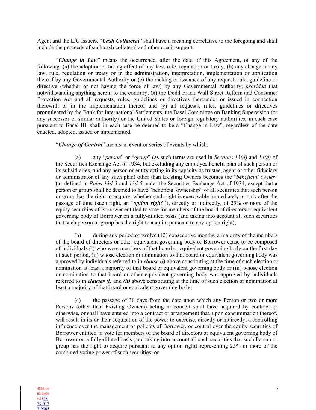 4866-99 02-2696 v.1548 79-017 7-9565 7 Agent and the L/C Issuers. “Cash Collateral” shall have a meaning correlative to the foregoing and shall include the proceeds of such cash collateral and other credit support. “Change in Law” means the occurrence, after the date of this Agreement, of any of the following: (a) the adoption or taking effect of any law, rule, regulation or treaty, (b) any change in any law, rule, regulation or treaty or in the administration, interpretation, implementation or application thereof by any Governmental Authority or (c) the making or issuance of any request, rule, guideline or directive (whether or not having the force of law) by any Governmental Authority; provided that notwithstanding anything herein to the contrary, (x) the Dodd-Frank Wall Street Reform and Consumer Protection Act and all requests, rules, guidelines or directives thereunder or issued in connection therewith or in the implementation thereof and (y) all requests, rules, guidelines or directives promulgated by the Bank for International Settlements, the Basel Committee on Banking Supervision (or any successor or similar authority) or the United States or foreign regulatory authorities, in each case pursuant to Basel III, shall in each case be deemed to be a “Change in Law”, regardless of the date enacted, adopted, issued or implemented. “Change of Control” means an event or series of events by which: (a) any “person” or “group” (as such terms are used in Sections 13(d) and 14(d) of the Securities Exchange Act of 1934, but excluding any employee benefit plan of such person or its subsidiaries, and any person or entity acting in its capacity as trustee, agent or other fiduciary or administrator of any such plan) other than Existing Owners becomes the “beneficial owner” (as defined in Rules 13d-3 and 13d-5 under the Securities Exchange Act of 1934, except that a person or group shall be deemed to have “beneficial ownership” of all securities that such person or group has the right to acquire, whether such right is exercisable immediately or only after the passage of time (such right, an “option right”)), directly or indirectly, of 25% or more of the equity securities of Borrower entitled to vote for members of the board of directors or equivalent governing body of Borrower on a fully-diluted basis (and taking into account all such securities that such person or group has the right to acquire pursuant to any option right); (b) during any period of twelve (12) consecutive months, a majority of the members of the board of directors or other equivalent governing body of Borrower cease to be composed of individuals (i) who were members of that board or equivalent governing body on the first day of such period, (ii) whose election or nomination to that board or equivalent governing body was approved by individuals referred to in clause (i) above constituting at the time of such election or nomination at least a majority of that board or equivalent governing body or (iii) whose election or nomination to that board or other equivalent governing body was approved by individuals referred to in clauses (i) and (ii) above constituting at the time of such election or nomination at least a majority of that board or equivalent governing body; (c) the passage of 30 days from the date upon which any Person or two or more Persons (other than Existing Owners) acting in concert shall have acquired by contract or otherwise, or shall have entered into a contract or arrangement that, upon consummation thereof, will result in its or their acquisition of the power to exercise, directly or indirectly, a controlling influence over the management or policies of Borrower, or control over the equity securities of Borrower entitled to vote for members of the board of directors or equivalent governing body of Borrower on a fully-diluted basis (and taking into account all such securities that such Person or group has the right to acquire pursuant to any option right) representing 25% or more of the combined voting power of such securities; or
