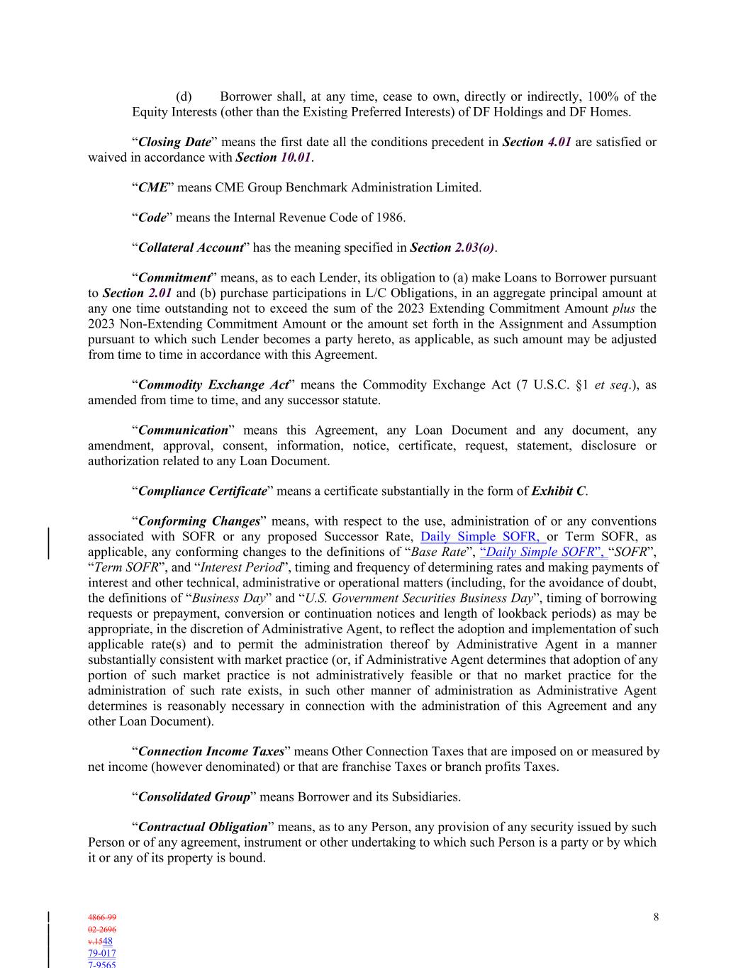 4866-99 02-2696 v.1548 79-017 7-9565 8 (d) Borrower shall, at any time, cease to own, directly or indirectly, 100% of the Equity Interests (other than the Existing Preferred Interests) of DF Holdings and DF Homes. “Closing Date” means the first date all the conditions precedent in Section 4.01 are satisfied or waived in accordance with Section 10.01. “CME” means CME Group Benchmark Administration Limited. “Code” means the Internal Revenue Code of 1986. “Collateral Account” has the meaning specified in Section 2.03(o). “Commitment” means, as to each Lender, its obligation to (a) make Loans to Borrower pursuant to Section 2.01 and (b) purchase participations in L/C Obligations, in an aggregate principal amount at any one time outstanding not to exceed the sum of the 2023 Extending Commitment Amount plus the 2023 Non-Extending Commitment Amount or the amount set forth in the Assignment and Assumption pursuant to which such Lender becomes a party hereto, as applicable, as such amount may be adjusted from time to time in accordance with this Agreement. “Commodity Exchange Act” means the Commodity Exchange Act (7 U.S.C. §1 et seq.), as amended from time to time, and any successor statute. “Communication” means this Agreement, any Loan Document and any document, any amendment, approval, consent, information, notice, certificate, request, statement, disclosure or authorization related to any Loan Document. “Compliance Certificate” means a certificate substantially in the form of Exhibit C. “Conforming Changes” means, with respect to the use, administration of or any conventions associated with SOFR or any proposed Successor Rate, Daily Simple SOFR, or Term SOFR, as applicable, any conforming changes to the definitions of “Base Rate”, “Daily Simple SOFR”, “SOFR”, “Term SOFR”, and “Interest Period”, timing and frequency of determining rates and making payments of interest and other technical, administrative or operational matters (including, for the avoidance of doubt, the definitions of “Business Day” and “U.S. Government Securities Business Day”, timing of borrowing requests or prepayment, conversion or continuation notices and length of lookback periods) as may be appropriate, in the discretion of Administrative Agent, to reflect the adoption and implementation of such applicable rate(s) and to permit the administration thereof by Administrative Agent in a manner substantially consistent with market practice (or, if Administrative Agent determines that adoption of any portion of such market practice is not administratively feasible or that no market practice for the administration of such rate exists, in such other manner of administration as Administrative Agent determines is reasonably necessary in connection with the administration of this Agreement and any other Loan Document). “Connection Income Taxes” means Other Connection Taxes that are imposed on or measured by net income (however denominated) or that are franchise Taxes or branch profits Taxes. “Consolidated Group” means Borrower and its Subsidiaries. “Contractual Obligation” means, as to any Person, any provision of any security issued by such Person or of any agreement, instrument or other undertaking to which such Person is a party or by which it or any of its property is bound.