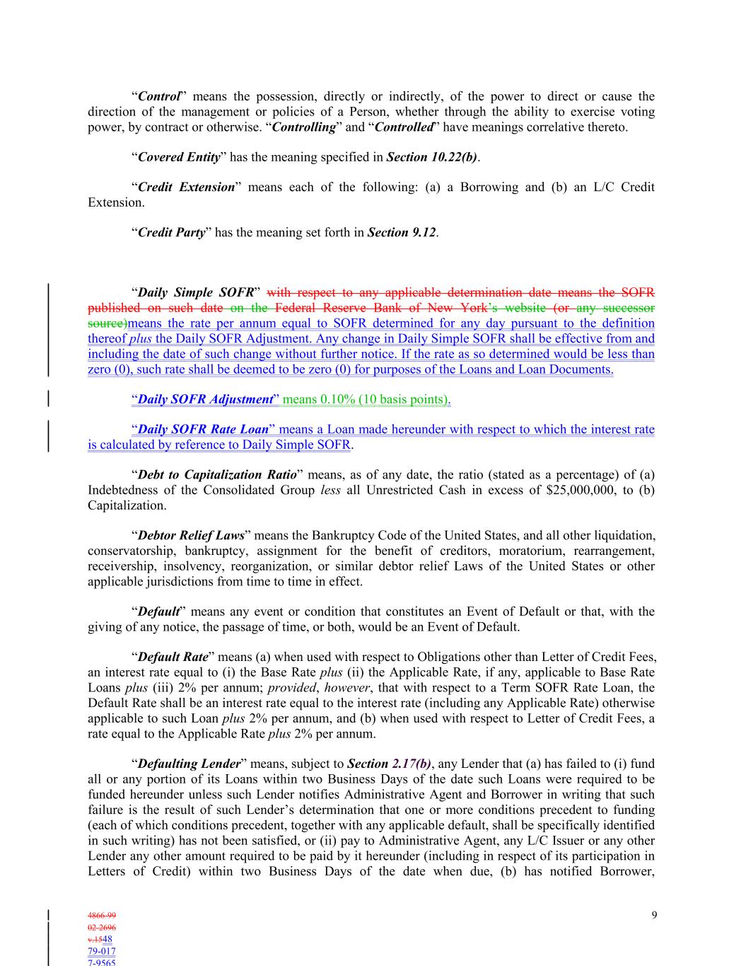 4866-99 02-2696 v.1548 79-017 7-9565 9 “Control” means the possession, directly or indirectly, of the power to direct or cause the direction of the management or policies of a Person, whether through the ability to exercise voting power, by contract or otherwise. “Controlling” and “Controlled” have meanings correlative thereto. “Covered Entity” has the meaning specified in Section 10.22(b). “Credit Extension” means each of the following: (a) a Borrowing and (b) an L/C Credit Extension. “Credit Party” has the meaning set forth in Section 9.12. “Daily Simple SOFR” with respect to any applicable determination date means the SOFR published on such date on the Federal Reserve Bank of New York’s website (or any successor source)means the rate per annum equal to SOFR determined for any day pursuant to the definition thereof plus the Daily SOFR Adjustment. Any change in Daily Simple SOFR shall be effective from and including the date of such change without further notice. If the rate as so determined would be less than zero (0), such rate shall be deemed to be zero (0) for purposes of the Loans and Loan Documents. “Daily SOFR Adjustment” means 0.10% (10 basis points). “Daily SOFR Rate Loan” means a Loan made hereunder with respect to which the interest rate is calculated by reference to Daily Simple SOFR. “Debt to Capitalization Ratio” means, as of any date, the ratio (stated as a percentage) of (a) Indebtedness of the Consolidated Group less all Unrestricted Cash in excess of $25,000,000, to (b) Capitalization. “Debtor Relief Laws” means the Bankruptcy Code of the United States, and all other liquidation, conservatorship, bankruptcy, assignment for the benefit of creditors, moratorium, rearrangement, receivership, insolvency, reorganization, or similar debtor relief Laws of the United States or other applicable jurisdictions from time to time in effect. “Default” means any event or condition that constitutes an Event of Default or that, with the giving of any notice, the passage of time, or both, would be an Event of Default. “Default Rate” means (a) when used with respect to Obligations other than Letter of Credit Fees, an interest rate equal to (i) the Base Rate plus (ii) the Applicable Rate, if any, applicable to Base Rate Loans plus (iii) 2% per annum; provided, however, that with respect to a Term SOFR Rate Loan, the Default Rate shall be an interest rate equal to the interest rate (including any Applicable Rate) otherwise applicable to such Loan plus 2% per annum, and (b) when used with respect to Letter of Credit Fees, a rate equal to the Applicable Rate plus 2% per annum. “Defaulting Lender” means, subject to Section 2.17(b), any Lender that (a) has failed to (i) fund all or any portion of its Loans within two Business Days of the date such Loans were required to be funded hereunder unless such Lender notifies Administrative Agent and Borrower in writing that such failure is the result of such Lender’s determination that one or more conditions precedent to funding (each of which conditions precedent, together with any applicable default, shall be specifically identified in such writing) has not been satisfied, or (ii) pay to Administrative Agent, any L/C Issuer or any other Lender any other amount required to be paid by it hereunder (including in respect of its participation in Letters of Credit) within two Business Days of the date when due, (b) has notified Borrower,