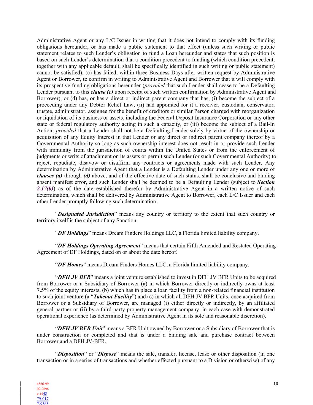 4866-99 02-2696 v.1548 79-017 7-9565 10 Administrative Agent or any L/C Issuer in writing that it does not intend to comply with its funding obligations hereunder, or has made a public statement to that effect (unless such writing or public statement relates to such Lender’s obligation to fund a Loan hereunder and states that such position is based on such Lender’s determination that a condition precedent to funding (which condition precedent, together with any applicable default, shall be specifically identified in such writing or public statement) cannot be satisfied), (c) has failed, within three Business Days after written request by Administrative Agent or Borrower, to confirm in writing to Administrative Agent and Borrower that it will comply with its prospective funding obligations hereunder (provided that such Lender shall cease to be a Defaulting Lender pursuant to this clause (c) upon receipt of such written confirmation by Administrative Agent and Borrower), or (d) has, or has a direct or indirect parent company that has, (i) become the subject of a proceeding under any Debtor Relief Law, (ii) had appointed for it a receiver, custodian, conservator, trustee, administrator, assignee for the benefit of creditors or similar Person charged with reorganization or liquidation of its business or assets, including the Federal Deposit Insurance Corporation or any other state or federal regulatory authority acting in such a capacity, or (iii) become the subject of a Bail-In Action; provided that a Lender shall not be a Defaulting Lender solely by virtue of the ownership or acquisition of any Equity Interest in that Lender or any direct or indirect parent company thereof by a Governmental Authority so long as such ownership interest does not result in or provide such Lender with immunity from the jurisdiction of courts within the United States or from the enforcement of judgments or writs of attachment on its assets or permit such Lender (or such Governmental Authority) to reject, repudiate, disavow or disaffirm any contracts or agreements made with such Lender. Any determination by Administrative Agent that a Lender is a Defaulting Lender under any one or more of clauses (a) through (d) above, and of the effective date of such status, shall be conclusive and binding absent manifest error, and such Lender shall be deemed to be a Defaulting Lender (subject to Section 2.17(b)) as of the date established therefor by Administrative Agent in a written notice of such determination, which shall be delivered by Administrative Agent to Borrower, each L/C Issuer and each other Lender promptly following such determination. “Designated Jurisdiction” means any country or territory to the extent that such country or territory itself is the subject of any Sanction. “DF Holdings” means Dream Finders Holdings LLC, a Florida limited liability company. “DF Holdings Operating Agreement” means that certain Fifth Amended and Restated Operating Agreement of DF Holdings, dated on or about the date hereof. “DF Homes” means Dream Finders Homes LLC, a Florida limited liability company. “DFH JV BFR” means a joint venture established to invest in DFH JV BFR Units to be acquired from Borrower or a Subsidiary of Borrower (a) in which Borrower directly or indirectly owns at least 7.5% of the equity interests, (b) which has in place a loan facility from a non-related financial institution to such joint venture (a “Takeout Facility”) and (c) in which all DFH JV BFR Units, once acquired from Borrower or a Subsidiary of Borrower, are managed (i) either directly or indirectly, by an affiliated general partner or (ii) by a third-party property management company, in each case with demonstrated operational experience (as determined by Administrative Agent in its sole and reasonable discretion). “DFH JV BFR Unit” means a BFR Unit owned by Borrower or a Subsidiary of Borrower that is under construction or completed and that is under a binding sale and purchase contract between Borrower and a DFH JV-BFR. “Disposition” or “Dispose” means the sale, transfer, license, lease or other disposition (in one transaction or in a series of transactions and whether effected pursuant to a Division or otherwise) of any