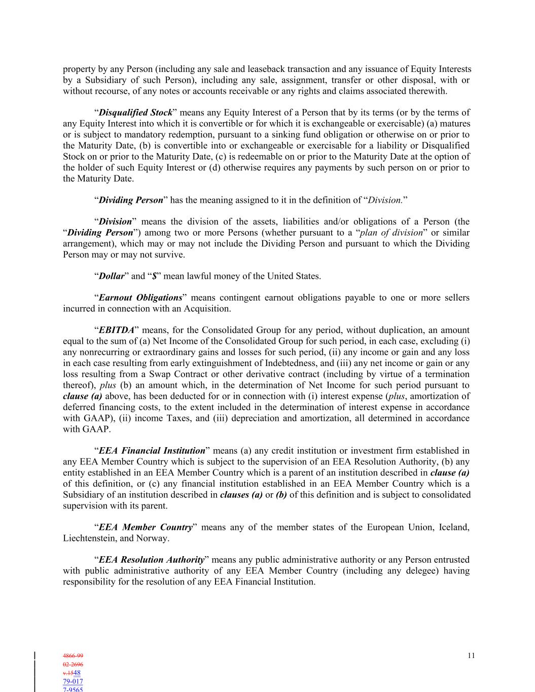 4866-99 02-2696 v.1548 79-017 7-9565 11 property by any Person (including any sale and leaseback transaction and any issuance of Equity Interests by a Subsidiary of such Person), including any sale, assignment, transfer or other disposal, with or without recourse, of any notes or accounts receivable or any rights and claims associated therewith. “Disqualified Stock” means any Equity Interest of a Person that by its terms (or by the terms of any Equity Interest into which it is convertible or for which it is exchangeable or exercisable) (a) matures or is subject to mandatory redemption, pursuant to a sinking fund obligation or otherwise on or prior to the Maturity Date, (b) is convertible into or exchangeable or exercisable for a liability or Disqualified Stock on or prior to the Maturity Date, (c) is redeemable on or prior to the Maturity Date at the option of the holder of such Equity Interest or (d) otherwise requires any payments by such person on or prior to the Maturity Date. “Dividing Person” has the meaning assigned to it in the definition of “Division.” “Division” means the division of the assets, liabilities and/or obligations of a Person (the “Dividing Person”) among two or more Persons (whether pursuant to a “plan of division” or similar arrangement), which may or may not include the Dividing Person and pursuant to which the Dividing Person may or may not survive. “Dollar” and “$” mean lawful money of the United States. “Earnout Obligations” means contingent earnout obligations payable to one or more sellers incurred in connection with an Acquisition. “EBITDA” means, for the Consolidated Group for any period, without duplication, an amount equal to the sum of (a) Net Income of the Consolidated Group for such period, in each case, excluding (i) any nonrecurring or extraordinary gains and losses for such period, (ii) any income or gain and any loss in each case resulting from early extinguishment of Indebtedness, and (iii) any net income or gain or any loss resulting from a Swap Contract or other derivative contract (including by virtue of a termination thereof), plus (b) an amount which, in the determination of Net Income for such period pursuant to clause (a) above, has been deducted for or in connection with (i) interest expense (plus, amortization of deferred financing costs, to the extent included in the determination of interest expense in accordance with GAAP), (ii) income Taxes, and (iii) depreciation and amortization, all determined in accordance with GAAP. “EEA Financial Institution” means (a) any credit institution or investment firm established in any EEA Member Country which is subject to the supervision of an EEA Resolution Authority, (b) any entity established in an EEA Member Country which is a parent of an institution described in clause (a) of this definition, or (c) any financial institution established in an EEA Member Country which is a Subsidiary of an institution described in clauses (a) or (b) of this definition and is subject to consolidated supervision with its parent. “EEA Member Country” means any of the member states of the European Union, Iceland, Liechtenstein, and Norway. “EEA Resolution Authority” means any public administrative authority or any Person entrusted with public administrative authority of any EEA Member Country (including any delegee) having responsibility for the resolution of any EEA Financial Institution.