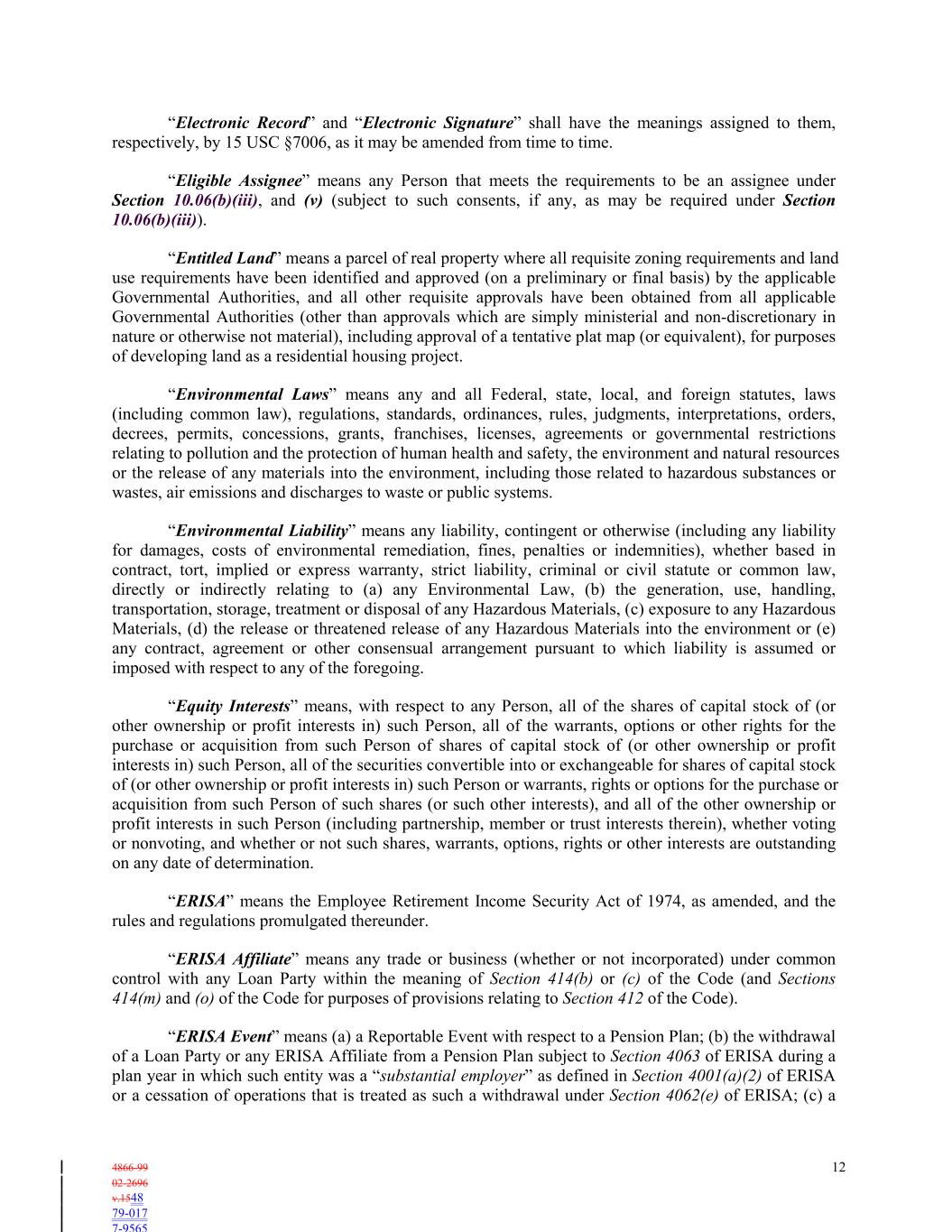 4866-99 02-2696 v.1548 79-017 7-9565 12 “Electronic Record” and “Electronic Signature” shall have the meanings assigned to them, respectively, by 15 USC §7006, as it may be amended from time to time. “Eligible Assignee” means any Person that meets the requirements to be an assignee under Section 10.06(b)(iii), and (v) (subject to such consents, if any, as may be required under Section 10.06(b)(iii)). “Entitled Land” means a parcel of real property where all requisite zoning requirements and land use requirements have been identified and approved (on a preliminary or final basis) by the applicable Governmental Authorities, and all other requisite approvals have been obtained from all applicable Governmental Authorities (other than approvals which are simply ministerial and non-discretionary in nature or otherwise not material), including approval of a tentative plat map (or equivalent), for purposes of developing land as a residential housing project. “Environmental Laws” means any and all Federal, state, local, and foreign statutes, laws (including common law), regulations, standards, ordinances, rules, judgments, interpretations, orders, decrees, permits, concessions, grants, franchises, licenses, agreements or governmental restrictions relating to pollution and the protection of human health and safety, the environment and natural resources or the release of any materials into the environment, including those related to hazardous substances or wastes, air emissions and discharges to waste or public systems. “Environmental Liability” means any liability, contingent or otherwise (including any liability for damages, costs of environmental remediation, fines, penalties or indemnities), whether based in contract, tort, implied or express warranty, strict liability, criminal or civil statute or common law, directly or indirectly relating to (a) any Environmental Law, (b) the generation, use, handling, transportation, storage, treatment or disposal of any Hazardous Materials, (c) exposure to any Hazardous Materials, (d) the release or threatened release of any Hazardous Materials into the environment or (e) any contract, agreement or other consensual arrangement pursuant to which liability is assumed or imposed with respect to any of the foregoing. “Equity Interests” means, with respect to any Person, all of the shares of capital stock of (or other ownership or profit interests in) such Person, all of the warrants, options or other rights for the purchase or acquisition from such Person of shares of capital stock of (or other ownership or profit interests in) such Person, all of the securities convertible into or exchangeable for shares of capital stock of (or other ownership or profit interests in) such Person or warrants, rights or options for the purchase or acquisition from such Person of such shares (or such other interests), and all of the other ownership or profit interests in such Person (including partnership, member or trust interests therein), whether voting or nonvoting, and whether or not such shares, warrants, options, rights or other interests are outstanding on any date of determination. “ERISA” means the Employee Retirement Income Security Act of 1974, as amended, and the rules and regulations promulgated thereunder. “ERISA Affiliate” means any trade or business (whether or not incorporated) under common control with any Loan Party within the meaning of Section 414(b) or (c) of the Code (and Sections 414(m) and (o) of the Code for purposes of provisions relating to Section 412 of the Code). “ERISA Event” means (a) a Reportable Event with respect to a Pension Plan; (b) the withdrawal of a Loan Party or any ERISA Affiliate from a Pension Plan subject to Section 4063 of ERISA during a plan year in which such entity was a “substantial employer” as defined in Section 4001(a)(2) of ERISA or a cessation of operations that is treated as such a withdrawal under Section 4062(e) of ERISA; (c) a