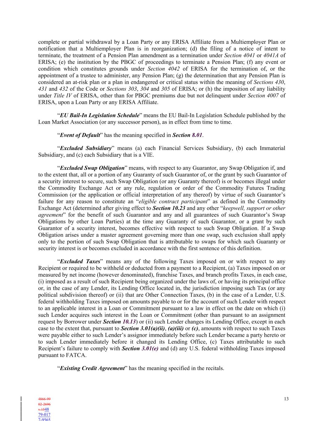 4866-99 02-2696 v.1548 79-017 7-9565 13 complete or partial withdrawal by a Loan Party or any ERISA Affiliate from a Multiemployer Plan or notification that a Multiemployer Plan is in reorganization; (d) the filing of a notice of intent to terminate, the treatment of a Pension Plan amendment as a termination under Section 4041 or 4041A of ERISA; (e) the institution by the PBGC of proceedings to terminate a Pension Plan; (f) any event or condition which constitutes grounds under Section 4042 of ERISA for the termination of, or the appointment of a trustee to administer, any Pension Plan; (g) the determination that any Pension Plan is considered an at-risk plan or a plan in endangered or critical status within the meaning of Sections 430, 431 and 432 of the Code or Sections 303, 304 and 305 of ERISA; or (h) the imposition of any liability under Title IV of ERISA, other than for PBGC premiums due but not delinquent under Section 4007 of ERISA, upon a Loan Party or any ERISA Affiliate. “EU Bail-In Legislation Schedule” means the EU Bail-In Legislation Schedule published by the Loan Market Association (or any successor person), as in effect from time to time. “Event of Default” has the meaning specified in Section 8.01. “Excluded Subsidiary” means (a) each Financial Services Subsidiary, (b) each Immaterial Subsidiary, and (c) each Subsidiary that is a VIE. “Excluded Swap Obligation” means, with respect to any Guarantor, any Swap Obligation if, and to the extent that, all or a portion of any Guaranty of such Guarantor of, or the grant by such Guarantor of a security interest to secure, such Swap Obligation (or any Guaranty thereof) is or becomes illegal under the Commodity Exchange Act or any rule, regulation or order of the Commodity Futures Trading Commission (or the application or official interpretation of any thereof) by virtue of such Guarantor’s failure for any reason to constitute an “eligible contract participant” as defined in the Commodity Exchange Act (determined after giving effect to Section 10.23 and any other “keepwell, support or other agreement” for the benefit of such Guarantor and any and all guarantees of such Guarantor’s Swap Obligations by other Loan Parties) at the time any Guaranty of such Guarantor, or a grant by such Guarantor of a security interest, becomes effective with respect to such Swap Obligation. If a Swap Obligation arises under a master agreement governing more than one swap, such exclusion shall apply only to the portion of such Swap Obligation that is attributable to swaps for which such Guaranty or security interest is or becomes excluded in accordance with the first sentence of this definition. “Excluded Taxes” means any of the following Taxes imposed on or with respect to any Recipient or required to be withheld or deducted from a payment to a Recipient, (a) Taxes imposed on or measured by net income (however denominated), franchise Taxes, and branch profits Taxes, in each case, (i) imposed as a result of such Recipient being organized under the laws of, or having its principal office or, in the case of any Lender, its Lending Office located in, the jurisdiction imposing such Tax (or any political subdivision thereof) or (ii) that are Other Connection Taxes, (b) in the case of a Lender, U.S. federal withholding Taxes imposed on amounts payable to or for the account of such Lender with respect to an applicable interest in a Loan or Commitment pursuant to a law in effect on the date on which (i) such Lender acquires such interest in the Loan or Commitment (other than pursuant to an assignment request by Borrower under Section 10.13) or (ii) such Lender changes its Lending Office, except in each case to the extent that, pursuant to Section 3.01(a)(ii), (a)(iii) or (c), amounts with respect to such Taxes were payable either to such Lender’s assignor immediately before such Lender became a party hereto or to such Lender immediately before it changed its Lending Office, (c) Taxes attributable to such Recipient’s failure to comply with Section 3.01(e) and (d) any U.S. federal withholding Taxes imposed pursuant to FATCA. “Existing Credit Agreement” has the meaning specified in the recitals.