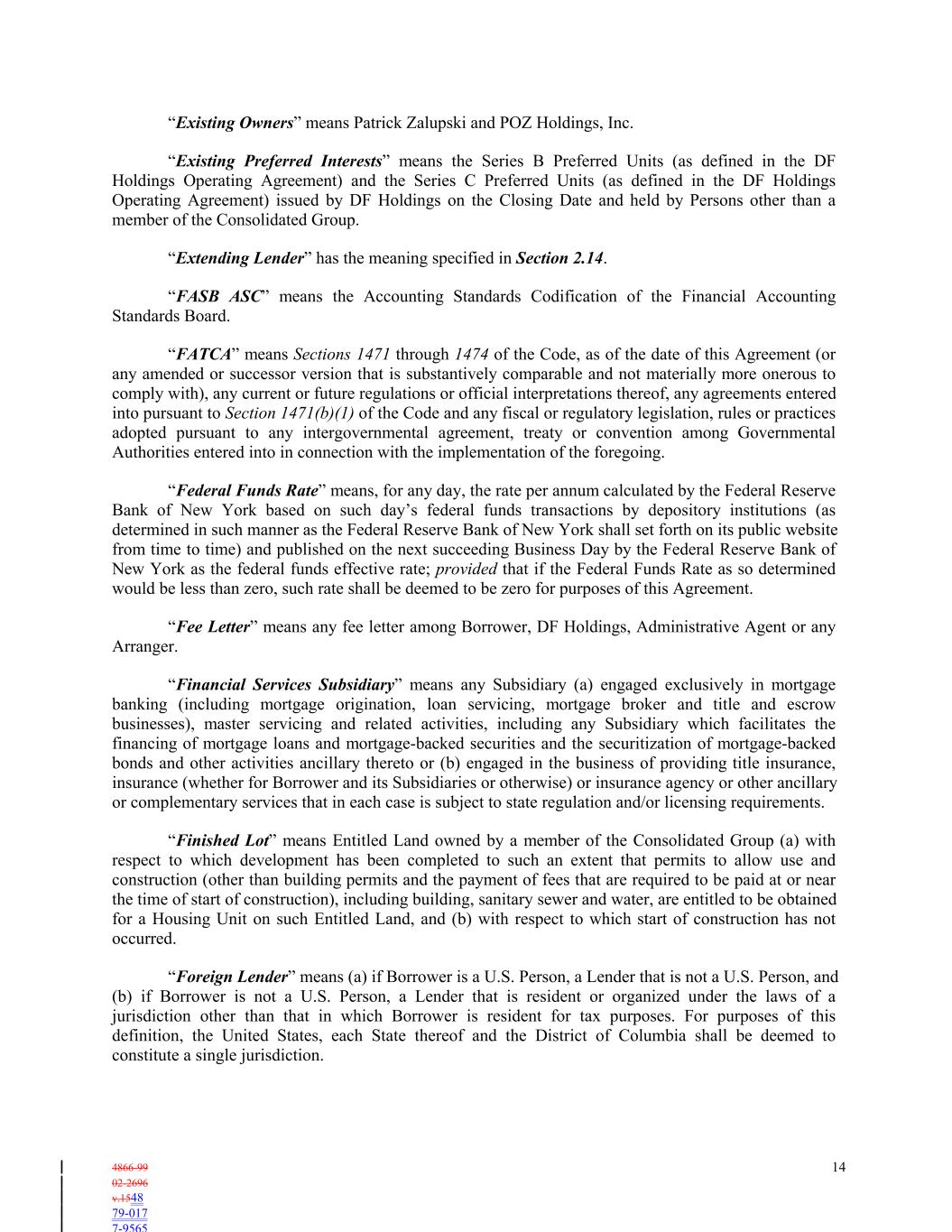 4866-99 02-2696 v.1548 79-017 7-9565 14 “Existing Owners” means Patrick Zalupski and POZ Holdings, Inc. “Existing Preferred Interests” means the Series B Preferred Units (as defined in the DF Holdings Operating Agreement) and the Series C Preferred Units (as defined in the DF Holdings Operating Agreement) issued by DF Holdings on the Closing Date and held by Persons other than a member of the Consolidated Group. “Extending Lender” has the meaning specified in Section 2.14. “FASB ASC” means the Accounting Standards Codification of the Financial Accounting Standards Board. “FATCA” means Sections 1471 through 1474 of the Code, as of the date of this Agreement (or any amended or successor version that is substantively comparable and not materially more onerous to comply with), any current or future regulations or official interpretations thereof, any agreements entered into pursuant to Section 1471(b)(1) of the Code and any fiscal or regulatory legislation, rules or practices adopted pursuant to any intergovernmental agreement, treaty or convention among Governmental Authorities entered into in connection with the implementation of the foregoing. “Federal Funds Rate” means, for any day, the rate per annum calculated by the Federal Reserve Bank of New York based on such day’s federal funds transactions by depository institutions (as determined in such manner as the Federal Reserve Bank of New York shall set forth on its public website from time to time) and published on the next succeeding Business Day by the Federal Reserve Bank of New York as the federal funds effective rate; provided that if the Federal Funds Rate as so determined would be less than zero, such rate shall be deemed to be zero for purposes of this Agreement. “Fee Letter” means any fee letter among Borrower, DF Holdings, Administrative Agent or any Arranger. “Financial Services Subsidiary” means any Subsidiary (a) engaged exclusively in mortgage banking (including mortgage origination, loan servicing, mortgage broker and title and escrow businesses), master servicing and related activities, including any Subsidiary which facilitates the financing of mortgage loans and mortgage-backed securities and the securitization of mortgage-backed bonds and other activities ancillary thereto or (b) engaged in the business of providing title insurance, insurance (whether for Borrower and its Subsidiaries or otherwise) or insurance agency or other ancillary or complementary services that in each case is subject to state regulation and/or licensing requirements. “Finished Lot” means Entitled Land owned by a member of the Consolidated Group (a) with respect to which development has been completed to such an extent that permits to allow use and construction (other than building permits and the payment of fees that are required to be paid at or near the time of start of construction), including building, sanitary sewer and water, are entitled to be obtained for a Housing Unit on such Entitled Land, and (b) with respect to which start of construction has not occurred. “Foreign Lender” means (a) if Borrower is a U.S. Person, a Lender that is not a U.S. Person, and (b) if Borrower is not a U.S. Person, a Lender that is resident or organized under the laws of a jurisdiction other than that in which Borrower is resident for tax purposes. For purposes of this definition, the United States, each State thereof and the District of Columbia shall be deemed to constitute a single jurisdiction.