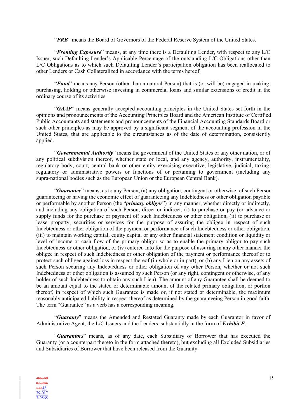 4866-99 02-2696 v.1548 79-017 7-9565 15 “FRB” means the Board of Governors of the Federal Reserve System of the United States. “Fronting Exposure” means, at any time there is a Defaulting Lender, with respect to any L/C Issuer, such Defaulting Lender’s Applicable Percentage of the outstanding L/C Obligations other than L/C Obligations as to which such Defaulting Lender’s participation obligation has been reallocated to other Lenders or Cash Collateralized in accordance with the terms hereof. “Fund” means any Person (other than a natural Person) that is (or will be) engaged in making, purchasing, holding or otherwise investing in commercial loans and similar extensions of credit in the ordinary course of its activities. “GAAP” means generally accepted accounting principles in the United States set forth in the opinions and pronouncements of the Accounting Principles Board and the American Institute of Certified Public Accountants and statements and pronouncements of the Financial Accounting Standards Board or such other principles as may be approved by a significant segment of the accounting profession in the United States, that are applicable to the circumstances as of the date of determination, consistently applied. “Governmental Authority” means the government of the United States or any other nation, or of any political subdivision thereof, whether state or local, and any agency, authority, instrumentality, regulatory body, court, central bank or other entity exercising executive, legislative, judicial, taxing, regulatory or administrative powers or functions of or pertaining to government (including any supra-national bodies such as the European Union or the European Central Bank). “Guarantee” means, as to any Person, (a) any obligation, contingent or otherwise, of such Person guaranteeing or having the economic effect of guaranteeing any Indebtedness or other obligation payable or performable by another Person (the “primary obligor”) in any manner, whether directly or indirectly, and including any obligation of such Person, direct or indirect, (i) to purchase or pay (or advance or supply funds for the purchase or payment of) such Indebtedness or other obligation, (ii) to purchase or lease property, securities or services for the purpose of assuring the obligee in respect of such Indebtedness or other obligation of the payment or performance of such Indebtedness or other obligation, (iii) to maintain working capital, equity capital or any other financial statement condition or liquidity or level of income or cash flow of the primary obligor so as to enable the primary obligor to pay such Indebtedness or other obligation, or (iv) entered into for the purpose of assuring in any other manner the obligee in respect of such Indebtedness or other obligation of the payment or performance thereof or to protect such obligee against loss in respect thereof (in whole or in part), or (b) any Lien on any assets of such Person securing any Indebtedness or other obligation of any other Person, whether or not such Indebtedness or other obligation is assumed by such Person (or any right, contingent or otherwise, of any holder of such Indebtedness to obtain any such Lien). The amount of any Guarantee shall be deemed to be an amount equal to the stated or determinable amount of the related primary obligation, or portion thereof, in respect of which such Guarantee is made or, if not stated or determinable, the maximum reasonably anticipated liability in respect thereof as determined by the guaranteeing Person in good faith. The term “Guarantee” as a verb has a corresponding meaning. “Guaranty” means the Amended and Restated Guaranty made by each Guarantor in favor of Administrative Agent, the L/C Issuers and the Lenders, substantially in the form of Exhibit F. “Guarantors” means, as of any date, each Subsidiary of Borrower that has executed the Guaranty (or a counterpart thereto in the form attached thereto), but excluding all Excluded Subsidiaries and Subsidiaries of Borrower that have been released from the Guaranty.