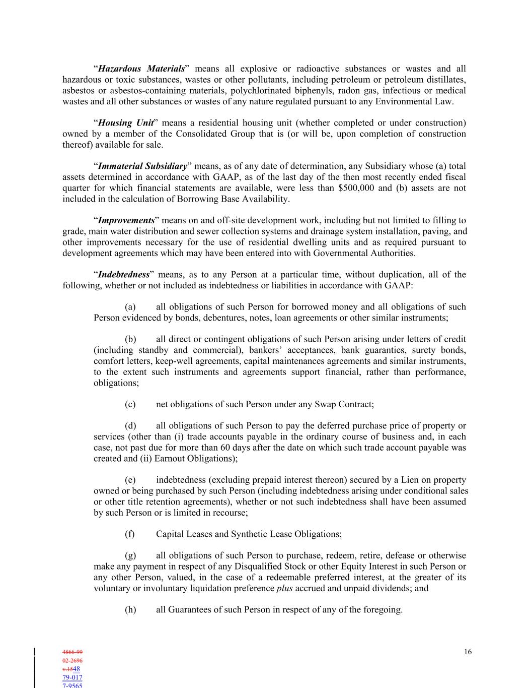 4866-99 02-2696 v.1548 79-017 7-9565 16 “Hazardous Materials” means all explosive or radioactive substances or wastes and all hazardous or toxic substances, wastes or other pollutants, including petroleum or petroleum distillates, asbestos or asbestos-containing materials, polychlorinated biphenyls, radon gas, infectious or medical wastes and all other substances or wastes of any nature regulated pursuant to any Environmental Law. “Housing Unit” means a residential housing unit (whether completed or under construction) owned by a member of the Consolidated Group that is (or will be, upon completion of construction thereof) available for sale. “Immaterial Subsidiary” means, as of any date of determination, any Subsidiary whose (a) total assets determined in accordance with GAAP, as of the last day of the then most recently ended fiscal quarter for which financial statements are available, were less than $500,000 and (b) assets are not included in the calculation of Borrowing Base Availability. “Improvements” means on and off-site development work, including but not limited to filling to grade, main water distribution and sewer collection systems and drainage system installation, paving, and other improvements necessary for the use of residential dwelling units and as required pursuant to development agreements which may have been entered into with Governmental Authorities. “Indebtedness” means, as to any Person at a particular time, without duplication, all of the following, whether or not included as indebtedness or liabilities in accordance with GAAP: (a) all obligations of such Person for borrowed money and all obligations of such Person evidenced by bonds, debentures, notes, loan agreements or other similar instruments; (b) all direct or contingent obligations of such Person arising under letters of credit (including standby and commercial), bankers’ acceptances, bank guaranties, surety bonds, comfort letters, keep-well agreements, capital maintenances agreements and similar instruments, to the extent such instruments and agreements support financial, rather than performance, obligations; (c) net obligations of such Person under any Swap Contract; (d) all obligations of such Person to pay the deferred purchase price of property or services (other than (i) trade accounts payable in the ordinary course of business and, in each case, not past due for more than 60 days after the date on which such trade account payable was created and (ii) Earnout Obligations); (e) indebtedness (excluding prepaid interest thereon) secured by a Lien on property owned or being purchased by such Person (including indebtedness arising under conditional sales or other title retention agreements), whether or not such indebtedness shall have been assumed by such Person or is limited in recourse; (f) Capital Leases and Synthetic Lease Obligations; (g) all obligations of such Person to purchase, redeem, retire, defease or otherwise make any payment in respect of any Disqualified Stock or other Equity Interest in such Person or any other Person, valued, in the case of a redeemable preferred interest, at the greater of its voluntary or involuntary liquidation preference plus accrued and unpaid dividends; and (h) all Guarantees of such Person in respect of any of the foregoing.