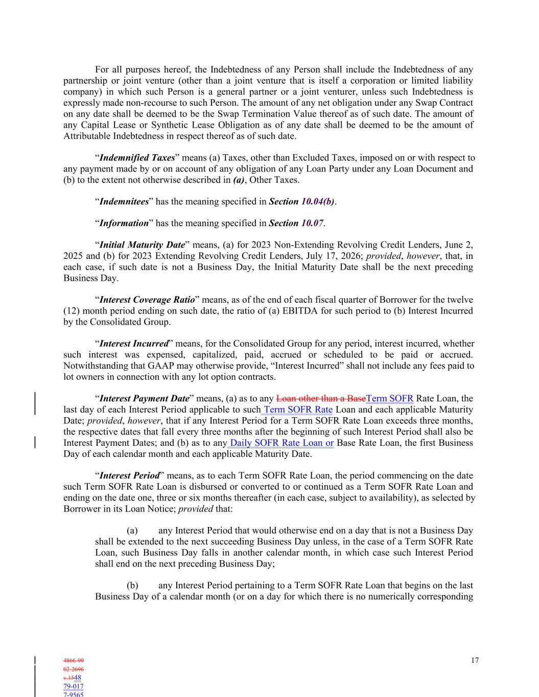 4866-99 02-2696 v.1548 79-017 7-9565 17 For all purposes hereof, the Indebtedness of any Person shall include the Indebtedness of any partnership or joint venture (other than a joint venture that is itself a corporation or limited liability company) in which such Person is a general partner or a joint venturer, unless such Indebtedness is expressly made non-recourse to such Person. The amount of any net obligation under any Swap Contract on any date shall be deemed to be the Swap Termination Value thereof as of such date. The amount of any Capital Lease or Synthetic Lease Obligation as of any date shall be deemed to be the amount of Attributable Indebtedness in respect thereof as of such date. “Indemnified Taxes” means (a) Taxes, other than Excluded Taxes, imposed on or with respect to any payment made by or on account of any obligation of any Loan Party under any Loan Document and (b) to the extent not otherwise described in (a), Other Taxes. “Indemnitees” has the meaning specified in Section 10.04(b). “Information” has the meaning specified in Section 10.07. “Initial Maturity Date” means, (a) for 2023 Non-Extending Revolving Credit Lenders, June 2, 2025 and (b) for 2023 Extending Revolving Credit Lenders, July 17, 2026; provided, however, that, in each case, if such date is not a Business Day, the Initial Maturity Date shall be the next preceding Business Day. “Interest Coverage Ratio” means, as of the end of each fiscal quarter of Borrower for the twelve (12) month period ending on such date, the ratio of (a) EBITDA for such period to (b) Interest Incurred by the Consolidated Group. “Interest Incurred” means, for the Consolidated Group for any period, interest incurred, whether such interest was expensed, capitalized, paid, accrued or scheduled to be paid or accrued. Notwithstanding that GAAP may otherwise provide, “Interest Incurred” shall not include any fees paid to lot owners in connection with any lot option contracts. “Interest Payment Date” means, (a) as to any Loan other than a BaseTerm SOFR Rate Loan, the last day of each Interest Period applicable to such Term SOFR Rate Loan and each applicable Maturity Date; provided, however, that if any Interest Period for a Term SOFR Rate Loan exceeds three months, the respective dates that fall every three months after the beginning of such Interest Period shall also be Interest Payment Dates; and (b) as to any Daily SOFR Rate Loan or Base Rate Loan, the first Business Day of each calendar month and each applicable Maturity Date. “Interest Period” means, as to each Term SOFR Rate Loan, the period commencing on the date such Term SOFR Rate Loan is disbursed or converted to or continued as a Term SOFR Rate Loan and ending on the date one, three or six months thereafter (in each case, subject to availability), as selected by Borrower in its Loan Notice; provided that: (a) any Interest Period that would otherwise end on a day that is not a Business Day shall be extended to the next succeeding Business Day unless, in the case of a Term SOFR Rate Loan, such Business Day falls in another calendar month, in which case such Interest Period shall end on the next preceding Business Day; (b) any Interest Period pertaining to a Term SOFR Rate Loan that begins on the last Business Day of a calendar month (or on a day for which there is no numerically corresponding