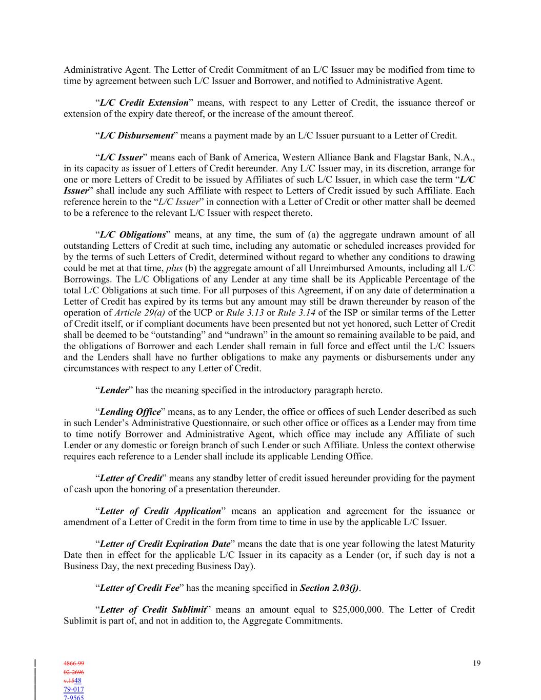 4866-99 02-2696 v.1548 79-017 7-9565 19 Administrative Agent. The Letter of Credit Commitment of an L/C Issuer may be modified from time to time by agreement between such L/C Issuer and Borrower, and notified to Administrative Agent. “L/C Credit Extension” means, with respect to any Letter of Credit, the issuance thereof or extension of the expiry date thereof, or the increase of the amount thereof. “L/C Disbursement” means a payment made by an L/C Issuer pursuant to a Letter of Credit. “L/C Issuer” means each of Bank of America, Western Alliance Bank and Flagstar Bank, N.A., in its capacity as issuer of Letters of Credit hereunder. Any L/C Issuer may, in its discretion, arrange for one or more Letters of Credit to be issued by Affiliates of such L/C Issuer, in which case the term “L/C Issuer” shall include any such Affiliate with respect to Letters of Credit issued by such Affiliate. Each reference herein to the “L/C Issuer” in connection with a Letter of Credit or other matter shall be deemed to be a reference to the relevant L/C Issuer with respect thereto. “L/C Obligations” means, at any time, the sum of (a) the aggregate undrawn amount of all outstanding Letters of Credit at such time, including any automatic or scheduled increases provided for by the terms of such Letters of Credit, determined without regard to whether any conditions to drawing could be met at that time, plus (b) the aggregate amount of all Unreimbursed Amounts, including all L/C Borrowings. The L/C Obligations of any Lender at any time shall be its Applicable Percentage of the total L/C Obligations at such time. For all purposes of this Agreement, if on any date of determination a Letter of Credit has expired by its terms but any amount may still be drawn thereunder by reason of the operation of Article 29(a) of the UCP or Rule 3.13 or Rule 3.14 of the ISP or similar terms of the Letter of Credit itself, or if compliant documents have been presented but not yet honored, such Letter of Credit shall be deemed to be “outstanding” and “undrawn” in the amount so remaining available to be paid, and the obligations of Borrower and each Lender shall remain in full force and effect until the L/C Issuers and the Lenders shall have no further obligations to make any payments or disbursements under any circumstances with respect to any Letter of Credit. “Lender” has the meaning specified in the introductory paragraph hereto. “Lending Office” means, as to any Lender, the office or offices of such Lender described as such in such Lender’s Administrative Questionnaire, or such other office or offices as a Lender may from time to time notify Borrower and Administrative Agent, which office may include any Affiliate of such Lender or any domestic or foreign branch of such Lender or such Affiliate. Unless the context otherwise requires each reference to a Lender shall include its applicable Lending Office. “Letter of Credit” means any standby letter of credit issued hereunder providing for the payment of cash upon the honoring of a presentation thereunder. “Letter of Credit Application” means an application and agreement for the issuance or amendment of a Letter of Credit in the form from time to time in use by the applicable L/C Issuer. “Letter of Credit Expiration Date” means the date that is one year following the latest Maturity Date then in effect for the applicable L/C Issuer in its capacity as a Lender (or, if such day is not a Business Day, the next preceding Business Day). “Letter of Credit Fee” has the meaning specified in Section 2.03(j). “Letter of Credit Sublimit” means an amount equal to $25,000,000. The Letter of Credit Sublimit is part of, and not in addition to, the Aggregate Commitments.
