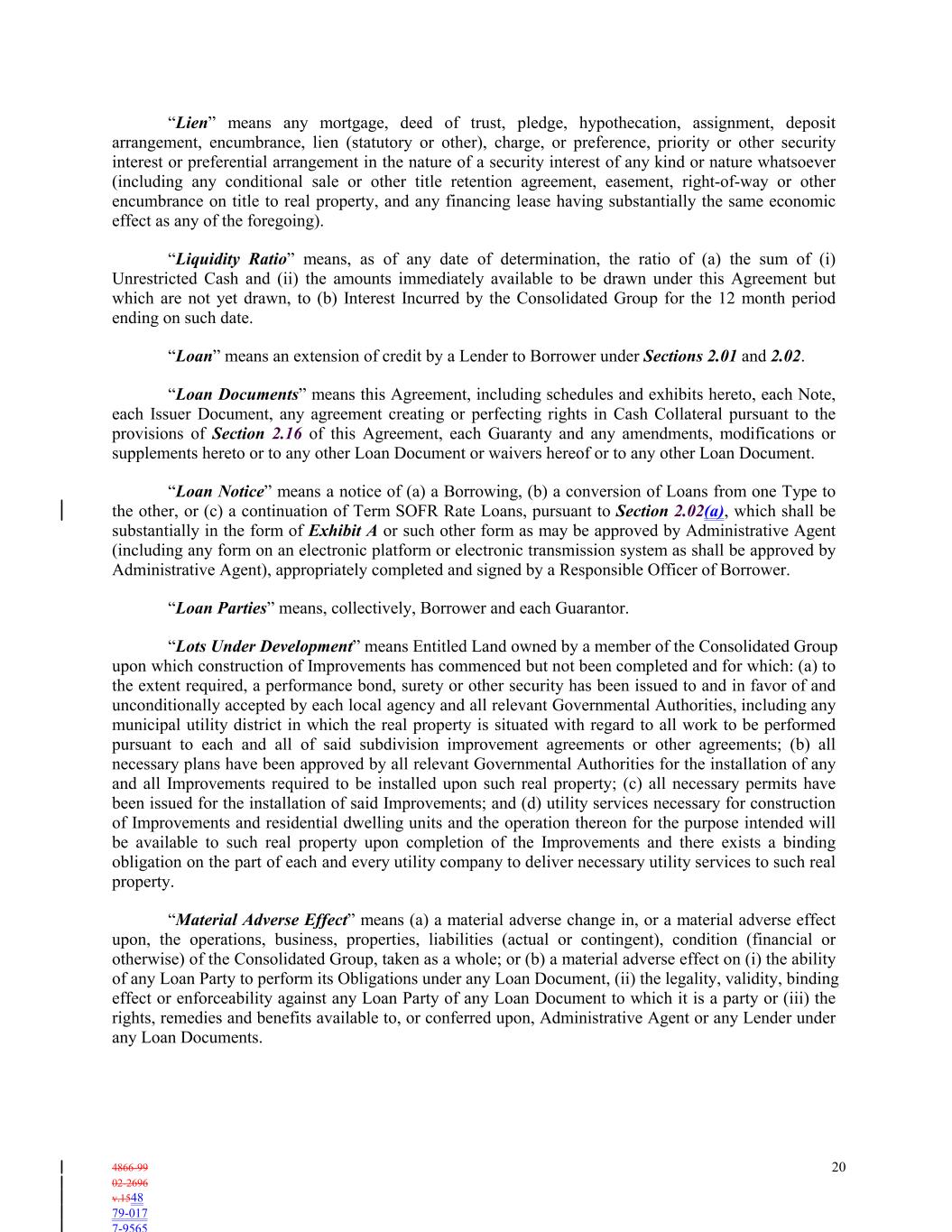 4866-99 02-2696 v.1548 79-017 7-9565 20 “Lien” means any mortgage, deed of trust, pledge, hypothecation, assignment, deposit arrangement, encumbrance, lien (statutory or other), charge, or preference, priority or other security interest or preferential arrangement in the nature of a security interest of any kind or nature whatsoever (including any conditional sale or other title retention agreement, easement, right-of-way or other encumbrance on title to real property, and any financing lease having substantially the same economic effect as any of the foregoing). “Liquidity Ratio” means, as of any date of determination, the ratio of (a) the sum of (i) Unrestricted Cash and (ii) the amounts immediately available to be drawn under this Agreement but which are not yet drawn, to (b) Interest Incurred by the Consolidated Group for the 12 month period ending on such date. “Loan” means an extension of credit by a Lender to Borrower under Sections 2.01 and 2.02. “Loan Documents” means this Agreement, including schedules and exhibits hereto, each Note, each Issuer Document, any agreement creating or perfecting rights in Cash Collateral pursuant to the provisions of Section 2.16 of this Agreement, each Guaranty and any amendments, modifications or supplements hereto or to any other Loan Document or waivers hereof or to any other Loan Document. “Loan Notice” means a notice of (a) a Borrowing, (b) a conversion of Loans from one Type to the other, or (c) a continuation of Term SOFR Rate Loans, pursuant to Section 2.02(a), which shall be substantially in the form of Exhibit A or such other form as may be approved by Administrative Agent (including any form on an electronic platform or electronic transmission system as shall be approved by Administrative Agent), appropriately completed and signed by a Responsible Officer of Borrower. “Loan Parties” means, collectively, Borrower and each Guarantor. “Lots Under Development” means Entitled Land owned by a member of the Consolidated Group upon which construction of Improvements has commenced but not been completed and for which: (a) to the extent required, a performance bond, surety or other security has been issued to and in favor of and unconditionally accepted by each local agency and all relevant Governmental Authorities, including any municipal utility district in which the real property is situated with regard to all work to be performed pursuant to each and all of said subdivision improvement agreements or other agreements; (b) all necessary plans have been approved by all relevant Governmental Authorities for the installation of any and all Improvements required to be installed upon such real property; (c) all necessary permits have been issued for the installation of said Improvements; and (d) utility services necessary for construction of Improvements and residential dwelling units and the operation thereon for the purpose intended will be available to such real property upon completion of the Improvements and there exists a binding obligation on the part of each and every utility company to deliver necessary utility services to such real property. “Material Adverse Effect” means (a) a material adverse change in, or a material adverse effect upon, the operations, business, properties, liabilities (actual or contingent), condition (financial or otherwise) of the Consolidated Group, taken as a whole; or (b) a material adverse effect on (i) the ability of any Loan Party to perform its Obligations under any Loan Document, (ii) the legality, validity, binding effect or enforceability against any Loan Party of any Loan Document to which it is a party or (iii) the rights, remedies and benefits available to, or conferred upon, Administrative Agent or any Lender under any Loan Documents.
