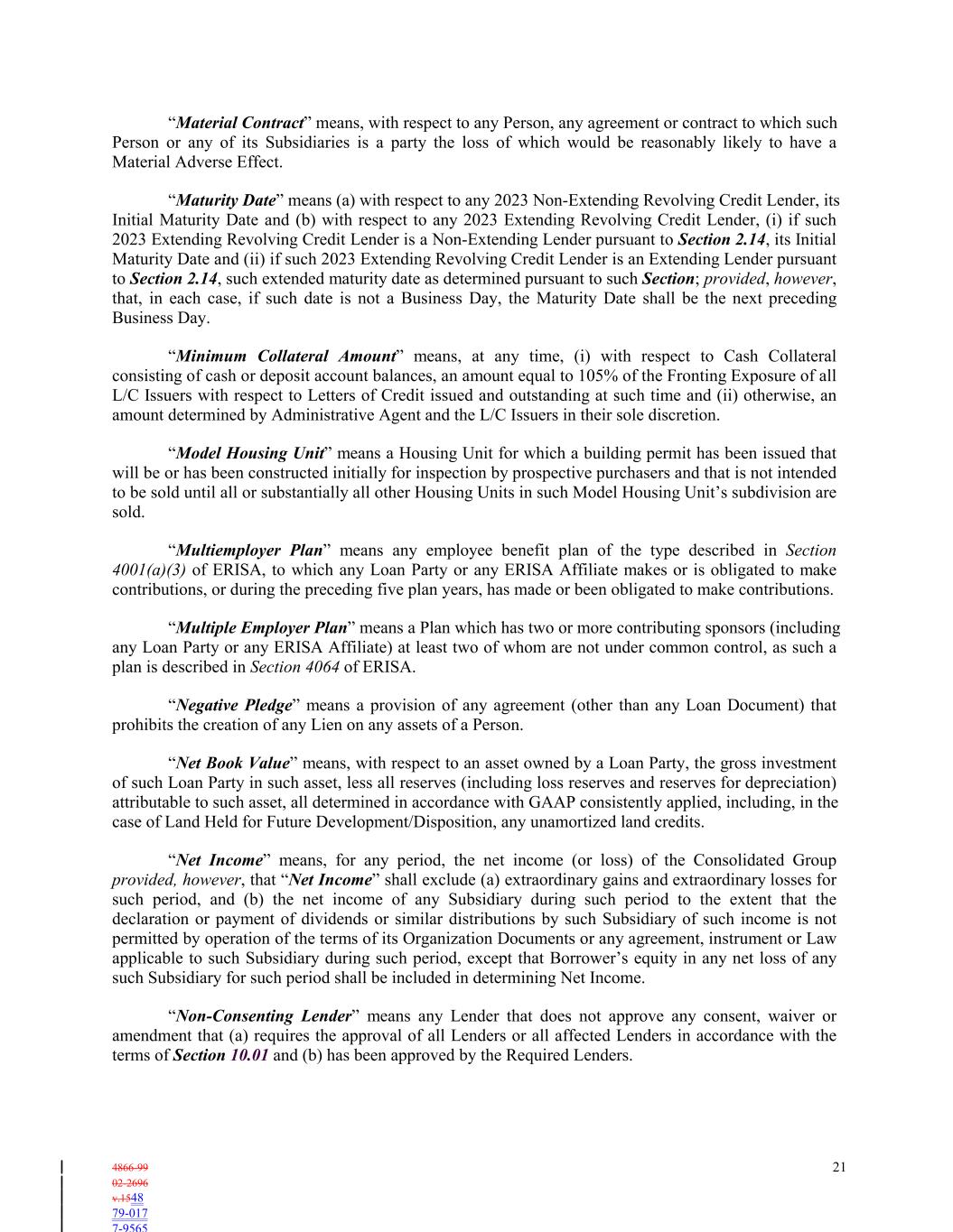 4866-99 02-2696 v.1548 79-017 7-9565 21 “Material Contract” means, with respect to any Person, any agreement or contract to which such Person or any of its Subsidiaries is a party the loss of which would be reasonably likely to have a Material Adverse Effect. “Maturity Date” means (a) with respect to any 2023 Non-Extending Revolving Credit Lender, its Initial Maturity Date and (b) with respect to any 2023 Extending Revolving Credit Lender, (i) if such 2023 Extending Revolving Credit Lender is a Non-Extending Lender pursuant to Section 2.14, its Initial Maturity Date and (ii) if such 2023 Extending Revolving Credit Lender is an Extending Lender pursuant to Section 2.14, such extended maturity date as determined pursuant to such Section; provided, however, that, in each case, if such date is not a Business Day, the Maturity Date shall be the next preceding Business Day. “Minimum Collateral Amount” means, at any time, (i) with respect to Cash Collateral consisting of cash or deposit account balances, an amount equal to 105% of the Fronting Exposure of all L/C Issuers with respect to Letters of Credit issued and outstanding at such time and (ii) otherwise, an amount determined by Administrative Agent and the L/C Issuers in their sole discretion. “Model Housing Unit” means a Housing Unit for which a building permit has been issued that will be or has been constructed initially for inspection by prospective purchasers and that is not intended to be sold until all or substantially all other Housing Units in such Model Housing Unit’s subdivision are sold. “Multiemployer Plan” means any employee benefit plan of the type described in Section 4001(a)(3) of ERISA, to which any Loan Party or any ERISA Affiliate makes or is obligated to make contributions, or during the preceding five plan years, has made or been obligated to make contributions. “Multiple Employer Plan” means a Plan which has two or more contributing sponsors (including any Loan Party or any ERISA Affiliate) at least two of whom are not under common control, as such a plan is described in Section 4064 of ERISA. “Negative Pledge” means a provision of any agreement (other than any Loan Document) that prohibits the creation of any Lien on any assets of a Person. “Net Book Value” means, with respect to an asset owned by a Loan Party, the gross investment of such Loan Party in such asset, less all reserves (including loss reserves and reserves for depreciation) attributable to such asset, all determined in accordance with GAAP consistently applied, including, in the case of Land Held for Future Development/Disposition, any unamortized land credits. “Net Income” means, for any period, the net income (or loss) of the Consolidated Group provided, however, that “Net Income” shall exclude (a) extraordinary gains and extraordinary losses for such period, and (b) the net income of any Subsidiary during such period to the extent that the declaration or payment of dividends or similar distributions by such Subsidiary of such income is not permitted by operation of the terms of its Organization Documents or any agreement, instrument or Law applicable to such Subsidiary during such period, except that Borrower’s equity in any net loss of any such Subsidiary for such period shall be included in determining Net Income. “Non-Consenting Lender” means any Lender that does not approve any consent, waiver or amendment that (a) requires the approval of all Lenders or all affected Lenders in accordance with the terms of Section 10.01 and (b) has been approved by the Required Lenders.