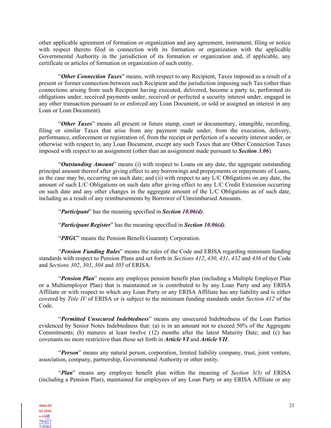 4866-99 02-2696 v.1548 79-017 7-9565 23 other applicable agreement of formation or organization and any agreement, instrument, filing or notice with respect thereto filed in connection with its formation or organization with the applicable Governmental Authority in the jurisdiction of its formation or organization and, if applicable, any certificate or articles of formation or organization of such entity. “Other Connection Taxes” means, with respect to any Recipient, Taxes imposed as a result of a present or former connection between such Recipient and the jurisdiction imposing such Tax (other than connections arising from such Recipient having executed, delivered, become a party to, performed its obligations under, received payments under, received or perfected a security interest under, engaged in any other transaction pursuant to or enforced any Loan Document, or sold or assigned an interest in any Loan or Loan Document). “Other Taxes” means all present or future stamp, court or documentary, intangible, recording, filing or similar Taxes that arise from any payment made under, from the execution, delivery, performance, enforcement or registration of, from the receipt or perfection of a security interest under, or otherwise with respect to, any Loan Document, except any such Taxes that are Other Connection Taxes imposed with respect to an assignment (other than an assignment made pursuant to Section 3.06). “Outstanding Amount” means (i) with respect to Loans on any date, the aggregate outstanding principal amount thereof after giving effect to any borrowings and prepayments or repayments of Loans, as the case may be, occurring on such date; and (ii) with respect to any L/C Obligations on any date, the amount of such L/C Obligations on such date after giving effect to any L/C Credit Extension occurring on such date and any other changes in the aggregate amount of the L/C Obligations as of such date, including as a result of any reimbursements by Borrower of Unreimbursed Amounts. “Participant” has the meaning specified in Section 10.06(d). “Participant Register” has the meaning specified in Section 10.06(d). “PBGC” means the Pension Benefit Guaranty Corporation. “Pension Funding Rules” means the rules of the Code and ERISA regarding minimum funding standards with respect to Pension Plans and set forth in Sections 412, 430, 431, 432 and 436 of the Code and Sections 302, 303, 304 and 305 of ERISA. “Pension Plan” means any employee pension benefit plan (including a Multiple Employer Plan or a Multiemployer Plan) that is maintained or is contributed to by any Loan Party and any ERISA Affiliate or with respect to which any Loan Party or any ERISA Affiliate has any liability and is either covered by Title IV of ERISA or is subject to the minimum funding standards under Section 412 of the Code. “Permitted Unsecured Indebtedness” means any unsecured Indebtedness of the Loan Parties evidenced by Senior Notes Indebtedness that: (a) is in an amount not to exceed 50% of the Aggregate Commitments; (b) matures at least twelve (12) months after the latest Maturity Date; and (c) has covenants no more restrictive than those set forth in Article VI and Article VII. “Person” means any natural person, corporation, limited liability company, trust, joint venture, association, company, partnership, Governmental Authority or other entity. “Plan” means any employee benefit plan within the meaning of Section 3(3) of ERISA (including a Pension Plan), maintained for employees of any Loan Party or any ERISA Affiliate or any