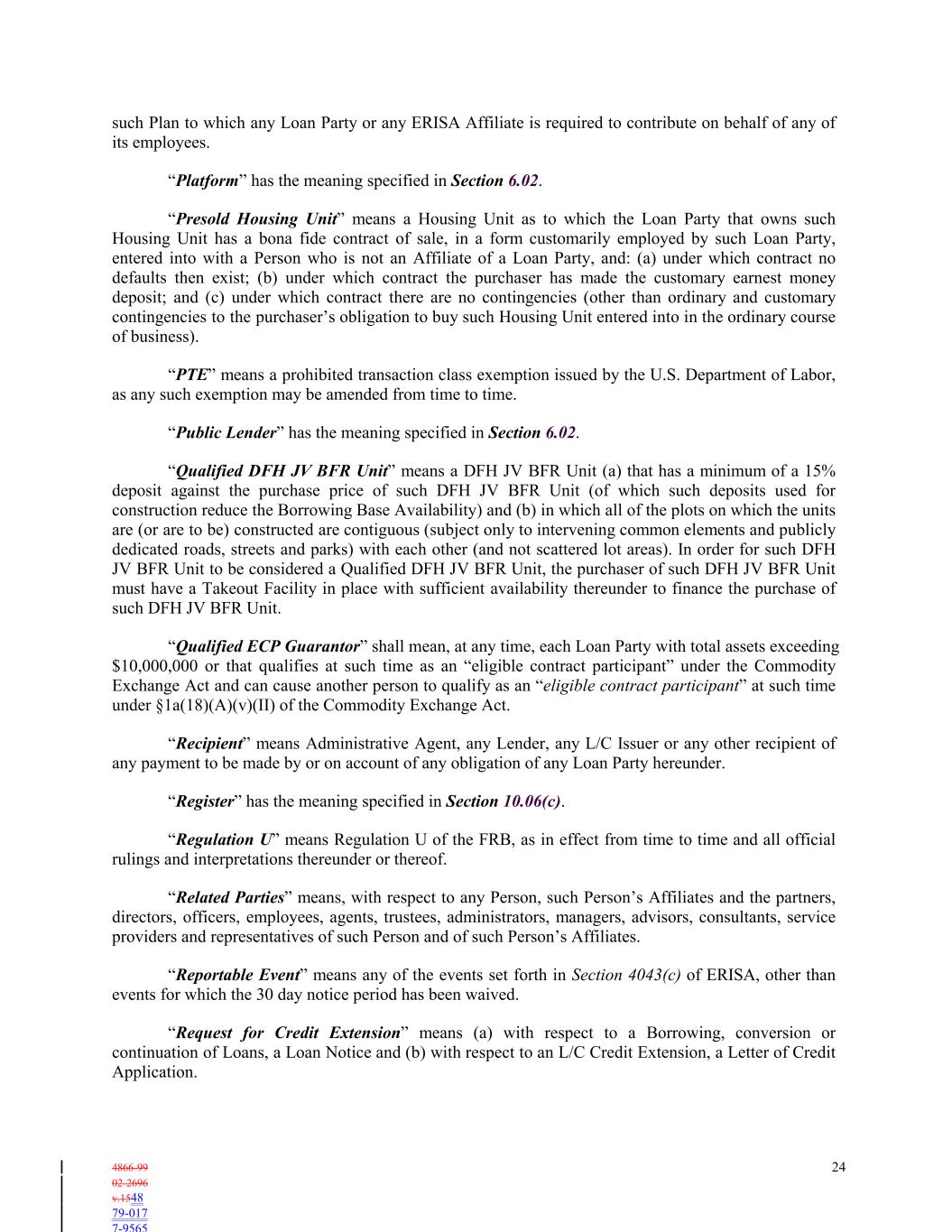 4866-99 02-2696 v.1548 79-017 7-9565 24 such Plan to which any Loan Party or any ERISA Affiliate is required to contribute on behalf of any of its employees. “Platform” has the meaning specified in Section 6.02. “Presold Housing Unit” means a Housing Unit as to which the Loan Party that owns such Housing Unit has a bona fide contract of sale, in a form customarily employed by such Loan Party, entered into with a Person who is not an Affiliate of a Loan Party, and: (a) under which contract no defaults then exist; (b) under which contract the purchaser has made the customary earnest money deposit; and (c) under which contract there are no contingencies (other than ordinary and customary contingencies to the purchaser’s obligation to buy such Housing Unit entered into in the ordinary course of business). “PTE” means a prohibited transaction class exemption issued by the U.S. Department of Labor, as any such exemption may be amended from time to time. “Public Lender” has the meaning specified in Section 6.02. “Qualified DFH JV BFR Unit” means a DFH JV BFR Unit (a) that has a minimum of a 15% deposit against the purchase price of such DFH JV BFR Unit (of which such deposits used for construction reduce the Borrowing Base Availability) and (b) in which all of the plots on which the units are (or are to be) constructed are contiguous (subject only to intervening common elements and publicly dedicated roads, streets and parks) with each other (and not scattered lot areas). In order for such DFH JV BFR Unit to be considered a Qualified DFH JV BFR Unit, the purchaser of such DFH JV BFR Unit must have a Takeout Facility in place with sufficient availability thereunder to finance the purchase of such DFH JV BFR Unit. “Qualified ECP Guarantor” shall mean, at any time, each Loan Party with total assets exceeding $10,000,000 or that qualifies at such time as an “eligible contract participant” under the Commodity Exchange Act and can cause another person to qualify as an “eligible contract participant” at such time under §1a(18)(A)(v)(II) of the Commodity Exchange Act. “Recipient” means Administrative Agent, any Lender, any L/C Issuer or any other recipient of any payment to be made by or on account of any obligation of any Loan Party hereunder. “Register” has the meaning specified in Section 10.06(c). “Regulation U” means Regulation U of the FRB, as in effect from time to time and all official rulings and interpretations thereunder or thereof. “Related Parties” means, with respect to any Person, such Person’s Affiliates and the partners, directors, officers, employees, agents, trustees, administrators, managers, advisors, consultants, service providers and representatives of such Person and of such Person’s Affiliates. “Reportable Event” means any of the events set forth in Section 4043(c) of ERISA, other than events for which the 30 day notice period has been waived. “Request for Credit Extension” means (a) with respect to a Borrowing, conversion or continuation of Loans, a Loan Notice and (b) with respect to an L/C Credit Extension, a Letter of Credit Application.