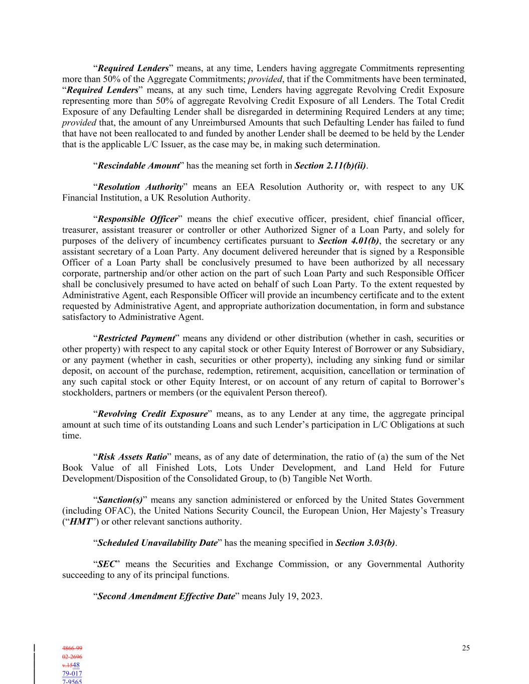 4866-99 02-2696 v.1548 79-017 7-9565 25 “Required Lenders” means, at any time, Lenders having aggregate Commitments representing more than 50% of the Aggregate Commitments; provided, that if the Commitments have been terminated, “Required Lenders” means, at any such time, Lenders having aggregate Revolving Credit Exposure representing more than 50% of aggregate Revolving Credit Exposure of all Lenders. The Total Credit Exposure of any Defaulting Lender shall be disregarded in determining Required Lenders at any time; provided that, the amount of any Unreimbursed Amounts that such Defaulting Lender has failed to fund that have not been reallocated to and funded by another Lender shall be deemed to be held by the Lender that is the applicable L/C Issuer, as the case may be, in making such determination. “Rescindable Amount” has the meaning set forth in Section 2.11(b)(ii). “Resolution Authority” means an EEA Resolution Authority or, with respect to any UK Financial Institution, a UK Resolution Authority. “Responsible Officer” means the chief executive officer, president, chief financial officer, treasurer, assistant treasurer or controller or other Authorized Signer of a Loan Party, and solely for purposes of the delivery of incumbency certificates pursuant to Section 4.01(b), the secretary or any assistant secretary of a Loan Party. Any document delivered hereunder that is signed by a Responsible Officer of a Loan Party shall be conclusively presumed to have been authorized by all necessary corporate, partnership and/or other action on the part of such Loan Party and such Responsible Officer shall be conclusively presumed to have acted on behalf of such Loan Party. To the extent requested by Administrative Agent, each Responsible Officer will provide an incumbency certificate and to the extent requested by Administrative Agent, and appropriate authorization documentation, in form and substance satisfactory to Administrative Agent. “Restricted Payment” means any dividend or other distribution (whether in cash, securities or other property) with respect to any capital stock or other Equity Interest of Borrower or any Subsidiary, or any payment (whether in cash, securities or other property), including any sinking fund or similar deposit, on account of the purchase, redemption, retirement, acquisition, cancellation or termination of any such capital stock or other Equity Interest, or on account of any return of capital to Borrower’s stockholders, partners or members (or the equivalent Person thereof). “Revolving Credit Exposure” means, as to any Lender at any time, the aggregate principal amount at such time of its outstanding Loans and such Lender’s participation in L/C Obligations at such time. “Risk Assets Ratio” means, as of any date of determination, the ratio of (a) the sum of the Net Book Value of all Finished Lots, Lots Under Development, and Land Held for Future Development/Disposition of the Consolidated Group, to (b) Tangible Net Worth. “Sanction(s)” means any sanction administered or enforced by the United States Government (including OFAC), the United Nations Security Council, the European Union, Her Majesty’s Treasury (“HMT”) or other relevant sanctions authority. “Scheduled Unavailability Date” has the meaning specified in Section 3.03(b). “SEC” means the Securities and Exchange Commission, or any Governmental Authority succeeding to any of its principal functions. “Second Amendment Effective Date” means July 19, 2023.