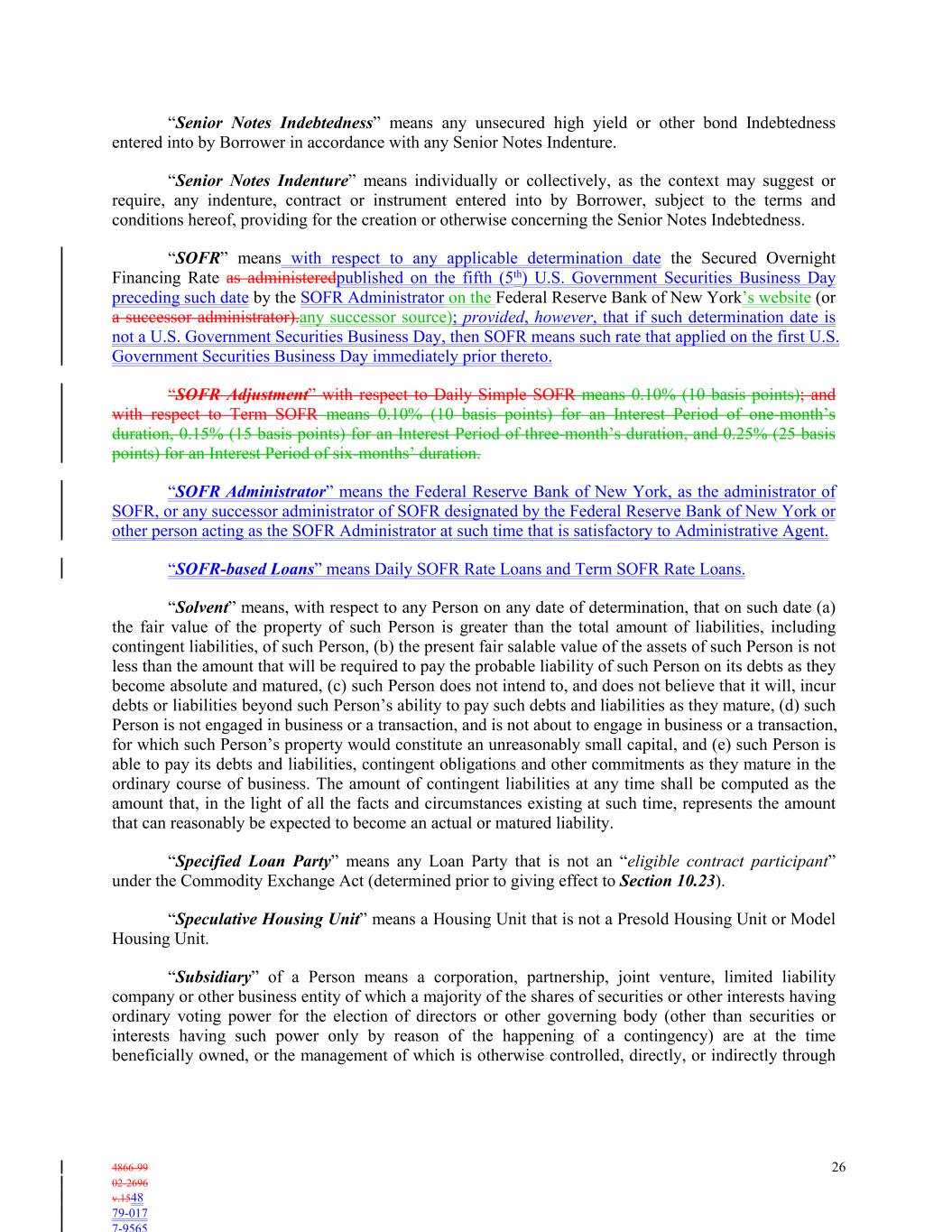 4866-99 02-2696 v.1548 79-017 7-9565 26 “Senior Notes Indebtedness” means any unsecured high yield or other bond Indebtedness entered into by Borrower in accordance with any Senior Notes Indenture. “Senior Notes Indenture” means individually or collectively, as the context may suggest or require, any indenture, contract or instrument entered into by Borrower, subject to the terms and conditions hereof, providing for the creation or otherwise concerning the Senior Notes Indebtedness. “SOFR” means with respect to any applicable determination date the Secured Overnight Financing Rate as administeredpublished on the fifth (5th) U.S. Government Securities Business Day preceding such date by the SOFR Administrator on the Federal Reserve Bank of New York’s website (or a successor administrator).any successor source); provided, however, that if such determination date is not a U.S. Government Securities Business Day, then SOFR means such rate that applied on the first U.S. Government Securities Business Day immediately prior thereto. “SOFR Adjustment” with respect to Daily Simple SOFR means 0.10% (10 basis points); and with respect to Term SOFR means 0.10% (10 basis points) for an Interest Period of one-month’s duration, 0.15% (15 basis points) for an Interest Period of three-month’s duration, and 0.25% (25 basis points) for an Interest Period of six-months’ duration. “SOFR Administrator” means the Federal Reserve Bank of New York, as the administrator of SOFR, or any successor administrator of SOFR designated by the Federal Reserve Bank of New York or other person acting as the SOFR Administrator at such time that is satisfactory to Administrative Agent. “SOFR-based Loans” means Daily SOFR Rate Loans and Term SOFR Rate Loans. “Solvent” means, with respect to any Person on any date of determination, that on such date (a) the fair value of the property of such Person is greater than the total amount of liabilities, including contingent liabilities, of such Person, (b) the present fair salable value of the assets of such Person is not less than the amount that will be required to pay the probable liability of such Person on its debts as they become absolute and matured, (c) such Person does not intend to, and does not believe that it will, incur debts or liabilities beyond such Person’s ability to pay such debts and liabilities as they mature, (d) such Person is not engaged in business or a transaction, and is not about to engage in business or a transaction, for which such Person’s property would constitute an unreasonably small capital, and (e) such Person is able to pay its debts and liabilities, contingent obligations and other commitments as they mature in the ordinary course of business. The amount of contingent liabilities at any time shall be computed as the amount that, in the light of all the facts and circumstances existing at such time, represents the amount that can reasonably be expected to become an actual or matured liability. “Specified Loan Party” means any Loan Party that is not an “eligible contract participant” under the Commodity Exchange Act (determined prior to giving effect to Section 10.23). “Speculative Housing Unit” means a Housing Unit that is not a Presold Housing Unit or Model Housing Unit. “Subsidiary” of a Person means a corporation, partnership, joint venture, limited liability company or other business entity of which a majority of the shares of securities or other interests having ordinary voting power for the election of directors or other governing body (other than securities or interests having such power only by reason of the happening of a contingency) are at the time beneficially owned, or the management of which is otherwise controlled, directly, or indirectly through