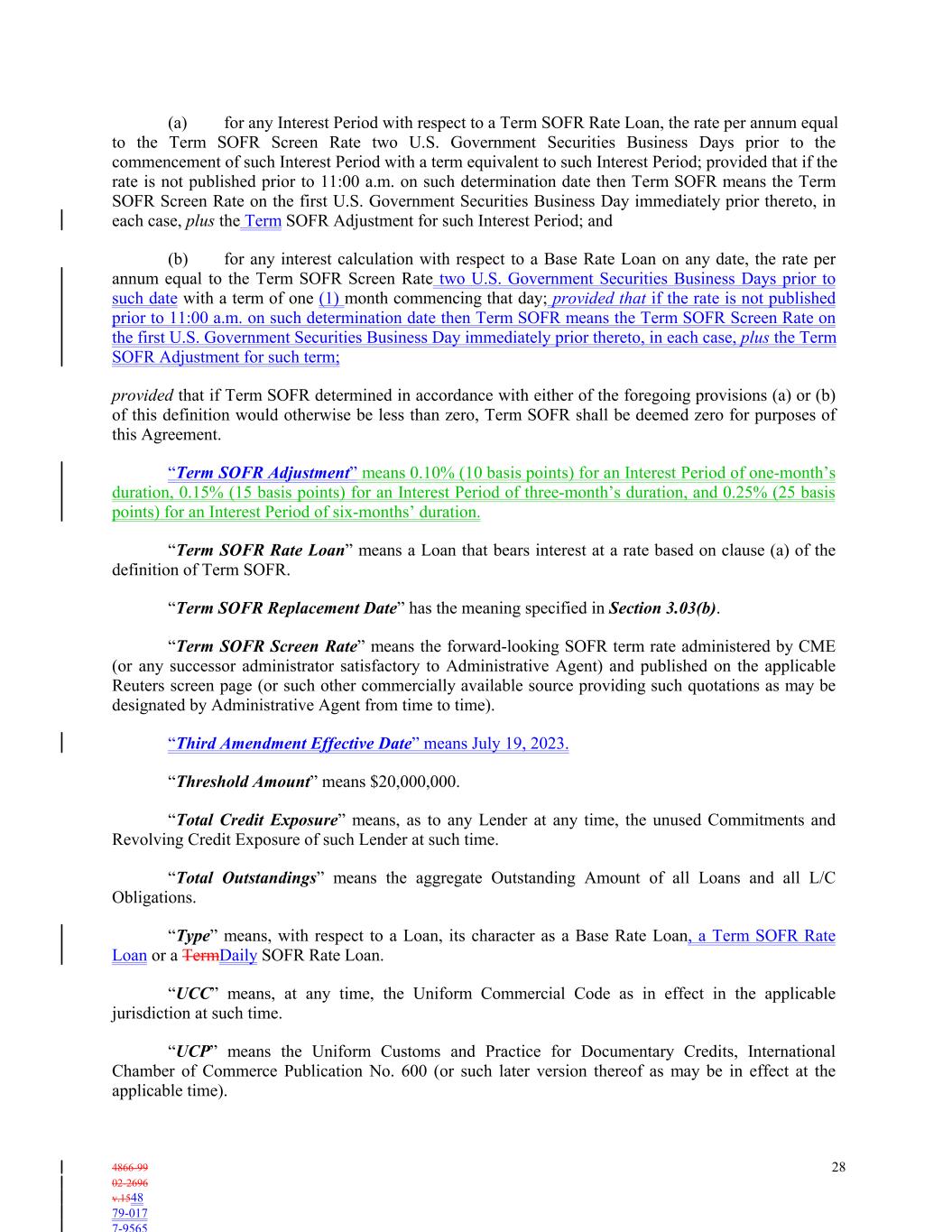 4866-99 02-2696 v.1548 79-017 7-9565 28 (a) for any Interest Period with respect to a Term SOFR Rate Loan, the rate per annum equal to the Term SOFR Screen Rate two U.S. Government Securities Business Days prior to the commencement of such Interest Period with a term equivalent to such Interest Period; provided that if the rate is not published prior to 11:00 a.m. on such determination date then Term SOFR means the Term SOFR Screen Rate on the first U.S. Government Securities Business Day immediately prior thereto, in each case, plus the Term SOFR Adjustment for such Interest Period; and (b) for any interest calculation with respect to a Base Rate Loan on any date, the rate per annum equal to the Term SOFR Screen Rate two U.S. Government Securities Business Days prior to such date with a term of one (1) month commencing that day; provided that if the rate is not published prior to 11:00 a.m. on such determination date then Term SOFR means the Term SOFR Screen Rate on the first U.S. Government Securities Business Day immediately prior thereto, in each case, plus the Term SOFR Adjustment for such term; provided that if Term SOFR determined in accordance with either of the foregoing provisions (a) or (b) of this definition would otherwise be less than zero, Term SOFR shall be deemed zero for purposes of this Agreement. “Term SOFR Adjustment” means 0.10% (10 basis points) for an Interest Period of one-month’s duration, 0.15% (15 basis points) for an Interest Period of three-month’s duration, and 0.25% (25 basis points) for an Interest Period of six-months’ duration. “Term SOFR Rate Loan” means a Loan that bears interest at a rate based on clause (a) of the definition of Term SOFR. “Term SOFR Replacement Date” has the meaning specified in Section 3.03(b). “Term SOFR Screen Rate” means the forward-looking SOFR term rate administered by CME (or any successor administrator satisfactory to Administrative Agent) and published on the applicable Reuters screen page (or such other commercially available source providing such quotations as may be designated by Administrative Agent from time to time). “Third Amendment Effective Date” means July 19, 2023. “Threshold Amount” means $20,000,000. “Total Credit Exposure” means, as to any Lender at any time, the unused Commitments and Revolving Credit Exposure of such Lender at such time. “Total Outstandings” means the aggregate Outstanding Amount of all Loans and all L/C Obligations. “Type” means, with respect to a Loan, its character as a Base Rate Loan, a Term SOFR Rate Loan or a TermDaily SOFR Rate Loan. “UCC” means, at any time, the Uniform Commercial Code as in effect in the applicable jurisdiction at such time. “UCP” means the Uniform Customs and Practice for Documentary Credits, International Chamber of Commerce Publication No. 600 (or such later version thereof as may be in effect at the applicable time).