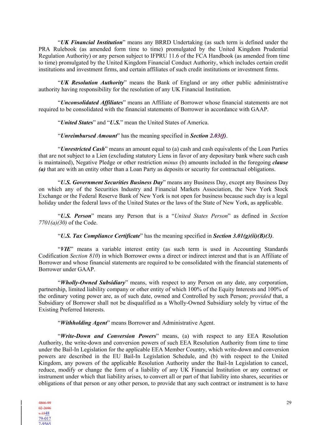 4866-99 02-2696 v.1548 79-017 7-9565 29 “UK Financial Institution” means any BRRD Undertaking (as such term is defined under the PRA Rulebook (as amended form time to time) promulgated by the United Kingdom Prudential Regulation Authority) or any person subject to IFPRU 11.6 of the FCA Handbook (as amended from time to time) promulgated by the United Kingdom Financial Conduct Authority, which includes certain credit institutions and investment firms, and certain affiliates of such credit institutions or investment firms. “UK Resolution Authority” means the Bank of England or any other public administrative authority having responsibility for the resolution of any UK Financial Institution. “Unconsolidated Affiliates” means an Affiliate of Borrower whose financial statements are not required to be consolidated with the financial statements of Borrower in accordance with GAAP. “United States” and “U.S.” mean the United States of America. “Unreimbursed Amount” has the meaning specified in Section 2.03(f). “Unrestricted Cash” means an amount equal to (a) cash and cash equivalents of the Loan Parties that are not subject to a Lien (excluding statutory Liens in favor of any depositary bank where such cash is maintained), Negative Pledge or other restriction minus (b) amounts included in the foregoing clause (a) that are with an entity other than a Loan Party as deposits or security for contractual obligations. “U.S. Government Securities Business Day” means any Business Day, except any Business Day on which any of the Securities Industry and Financial Markets Association, the New York Stock Exchange or the Federal Reserve Bank of New York is not open for business because such day is a legal holiday under the federal laws of the United States or the laws of the State of New York, as applicable. “U.S. Person” means any Person that is a “United States Person” as defined in Section 7701(a)(30) of the Code. “U.S. Tax Compliance Certificate” has the meaning specified in Section 3.01(g)(ii)(B)(3). “VIE” means a variable interest entity (as such term is used in Accounting Standards Codification Section 810) in which Borrower owns a direct or indirect interest and that is an Affiliate of Borrower and whose financial statements are required to be consolidated with the financial statements of Borrower under GAAP. “Wholly-Owned Subsidiary” means, with respect to any Person on any date, any corporation, partnership, limited liability company or other entity of which 100% of the Equity Interests and 100% of the ordinary voting power are, as of such date, owned and Controlled by such Person; provided that, a Subsidiary of Borrower shall not be disqualified as a Wholly-Owned Subsidiary solely by virtue of the Existing Preferred Interests. “Withholding Agent” means Borrower and Administrative Agent. “Write-Down and Conversion Powers” means, (a) with respect to any EEA Resolution Authority, the write-down and conversion powers of such EEA Resolution Authority from time to time under the Bail-In Legislation for the applicable EEA Member Country, which write-down and conversion powers are described in the EU Bail-In Legislation Schedule, and (b) with respect to the United Kingdom, any powers of the applicable Resolution Authority under the Bail-In Legislation to cancel, reduce, modify or change the form of a liability of any UK Financial Institution or any contract or instrument under which that liability arises, to convert all or part of that liability into shares, securities or obligations of that person or any other person, to provide that any such contract or instrument is to have