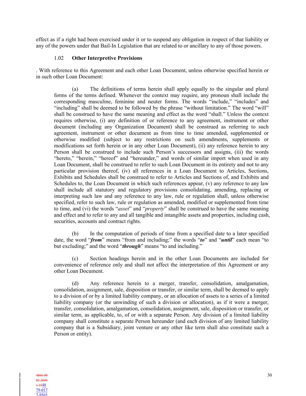 4866-99 02-2696 v.1548 79-017 7-9565 30 effect as if a right had been exercised under it or to suspend any obligation in respect of that liability or any of the powers under that Bail-In Legislation that are related to or ancillary to any of those powers. 1.02 Other Interpretive Provisions . With reference to this Agreement and each other Loan Document, unless otherwise specified herein or in such other Loan Document: (a) The definitions of terms herein shall apply equally to the singular and plural forms of the terms defined. Whenever the context may require, any pronoun shall include the corresponding masculine, feminine and neuter forms. The words “include,” “includes” and “including” shall be deemed to be followed by the phrase “without limitation.” The word “will” shall be construed to have the same meaning and effect as the word “shall.” Unless the context requires otherwise, (i) any definition of or reference to any agreement, instrument or other document (including any Organization Document) shall be construed as referring to such agreement, instrument or other document as from time to time amended, supplemented or otherwise modified (subject to any restrictions on such amendments, supplements or modifications set forth herein or in any other Loan Document), (ii) any reference herein to any Person shall be construed to include such Person’s successors and assigns, (iii) the words “hereto,” “herein,” “hereof” and “hereunder,” and words of similar import when used in any Loan Document, shall be construed to refer to such Loan Document in its entirety and not to any particular provision thereof, (iv) all references in a Loan Document to Articles, Sections, Exhibits and Schedules shall be construed to refer to Articles and Sections of, and Exhibits and Schedules to, the Loan Document in which such references appear, (v) any reference to any law shall include all statutory and regulatory provisions consolidating, amending, replacing or interpreting such law and any reference to any law, rule or regulation shall, unless otherwise specified, refer to such law, rule or regulation as amended, modified or supplemented from time to time, and (vi) the words “asset” and “property” shall be construed to have the same meaning and effect and to refer to any and all tangible and intangible assets and properties, including cash, securities, accounts and contract rights. (b) In the computation of periods of time from a specified date to a later specified date, the word “from” means “from and including;” the words “to” and “until” each mean “to but excluding;” and the word “through” means “to and including.” (c) Section headings herein and in the other Loan Documents are included for convenience of reference only and shall not affect the interpretation of this Agreement or any other Loan Document. (d) Any reference herein to a merger, transfer, consolidation, amalgamation, consolidation, assignment, sale, disposition or transfer, or similar term, shall be deemed to apply to a division of or by a limited liability company, or an allocation of assets to a series of a limited liability company (or the unwinding of such a division or allocation), as if it were a merger, transfer, consolidation, amalgamation, consolidation, assignment, sale, disposition or transfer, or similar term, as applicable, to, of or with a separate Person. Any division of a limited liability company shall constitute a separate Person hereunder (and each division of any limited liability company that is a Subsidiary, joint venture or any other like term shall also constitute such a Person or entity).