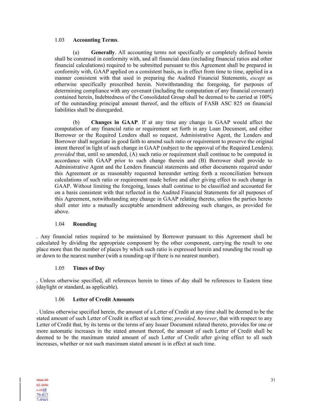 4866-99 02-2696 v.1548 79-017 7-9565 31 1.03 Accounting Terms. (a) Generally. All accounting terms not specifically or completely defined herein shall be construed in conformity with, and all financial data (including financial ratios and other financial calculations) required to be submitted pursuant to this Agreement shall be prepared in conformity with, GAAP applied on a consistent basis, as in effect from time to time, applied in a manner consistent with that used in preparing the Audited Financial Statements, except as otherwise specifically prescribed herein. Notwithstanding the foregoing, for purposes of determining compliance with any covenant (including the computation of any financial covenant) contained herein, Indebtedness of the Consolidated Group shall be deemed to be carried at 100% of the outstanding principal amount thereof, and the effects of FASB ASC 825 on financial liabilities shall be disregarded. (b) Changes in GAAP. If at any time any change in GAAP would affect the computation of any financial ratio or requirement set forth in any Loan Document, and either Borrower or the Required Lenders shall so request, Administrative Agent, the Lenders and Borrower shall negotiate in good faith to amend such ratio or requirement to preserve the original intent thereof in light of such change in GAAP (subject to the approval of the Required Lenders); provided that, until so amended, (A) such ratio or requirement shall continue to be computed in accordance with GAAP prior to such change therein and (B) Borrower shall provide to Administrative Agent and the Lenders financial statements and other documents required under this Agreement or as reasonably requested hereunder setting forth a reconciliation between calculations of such ratio or requirement made before and after giving effect to such change in GAAP. Without limiting the foregoing, leases shall continue to be classified and accounted for on a basis consistent with that reflected in the Audited Financial Statements for all purposes of this Agreement, notwithstanding any change in GAAP relating thereto, unless the parties hereto shall enter into a mutually acceptable amendment addressing such changes, as provided for above. 1.04 Rounding . Any financial ratios required to be maintained by Borrower pursuant to this Agreement shall be calculated by dividing the appropriate component by the other component, carrying the result to one place more than the number of places by which such ratio is expressed herein and rounding the result up or down to the nearest number (with a rounding-up if there is no nearest number). 1.05 Times of Day . Unless otherwise specified, all references herein to times of day shall be references to Eastern time (daylight or standard, as applicable). 1.06 Letter of Credit Amounts . Unless otherwise specified herein, the amount of a Letter of Credit at any time shall be deemed to be the stated amount of such Letter of Credit in effect at such time; provided, however, that with respect to any Letter of Credit that, by its terms or the terms of any Issuer Document related thereto, provides for one or more automatic increases in the stated amount thereof, the amount of such Letter of Credit shall be deemed to be the maximum stated amount of such Letter of Credit after giving effect to all such increases, whether or not such maximum stated amount is in effect at such time.