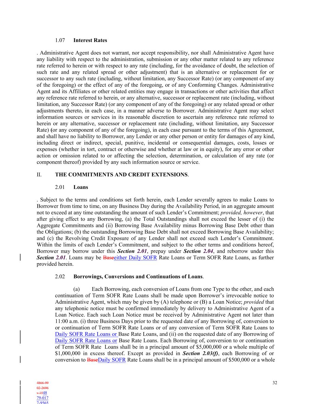 4866-99 02-2696 v.1548 79-017 7-9565 32 1.07 Interest Rates . Administrative Agent does not warrant, nor accept responsibility, nor shall Administrative Agent have any liability with respect to the administration, submission or any other matter related to any reference rate referred to herein or with respect to any rate (including, for the avoidance of doubt, the selection of such rate and any related spread or other adjustment) that is an alternative or replacement for or successor to any such rate (including, without limitation, any Successor Rate) (or any component of any of the foregoing) or the effect of any of the foregoing, or of any Conforming Changes. Administrative Agent and its Affiliates or other related entities may engage in transactions or other activities that affect any reference rate referred to herein, or any alternative, successor or replacement rate (including, without limitation, any Successor Rate) (or any component of any of the foregoing) or any related spread or other adjustments thereto, in each case, in a manner adverse to Borrower. Administrative Agent may select information sources or services in its reasonable discretion to ascertain any reference rate referred to herein or any alternative, successor or replacement rate (including, without limitation, any Successor Rate) (or any component of any of the foregoing), in each case pursuant to the terms of this Agreement, and shall have no liability to Borrower, any Lender or any other person or entity for damages of any kind, including direct or indirect, special, punitive, incidental or consequential damages, costs, losses or expenses (whether in tort, contract or otherwise and whether at law or in equity), for any error or other action or omission related to or affecting the selection, determination, or calculation of any rate (or component thereof) provided by any such information source or service. II. THE COMMITMENTS AND CREDIT EXTENSIONS. 2.01 Loans . Subject to the terms and conditions set forth herein, each Lender severally agrees to make Loans to Borrower from time to time, on any Business Day during the Availability Period, in an aggregate amount not to exceed at any time outstanding the amount of such Lender’s Commitment; provided, however, that after giving effect to any Borrowing, (a) the Total Outstandings shall not exceed the lesser of (i) the Aggregate Commitments and (ii) Borrowing Base Availability minus Borrowing Base Debt other than the Obligations; (b) the outstanding Borrowing Base Debt shall not exceed Borrowing Base Availability; and (c) the Revolving Credit Exposure of any Lender shall not exceed such Lender’s Commitment. Within the limits of each Lender’s Commitment, and subject to the other terms and conditions hereof, Borrower may borrow under this Section 2.01, prepay under Section 2.04, and reborrow under this Section 2.01. Loans may be Baseeither Daily SOFR Rate Loans or Term SOFR Rate Loans, as further provided herein. 2.02 Borrowings, Conversions and Continuations of Loans. (a) Each Borrowing, each conversion of Loans from one Type to the other, and each continuation of Term SOFR Rate Loans shall be made upon Borrower’s irrevocable notice to Administrative Agent, which may be given by (A) telephone or (B) a Loan Notice; provided that any telephonic notice must be confirmed immediately by delivery to Administrative Agent of a Loan Notice. Each such Loan Notice must be received by Administrative Agent not later than 11:00 a.m. (i) three Business Days prior to the requested date of any Borrowing of, conversion to or continuation of Term SOFR Rate Loans or of any conversion of Term SOFR Rate Loans to Daily SOFR Rate Loans or Base Rate Loans, and (ii) on the requested date of any Borrowing of Daily SOFR Rate Loans or Base Rate Loans. Each Borrowing of, conversion to or continuation of Term SOFR Rate Loans shall be in a principal amount of $5,000,000 or a whole multiple of $1,000,000 in excess thereof. Except as provided in Section 2.03(f), each Borrowing of or conversion to BaseDaily SOFR Rate Loans shall be in a principal amount of $500,000 or a whole