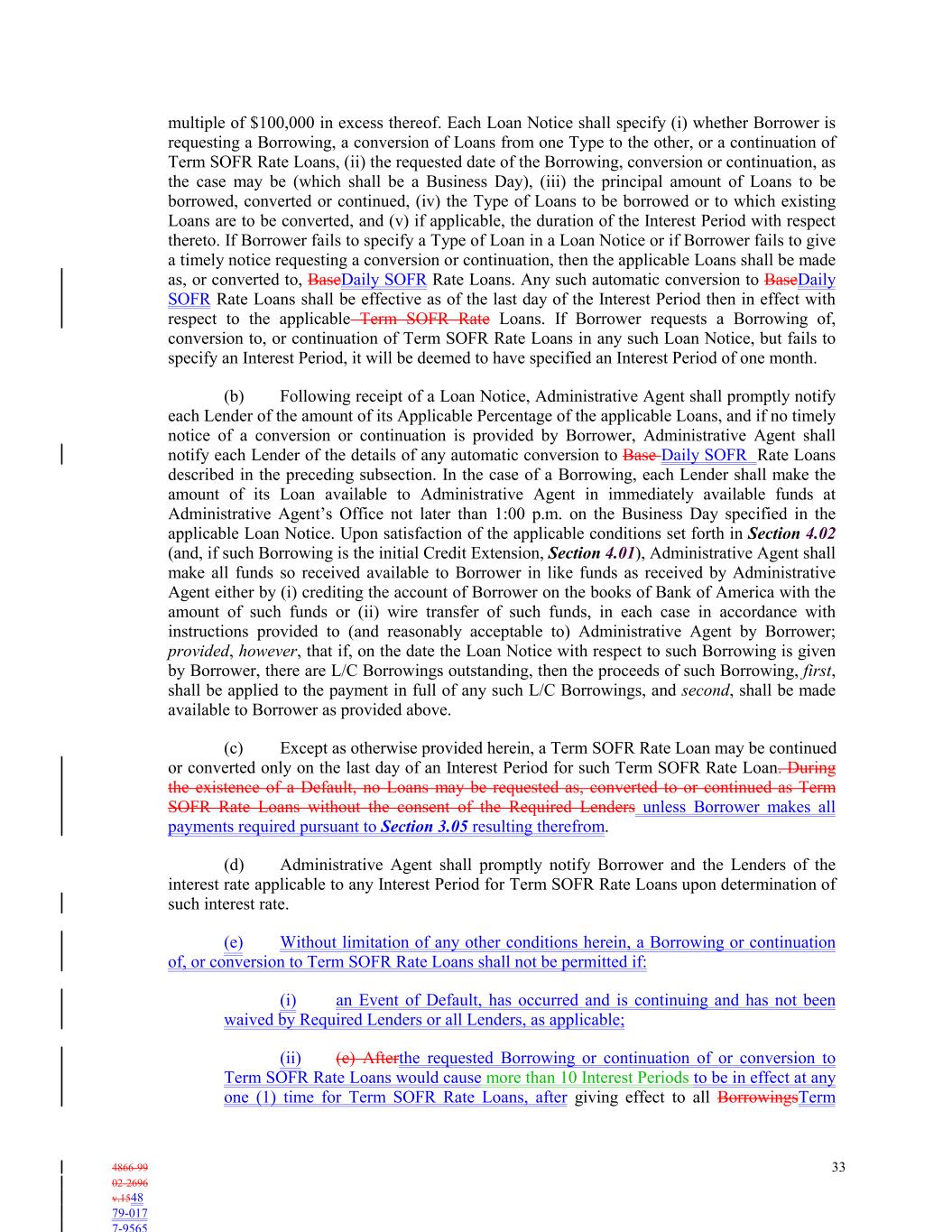 4866-99 02-2696 v.1548 79-017 7-9565 33 multiple of $100,000 in excess thereof. Each Loan Notice shall specify (i) whether Borrower is requesting a Borrowing, a conversion of Loans from one Type to the other, or a continuation of Term SOFR Rate Loans, (ii) the requested date of the Borrowing, conversion or continuation, as the case may be (which shall be a Business Day), (iii) the principal amount of Loans to be borrowed, converted or continued, (iv) the Type of Loans to be borrowed or to which existing Loans are to be converted, and (v) if applicable, the duration of the Interest Period with respect thereto. If Borrower fails to specify a Type of Loan in a Loan Notice or if Borrower fails to give a timely notice requesting a conversion or continuation, then the applicable Loans shall be made as, or converted to, BaseDaily SOFR Rate Loans. Any such automatic conversion to BaseDaily SOFR Rate Loans shall be effective as of the last day of the Interest Period then in effect with respect to the applicable Term SOFR Rate Loans. If Borrower requests a Borrowing of, conversion to, or continuation of Term SOFR Rate Loans in any such Loan Notice, but fails to specify an Interest Period, it will be deemed to have specified an Interest Period of one month. (b) Following receipt of a Loan Notice, Administrative Agent shall promptly notify each Lender of the amount of its Applicable Percentage of the applicable Loans, and if no timely notice of a conversion or continuation is provided by Borrower, Administrative Agent shall notify each Lender of the details of any automatic conversion to Base Daily SOFR Rate Loans described in the preceding subsection. In the case of a Borrowing, each Lender shall make the amount of its Loan available to Administrative Agent in immediately available funds at Administrative Agent’s Office not later than 1:00 p.m. on the Business Day specified in the applicable Loan Notice. Upon satisfaction of the applicable conditions set forth in Section 4.02 (and, if such Borrowing is the initial Credit Extension, Section 4.01), Administrative Agent shall make all funds so received available to Borrower in like funds as received by Administrative Agent either by (i) crediting the account of Borrower on the books of Bank of America with the amount of such funds or (ii) wire transfer of such funds, in each case in accordance with instructions provided to (and reasonably acceptable to) Administrative Agent by Borrower; provided, however, that if, on the date the Loan Notice with respect to such Borrowing is given by Borrower, there are L/C Borrowings outstanding, then the proceeds of such Borrowing, first, shall be applied to the payment in full of any such L/C Borrowings, and second, shall be made available to Borrower as provided above. (c) Except as otherwise provided herein, a Term SOFR Rate Loan may be continued or converted only on the last day of an Interest Period for such Term SOFR Rate Loan. During the existence of a Default, no Loans may be requested as, converted to or continued as Term SOFR Rate Loans without the consent of the Required Lenders unless Borrower makes all payments required pursuant to Section 3.05 resulting therefrom. (d) Administrative Agent shall promptly notify Borrower and the Lenders of the interest rate applicable to any Interest Period for Term SOFR Rate Loans upon determination of such interest rate. (e) Without limitation of any other conditions herein, a Borrowing or continuation of, or conversion to Term SOFR Rate Loans shall not be permitted if: (i) an Event of Default, has occurred and is continuing and has not been waived by Required Lenders or all Lenders, as applicable; (ii) (e) Afterthe requested Borrowing or continuation of or conversion to Term SOFR Rate Loans would cause more than 10 Interest Periods to be in effect at any one (1) time for Term SOFR Rate Loans, after giving effect to all BorrowingsTerm