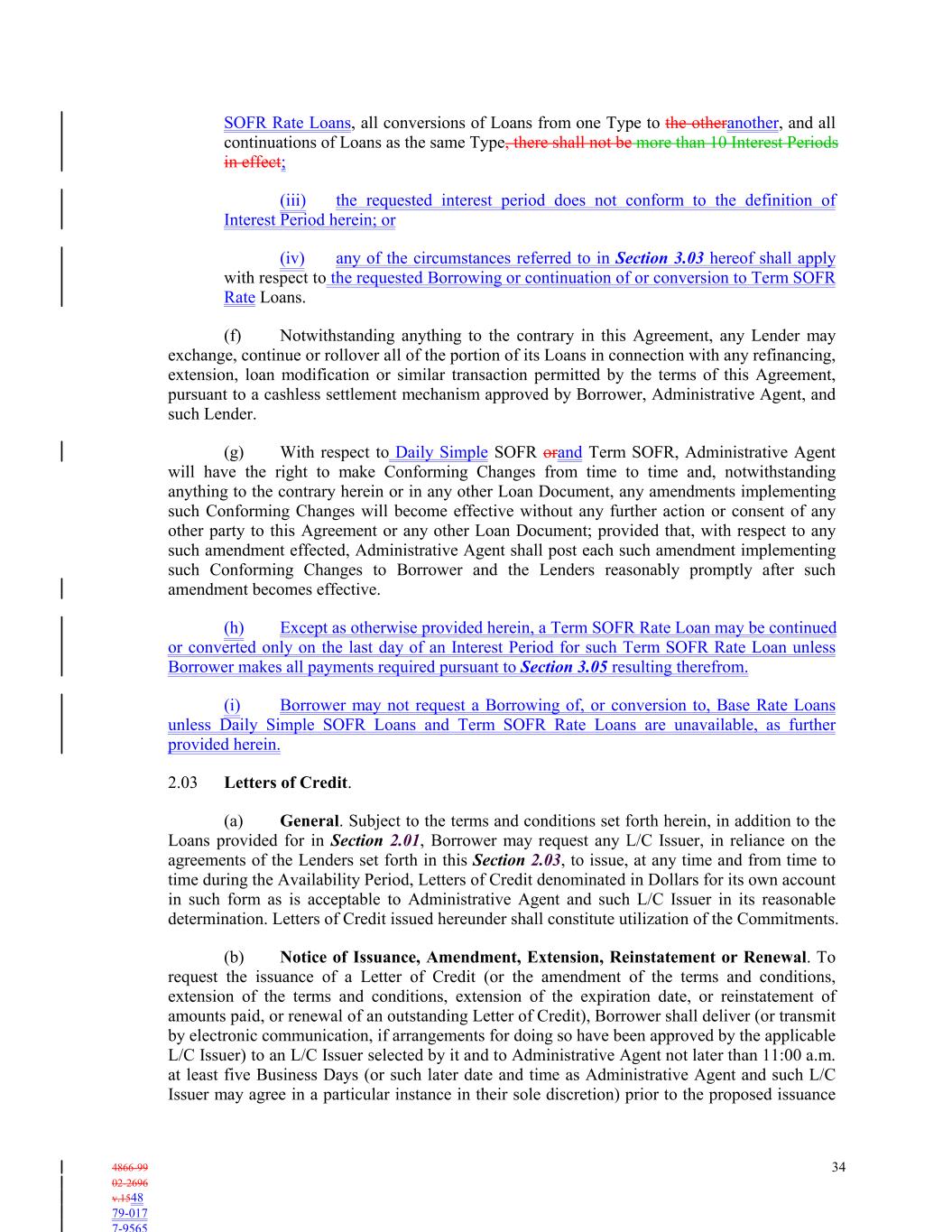 4866-99 02-2696 v.1548 79-017 7-9565 34 SOFR Rate Loans, all conversions of Loans from one Type to the otheranother, and all continuations of Loans as the same Type, there shall not be more than 10 Interest Periods in effect; (iii) the requested interest period does not conform to the definition of Interest Period herein; or (iv) any of the circumstances referred to in Section 3.03 hereof shall apply with respect to the requested Borrowing or continuation of or conversion to Term SOFR Rate Loans. (f) Notwithstanding anything to the contrary in this Agreement, any Lender may exchange, continue or rollover all of the portion of its Loans in connection with any refinancing, extension, loan modification or similar transaction permitted by the terms of this Agreement, pursuant to a cashless settlement mechanism approved by Borrower, Administrative Agent, and such Lender. (g) With respect to Daily Simple SOFR orand Term SOFR, Administrative Agent will have the right to make Conforming Changes from time to time and, notwithstanding anything to the contrary herein or in any other Loan Document, any amendments implementing such Conforming Changes will become effective without any further action or consent of any other party to this Agreement or any other Loan Document; provided that, with respect to any such amendment effected, Administrative Agent shall post each such amendment implementing such Conforming Changes to Borrower and the Lenders reasonably promptly after such amendment becomes effective. (h) Except as otherwise provided herein, a Term SOFR Rate Loan may be continued or converted only on the last day of an Interest Period for such Term SOFR Rate Loan unless Borrower makes all payments required pursuant to Section 3.05 resulting therefrom. (i) Borrower may not request a Borrowing of, or conversion to, Base Rate Loans unless Daily Simple SOFR Loans and Term SOFR Rate Loans are unavailable, as further provided herein. 2.03 Letters of Credit. (a) General. Subject to the terms and conditions set forth herein, in addition to the Loans provided for in Section 2.01, Borrower may request any L/C Issuer, in reliance on the agreements of the Lenders set forth in this Section 2.03, to issue, at any time and from time to time during the Availability Period, Letters of Credit denominated in Dollars for its own account in such form as is acceptable to Administrative Agent and such L/C Issuer in its reasonable determination. Letters of Credit issued hereunder shall constitute utilization of the Commitments. (b) Notice of Issuance, Amendment, Extension, Reinstatement or Renewal. To request the issuance of a Letter of Credit (or the amendment of the terms and conditions, extension of the terms and conditions, extension of the expiration date, or reinstatement of amounts paid, or renewal of an outstanding Letter of Credit), Borrower shall deliver (or transmit by electronic communication, if arrangements for doing so have been approved by the applicable L/C Issuer) to an L/C Issuer selected by it and to Administrative Agent not later than 11:00 a.m. at least five Business Days (or such later date and time as Administrative Agent and such L/C Issuer may agree in a particular instance in their sole discretion) prior to the proposed issuance