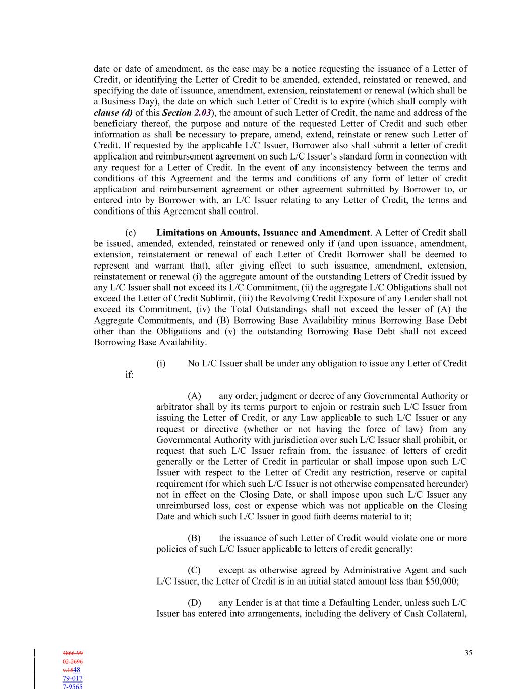 4866-99 02-2696 v.1548 79-017 7-9565 35 date or date of amendment, as the case may be a notice requesting the issuance of a Letter of Credit, or identifying the Letter of Credit to be amended, extended, reinstated or renewed, and specifying the date of issuance, amendment, extension, reinstatement or renewal (which shall be a Business Day), the date on which such Letter of Credit is to expire (which shall comply with clause (d) of this Section 2.03), the amount of such Letter of Credit, the name and address of the beneficiary thereof, the purpose and nature of the requested Letter of Credit and such other information as shall be necessary to prepare, amend, extend, reinstate or renew such Letter of Credit. If requested by the applicable L/C Issuer, Borrower also shall submit a letter of credit application and reimbursement agreement on such L/C Issuer’s standard form in connection with any request for a Letter of Credit. In the event of any inconsistency between the terms and conditions of this Agreement and the terms and conditions of any form of letter of credit application and reimbursement agreement or other agreement submitted by Borrower to, or entered into by Borrower with, an L/C Issuer relating to any Letter of Credit, the terms and conditions of this Agreement shall control. (c) Limitations on Amounts, Issuance and Amendment. A Letter of Credit shall be issued, amended, extended, reinstated or renewed only if (and upon issuance, amendment, extension, reinstatement or renewal of each Letter of Credit Borrower shall be deemed to represent and warrant that), after giving effect to such issuance, amendment, extension, reinstatement or renewal (i) the aggregate amount of the outstanding Letters of Credit issued by any L/C Issuer shall not exceed its L/C Commitment, (ii) the aggregate L/C Obligations shall not exceed the Letter of Credit Sublimit, (iii) the Revolving Credit Exposure of any Lender shall not exceed its Commitment, (iv) the Total Outstandings shall not exceed the lesser of (A) the Aggregate Commitments, and (B) Borrowing Base Availability minus Borrowing Base Debt other than the Obligations and (v) the outstanding Borrowing Base Debt shall not exceed Borrowing Base Availability. (i) No L/C Issuer shall be under any obligation to issue any Letter of Credit if: (A) any order, judgment or decree of any Governmental Authority or arbitrator shall by its terms purport to enjoin or restrain such L/C Issuer from issuing the Letter of Credit, or any Law applicable to such L/C Issuer or any request or directive (whether or not having the force of law) from any Governmental Authority with jurisdiction over such L/C Issuer shall prohibit, or request that such L/C Issuer refrain from, the issuance of letters of credit generally or the Letter of Credit in particular or shall impose upon such L/C Issuer with respect to the Letter of Credit any restriction, reserve or capital requirement (for which such L/C Issuer is not otherwise compensated hereunder) not in effect on the Closing Date, or shall impose upon such L/C Issuer any unreimbursed loss, cost or expense which was not applicable on the Closing Date and which such L/C Issuer in good faith deems material to it; (B) the issuance of such Letter of Credit would violate one or more policies of such L/C Issuer applicable to letters of credit generally; (C) except as otherwise agreed by Administrative Agent and such L/C Issuer, the Letter of Credit is in an initial stated amount less than $50,000; (D) any Lender is at that time a Defaulting Lender, unless such L/C Issuer has entered into arrangements, including the delivery of Cash Collateral,