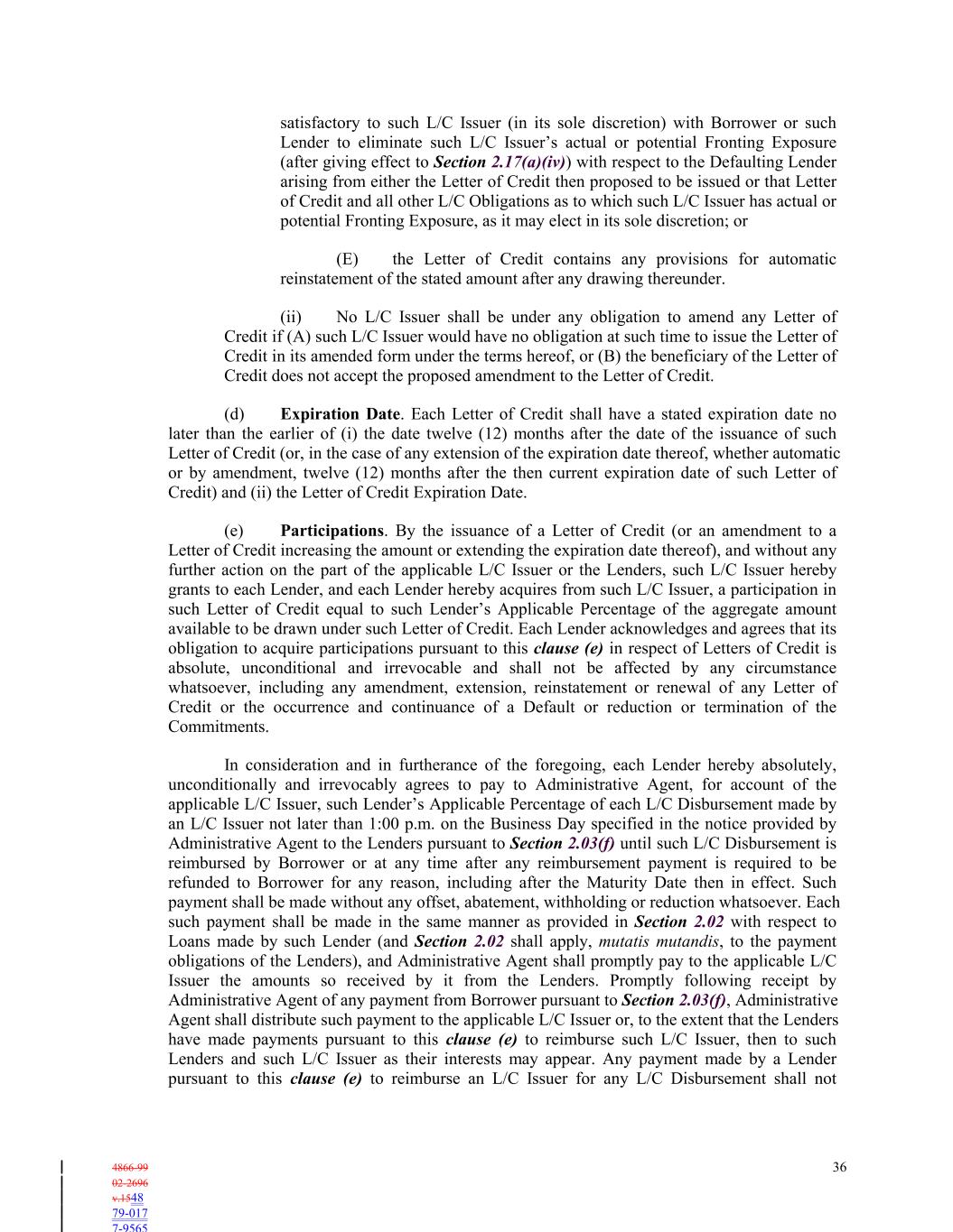 4866-99 02-2696 v.1548 79-017 7-9565 36 satisfactory to such L/C Issuer (in its sole discretion) with Borrower or such Lender to eliminate such L/C Issuer’s actual or potential Fronting Exposure (after giving effect to Section 2.17(a)(iv)) with respect to the Defaulting Lender arising from either the Letter of Credit then proposed to be issued or that Letter of Credit and all other L/C Obligations as to which such L/C Issuer has actual or potential Fronting Exposure, as it may elect in its sole discretion; or (E) the Letter of Credit contains any provisions for automatic reinstatement of the stated amount after any drawing thereunder. (ii) No L/C Issuer shall be under any obligation to amend any Letter of Credit if (A) such L/C Issuer would have no obligation at such time to issue the Letter of Credit in its amended form under the terms hereof, or (B) the beneficiary of the Letter of Credit does not accept the proposed amendment to the Letter of Credit. (d) Expiration Date. Each Letter of Credit shall have a stated expiration date no later than the earlier of (i) the date twelve (12) months after the date of the issuance of such Letter of Credit (or, in the case of any extension of the expiration date thereof, whether automatic or by amendment, twelve (12) months after the then current expiration date of such Letter of Credit) and (ii) the Letter of Credit Expiration Date. (e) Participations. By the issuance of a Letter of Credit (or an amendment to a Letter of Credit increasing the amount or extending the expiration date thereof), and without any further action on the part of the applicable L/C Issuer or the Lenders, such L/C Issuer hereby grants to each Lender, and each Lender hereby acquires from such L/C Issuer, a participation in such Letter of Credit equal to such Lender’s Applicable Percentage of the aggregate amount available to be drawn under such Letter of Credit. Each Lender acknowledges and agrees that its obligation to acquire participations pursuant to this clause (e) in respect of Letters of Credit is absolute, unconditional and irrevocable and shall not be affected by any circumstance whatsoever, including any amendment, extension, reinstatement or renewal of any Letter of Credit or the occurrence and continuance of a Default or reduction or termination of the Commitments. In consideration and in furtherance of the foregoing, each Lender hereby absolutely, unconditionally and irrevocably agrees to pay to Administrative Agent, for account of the applicable L/C Issuer, such Lender’s Applicable Percentage of each L/C Disbursement made by an L/C Issuer not later than 1:00 p.m. on the Business Day specified in the notice provided by Administrative Agent to the Lenders pursuant to Section 2.03(f) until such L/C Disbursement is reimbursed by Borrower or at any time after any reimbursement payment is required to be refunded to Borrower for any reason, including after the Maturity Date then in effect. Such payment shall be made without any offset, abatement, withholding or reduction whatsoever. Each such payment shall be made in the same manner as provided in Section 2.02 with respect to Loans made by such Lender (and Section 2.02 shall apply, mutatis mutandis, to the payment obligations of the Lenders), and Administrative Agent shall promptly pay to the applicable L/C Issuer the amounts so received by it from the Lenders. Promptly following receipt by Administrative Agent of any payment from Borrower pursuant to Section 2.03(f), Administrative Agent shall distribute such payment to the applicable L/C Issuer or, to the extent that the Lenders have made payments pursuant to this clause (e) to reimburse such L/C Issuer, then to such Lenders and such L/C Issuer as their interests may appear. Any payment made by a Lender pursuant to this clause (e) to reimburse an L/C Issuer for any L/C Disbursement shall not