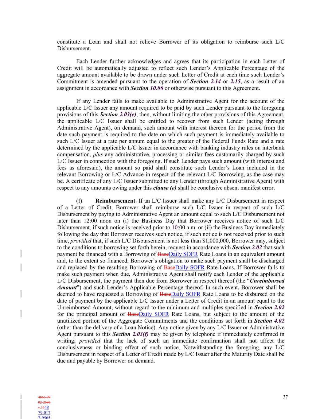 4866-99 02-2696 v.1548 79-017 7-9565 37 constitute a Loan and shall not relieve Borrower of its obligation to reimburse such L/C Disbursement. Each Lender further acknowledges and agrees that its participation in each Letter of Credit will be automatically adjusted to reflect such Lender’s Applicable Percentage of the aggregate amount available to be drawn under such Letter of Credit at each time such Lender’s Commitment is amended pursuant to the operation of Section 2.14 or 2.15, as a result of an assignment in accordance with Section 10.06 or otherwise pursuant to this Agreement. If any Lender fails to make available to Administrative Agent for the account of the applicable L/C Issuer any amount required to be paid by such Lender pursuant to the foregoing provisions of this Section 2.03(e), then, without limiting the other provisions of this Agreement, the applicable L/C Issuer shall be entitled to recover from such Lender (acting through Administrative Agent), on demand, such amount with interest thereon for the period from the date such payment is required to the date on which such payment is immediately available to such L/C Issuer at a rate per annum equal to the greater of the Federal Funds Rate and a rate determined by the applicable L/C Issuer in accordance with banking industry rules on interbank compensation, plus any administrative, processing or similar fees customarily charged by such L/C Issuer in connection with the foregoing. If such Lender pays such amount (with interest and fees as aforesaid), the amount so paid shall constitute such Lender’s Loan included in the relevant Borrowing or L/C Advance in respect of the relevant L/C Borrowing, as the case may be. A certificate of any L/C Issuer submitted to any Lender (through Administrative Agent) with respect to any amounts owing under this clause (e) shall be conclusive absent manifest error. (f) Reimbursement. If an L/C Issuer shall make any L/C Disbursement in respect of a Letter of Credit, Borrower shall reimburse such L/C Issuer in respect of such L/C Disbursement by paying to Administrative Agent an amount equal to such L/C Disbursement not later than 12:00 noon on (i) the Business Day that Borrower receives notice of such L/C Disbursement, if such notice is received prior to 10:00 a.m. or (ii) the Business Day immediately following the day that Borrower receives such notice, if such notice is not received prior to such time, provided that, if such L/C Disbursement is not less than $1,000,000, Borrower may, subject to the conditions to borrowing set forth herein, request in accordance with Section 2.02 that such payment be financed with a Borrowing of BaseDaily SOFR Rate Loans in an equivalent amount and, to the extent so financed, Borrower’s obligation to make such payment shall be discharged and replaced by the resulting Borrowing of BaseDaily SOFR Rate Loans. If Borrower fails to make such payment when due, Administrative Agent shall notify each Lender of the applicable L/C Disbursement, the payment then due from Borrower in respect thereof (the “Unreimbursed Amount”) and such Lender’s Applicable Percentage thereof. In such event, Borrower shall be deemed to have requested a Borrowing of BaseDaily SOFR Rate Loans to be disbursed on the date of payment by the applicable L/C Issuer under a Letter of Credit in an amount equal to the Unreimbursed Amount, without regard to the minimum and multiples specified in Section 2.02 for the principal amount of BaseDaily SOFR Rate Loans, but subject to the amount of the unutilized portion of the Aggregate Commitments and the conditions set forth in Section 4.02 (other than the delivery of a Loan Notice). Any notice given by any L/C Issuer or Administrative Agent pursuant to this Section 2.03(f) may be given by telephone if immediately confirmed in writing; provided that the lack of such an immediate confirmation shall not affect the conclusiveness or binding effect of such notice. Notwithstanding the foregoing, any L/C Disbursement in respect of a Letter of Credit made by L/C Issuer after the Maturity Date shall be due and payable by Borrower on demand.