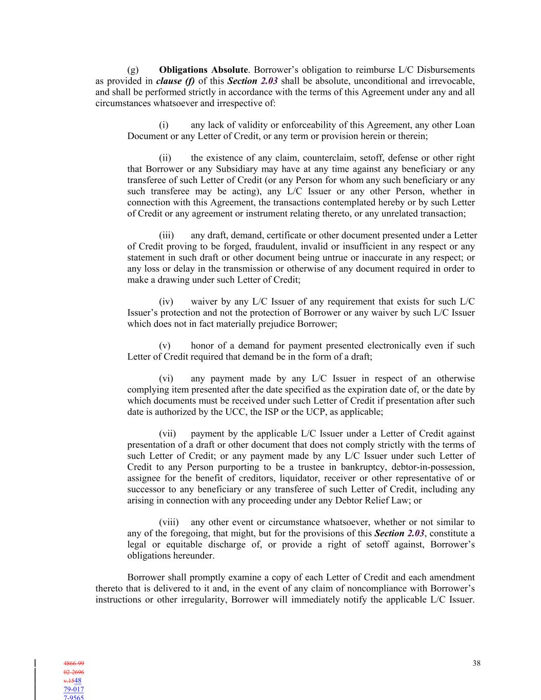 4866-99 02-2696 v.1548 79-017 7-9565 38 (g) Obligations Absolute. Borrower’s obligation to reimburse L/C Disbursements as provided in clause (f) of this Section 2.03 shall be absolute, unconditional and irrevocable, and shall be performed strictly in accordance with the terms of this Agreement under any and all circumstances whatsoever and irrespective of: (i) any lack of validity or enforceability of this Agreement, any other Loan Document or any Letter of Credit, or any term or provision herein or therein; (ii) the existence of any claim, counterclaim, setoff, defense or other right that Borrower or any Subsidiary may have at any time against any beneficiary or any transferee of such Letter of Credit (or any Person for whom any such beneficiary or any such transferee may be acting), any L/C Issuer or any other Person, whether in connection with this Agreement, the transactions contemplated hereby or by such Letter of Credit or any agreement or instrument relating thereto, or any unrelated transaction; (iii) any draft, demand, certificate or other document presented under a Letter of Credit proving to be forged, fraudulent, invalid or insufficient in any respect or any statement in such draft or other document being untrue or inaccurate in any respect; or any loss or delay in the transmission or otherwise of any document required in order to make a drawing under such Letter of Credit; (iv) waiver by any L/C Issuer of any requirement that exists for such L/C Issuer’s protection and not the protection of Borrower or any waiver by such L/C Issuer which does not in fact materially prejudice Borrower; (v) honor of a demand for payment presented electronically even if such Letter of Credit required that demand be in the form of a draft; (vi) any payment made by any L/C Issuer in respect of an otherwise complying item presented after the date specified as the expiration date of, or the date by which documents must be received under such Letter of Credit if presentation after such date is authorized by the UCC, the ISP or the UCP, as applicable; (vii) payment by the applicable L/C Issuer under a Letter of Credit against presentation of a draft or other document that does not comply strictly with the terms of such Letter of Credit; or any payment made by any L/C Issuer under such Letter of Credit to any Person purporting to be a trustee in bankruptcy, debtor-in-possession, assignee for the benefit of creditors, liquidator, receiver or other representative of or successor to any beneficiary or any transferee of such Letter of Credit, including any arising in connection with any proceeding under any Debtor Relief Law; or (viii) any other event or circumstance whatsoever, whether or not similar to any of the foregoing, that might, but for the provisions of this Section 2.03, constitute a legal or equitable discharge of, or provide a right of setoff against, Borrower’s obligations hereunder. Borrower shall promptly examine a copy of each Letter of Credit and each amendment thereto that is delivered to it and, in the event of any claim of noncompliance with Borrower’s instructions or other irregularity, Borrower will immediately notify the applicable L/C Issuer.