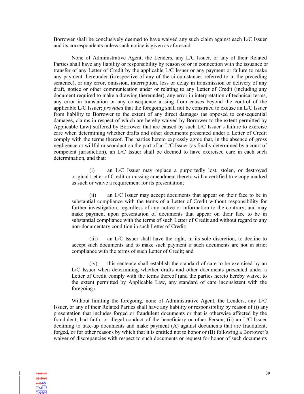 4866-99 02-2696 v.1548 79-017 7-9565 39 Borrower shall be conclusively deemed to have waived any such claim against each L/C Issuer and its correspondents unless such notice is given as aforesaid. None of Administrative Agent, the Lenders, any L/C Issuer, or any of their Related Parties shall have any liability or responsibility by reason of or in connection with the issuance or transfer of any Letter of Credit by the applicable L/C Issuer or any payment or failure to make any payment thereunder (irrespective of any of the circumstances referred to in the preceding sentence), or any error, omission, interruption, loss or delay in transmission or delivery of any draft, notice or other communication under or relating to any Letter of Credit (including any document required to make a drawing thereunder), any error in interpretation of technical terms, any error in translation or any consequence arising from causes beyond the control of the applicable L/C Issuer; provided that the foregoing shall not be construed to excuse an L/C Issuer from liability to Borrower to the extent of any direct damages (as opposed to consequential damages, claims in respect of which are hereby waived by Borrower to the extent permitted by Applicable Law) suffered by Borrower that are caused by such L/C Issuer’s failure to exercise care when determining whether drafts and other documents presented under a Letter of Credit comply with the terms thereof. The parties hereto expressly agree that, in the absence of gross negligence or willful misconduct on the part of an L/C Issuer (as finally determined by a court of competent jurisdiction), an L/C Issuer shall be deemed to have exercised care in each such determination, and that: (i) an L/C Issuer may replace a purportedly lost, stolen, or destroyed original Letter of Credit or missing amendment thereto with a certified true copy marked as such or waive a requirement for its presentation; (ii) an L/C Issuer may accept documents that appear on their face to be in substantial compliance with the terms of a Letter of Credit without responsibility for further investigation, regardless of any notice or information to the contrary, and may make payment upon presentation of documents that appear on their face to be in substantial compliance with the terms of such Letter of Credit and without regard to any non-documentary condition in such Letter of Credit; (iii) an L/C Issuer shall have the right, in its sole discretion, to decline to accept such documents and to make such payment if such documents are not in strict compliance with the terms of such Letter of Credit; and (iv) this sentence shall establish the standard of care to be exercised by an L/C Issuer when determining whether drafts and other documents presented under a Letter of Credit comply with the terms thereof (and the parties hereto hereby waive, to the extent permitted by Applicable Law, any standard of care inconsistent with the foregoing). Without limiting the foregoing, none of Administrative Agent, the Lenders, any L/C Issuer, or any of their Related Parties shall have any liability or responsibility by reason of (i) any presentation that includes forged or fraudulent documents or that is otherwise affected by the fraudulent, bad faith, or illegal conduct of the beneficiary or other Person, (ii) an L/C Issuer declining to take-up documents and make payment (A) against documents that are fraudulent, forged, or for other reasons by which that it is entitled not to honor or (B) following a Borrower’s waiver of discrepancies with respect to such documents or request for honor of such documents