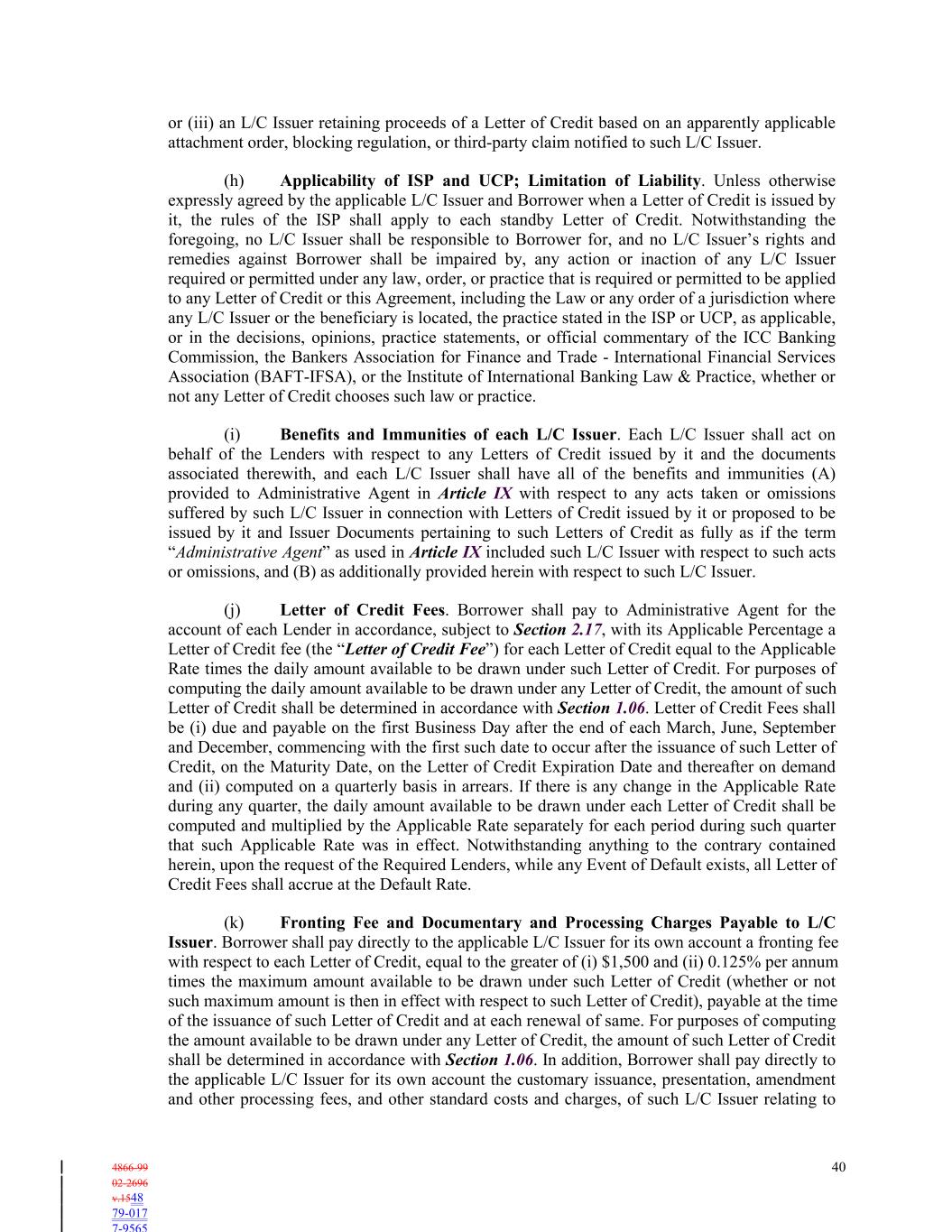 4866-99 02-2696 v.1548 79-017 7-9565 40 or (iii) an L/C Issuer retaining proceeds of a Letter of Credit based on an apparently applicable attachment order, blocking regulation, or third-party claim notified to such L/C Issuer. (h) Applicability of ISP and UCP; Limitation of Liability. Unless otherwise expressly agreed by the applicable L/C Issuer and Borrower when a Letter of Credit is issued by it, the rules of the ISP shall apply to each standby Letter of Credit. Notwithstanding the foregoing, no L/C Issuer shall be responsible to Borrower for, and no L/C Issuer’s rights and remedies against Borrower shall be impaired by, any action or inaction of any L/C Issuer required or permitted under any law, order, or practice that is required or permitted to be applied to any Letter of Credit or this Agreement, including the Law or any order of a jurisdiction where any L/C Issuer or the beneficiary is located, the practice stated in the ISP or UCP, as applicable, or in the decisions, opinions, practice statements, or official commentary of the ICC Banking Commission, the Bankers Association for Finance and Trade - International Financial Services Association (BAFT-IFSA), or the Institute of International Banking Law & Practice, whether or not any Letter of Credit chooses such law or practice. (i) Benefits and Immunities of each L/C Issuer. Each L/C Issuer shall act on behalf of the Lenders with respect to any Letters of Credit issued by it and the documents associated therewith, and each L/C Issuer shall have all of the benefits and immunities (A) provided to Administrative Agent in Article IX with respect to any acts taken or omissions suffered by such L/C Issuer in connection with Letters of Credit issued by it or proposed to be issued by it and Issuer Documents pertaining to such Letters of Credit as fully as if the term “Administrative Agent” as used in Article IX included such L/C Issuer with respect to such acts or omissions, and (B) as additionally provided herein with respect to such L/C Issuer. (j) Letter of Credit Fees. Borrower shall pay to Administrative Agent for the account of each Lender in accordance, subject to Section 2.17, with its Applicable Percentage a Letter of Credit fee (the “Letter of Credit Fee”) for each Letter of Credit equal to the Applicable Rate times the daily amount available to be drawn under such Letter of Credit. For purposes of computing the daily amount available to be drawn under any Letter of Credit, the amount of such Letter of Credit shall be determined in accordance with Section 1.06. Letter of Credit Fees shall be (i) due and payable on the first Business Day after the end of each March, June, September and December, commencing with the first such date to occur after the issuance of such Letter of Credit, on the Maturity Date, on the Letter of Credit Expiration Date and thereafter on demand and (ii) computed on a quarterly basis in arrears. If there is any change in the Applicable Rate during any quarter, the daily amount available to be drawn under each Letter of Credit shall be computed and multiplied by the Applicable Rate separately for each period during such quarter that such Applicable Rate was in effect. Notwithstanding anything to the contrary contained herein, upon the request of the Required Lenders, while any Event of Default exists, all Letter of Credit Fees shall accrue at the Default Rate. (k) Fronting Fee and Documentary and Processing Charges Payable to L/C Issuer. Borrower shall pay directly to the applicable L/C Issuer for its own account a fronting fee with respect to each Letter of Credit, equal to the greater of (i) $1,500 and (ii) 0.125% per annum times the maximum amount available to be drawn under such Letter of Credit (whether or not such maximum amount is then in effect with respect to such Letter of Credit), payable at the time of the issuance of such Letter of Credit and at each renewal of same. For purposes of computing the amount available to be drawn under any Letter of Credit, the amount of such Letter of Credit shall be determined in accordance with Section 1.06. In addition, Borrower shall pay directly to the applicable L/C Issuer for its own account the customary issuance, presentation, amendment and other processing fees, and other standard costs and charges, of such L/C Issuer relating to