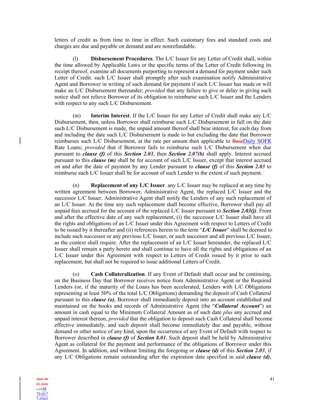 4866-99 02-2696 v.1548 79-017 7-9565 41 letters of credit as from time to time in effect. Such customary fees and standard costs and charges are due and payable on demand and are nonrefundable. (l) Disbursement Procedures. The L/C Issuer for any Letter of Credit shall, within the time allowed by Applicable Laws or the specific terms of the Letter of Credit following its receipt thereof, examine all documents purporting to represent a demand for payment under such Letter of Credit. such L/C Issuer shall promptly after such examination notify Administrative Agent and Borrower in writing of such demand for payment if such L/C Issuer has made or will make an L/C Disbursement thereunder; provided that any failure to give or delay in giving such notice shall not relieve Borrower of its obligation to reimburse such L/C Issuer and the Lenders with respect to any such L/C Disbursement. (m) Interim Interest. If the L/C Issuer for any Letter of Credit shall make any L/C Disbursement, then, unless Borrower shall reimburse such L/C Disbursement in full on the date such L/C Disbursement is made, the unpaid amount thereof shall bear interest, for each day from and including the date such L/C Disbursement is made to but excluding the date that Borrower reimburses such L/C Disbursement, at the rate per annum then applicable to BaseDaily SOFR Rate Loans; provided that if Borrower fails to reimburse such L/C Disbursement when due pursuant to clause (f) of this Section 2.03, then Section 2.07(b) shall apply. Interest accrued pursuant to this clause (m) shall be for account of such L/C Issuer, except that interest accrued on and after the date of payment by any Lender pursuant to clause (f) of this Section 2.03 to reimburse such L/C Issuer shall be for account of such Lender to the extent of such payment. (n) Replacement of any L/C Issuer. any L/C Issuer may be replaced at any time by written agreement between Borrower, Administrative Agent, the replaced L/C Issuer and the successor L/C Issuer. Administrative Agent shall notify the Lenders of any such replacement of an L/C Issuer. At the time any such replacement shall become effective, Borrower shall pay all unpaid fees accrued for the account of the replaced L/C Issuer pursuant to Section 2.03(j). From and after the effective date of any such replacement, (i) the successor L/C Issuer shall have all the rights and obligations of an L/C Issuer under this Agreement with respect to Letters of Credit to be issued by it thereafter and (ii) references herein to the term “L/C Issuer” shall be deemed to include such successor or any previous L/C Issuer, or such successor and all previous L/C Issuer, as the context shall require. After the replacement of an L/C Issuer hereunder, the replaced L/C Issuer shall remain a party hereto and shall continue to have all the rights and obligations of an L/C Issuer under this Agreement with respect to Letters of Credit issued by it prior to such replacement, but shall not be required to issue additional Letters of Credit. (o) Cash Collateralization. If any Event of Default shall occur and be continuing, on the Business Day that Borrower receives notice from Administrative Agent or the Required Lenders (or, if the maturity of the Loans has been accelerated, Lenders with L/C Obligations representing at least 50% of the total L/C Obligations) demanding the deposit of Cash Collateral pursuant to this clause (o), Borrower shall immediately deposit into an account established and maintained on the books and records of Administrative Agent (the “Collateral Account”) an amount in cash equal to the Minimum Collateral Amount as of such date plus any accrued and unpaid interest thereon, provided that the obligation to deposit such Cash Collateral shall become effective immediately, and such deposit shall become immediately due and payable, without demand or other notice of any kind, upon the occurrence of any Event of Default with respect to Borrower described in clause (f) of Section 8.01. Such deposit shall be held by Administrative Agent as collateral for the payment and performance of the obligations of Borrower under this Agreement. In addition, and without limiting the foregoing or clause (d) of this Section 2.03, if any L/C Obligations remain outstanding after the expiration date specified in said clause (d),