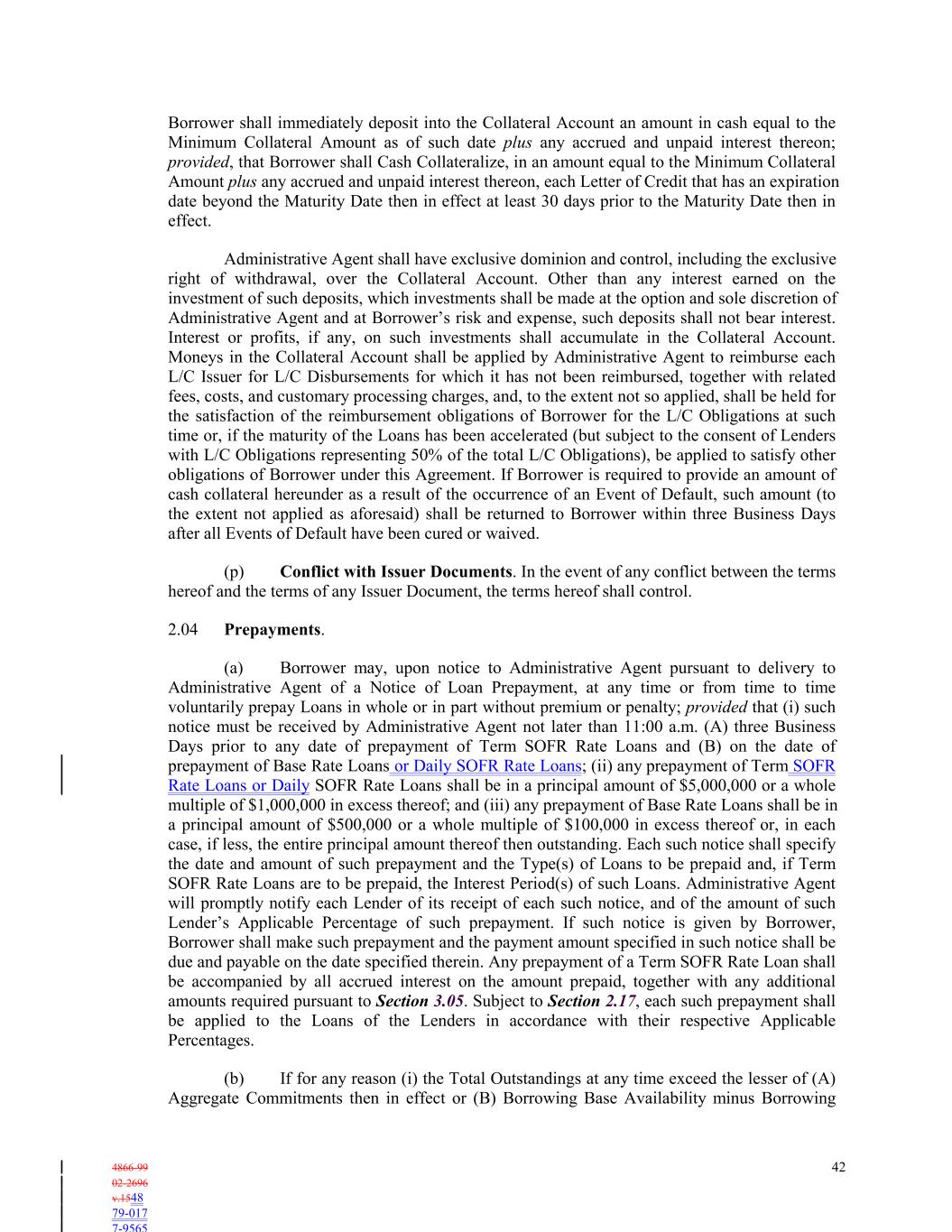 4866-99 02-2696 v.1548 79-017 7-9565 42 Borrower shall immediately deposit into the Collateral Account an amount in cash equal to the Minimum Collateral Amount as of such date plus any accrued and unpaid interest thereon; provided, that Borrower shall Cash Collateralize, in an amount equal to the Minimum Collateral Amount plus any accrued and unpaid interest thereon, each Letter of Credit that has an expiration date beyond the Maturity Date then in effect at least 30 days prior to the Maturity Date then in effect. Administrative Agent shall have exclusive dominion and control, including the exclusive right of withdrawal, over the Collateral Account. Other than any interest earned on the investment of such deposits, which investments shall be made at the option and sole discretion of Administrative Agent and at Borrower’s risk and expense, such deposits shall not bear interest. Interest or profits, if any, on such investments shall accumulate in the Collateral Account. Moneys in the Collateral Account shall be applied by Administrative Agent to reimburse each L/C Issuer for L/C Disbursements for which it has not been reimbursed, together with related fees, costs, and customary processing charges, and, to the extent not so applied, shall be held for the satisfaction of the reimbursement obligations of Borrower for the L/C Obligations at such time or, if the maturity of the Loans has been accelerated (but subject to the consent of Lenders with L/C Obligations representing 50% of the total L/C Obligations), be applied to satisfy other obligations of Borrower under this Agreement. If Borrower is required to provide an amount of cash collateral hereunder as a result of the occurrence of an Event of Default, such amount (to the extent not applied as aforesaid) shall be returned to Borrower within three Business Days after all Events of Default have been cured or waived. (p) Conflict with Issuer Documents. In the event of any conflict between the terms hereof and the terms of any Issuer Document, the terms hereof shall control. 2.04 Prepayments. (a) Borrower may, upon notice to Administrative Agent pursuant to delivery to Administrative Agent of a Notice of Loan Prepayment, at any time or from time to time voluntarily prepay Loans in whole or in part without premium or penalty; provided that (i) such notice must be received by Administrative Agent not later than 11:00 a.m. (A) three Business Days prior to any date of prepayment of Term SOFR Rate Loans and (B) on the date of prepayment of Base Rate Loans or Daily SOFR Rate Loans; (ii) any prepayment of Term SOFR Rate Loans or Daily SOFR Rate Loans shall be in a principal amount of $5,000,000 or a whole multiple of $1,000,000 in excess thereof; and (iii) any prepayment of Base Rate Loans shall be in a principal amount of $500,000 or a whole multiple of $100,000 in excess thereof or, in each case, if less, the entire principal amount thereof then outstanding. Each such notice shall specify the date and amount of such prepayment and the Type(s) of Loans to be prepaid and, if Term SOFR Rate Loans are to be prepaid, the Interest Period(s) of such Loans. Administrative Agent will promptly notify each Lender of its receipt of each such notice, and of the amount of such Lender’s Applicable Percentage of such prepayment. If such notice is given by Borrower, Borrower shall make such prepayment and the payment amount specified in such notice shall be due and payable on the date specified therein. Any prepayment of a Term SOFR Rate Loan shall be accompanied by all accrued interest on the amount prepaid, together with any additional amounts required pursuant to Section 3.05. Subject to Section 2.17, each such prepayment shall be applied to the Loans of the Lenders in accordance with their respective Applicable Percentages. (b) If for any reason (i) the Total Outstandings at any time exceed the lesser of (A) Aggregate Commitments then in effect or (B) Borrowing Base Availability minus Borrowing